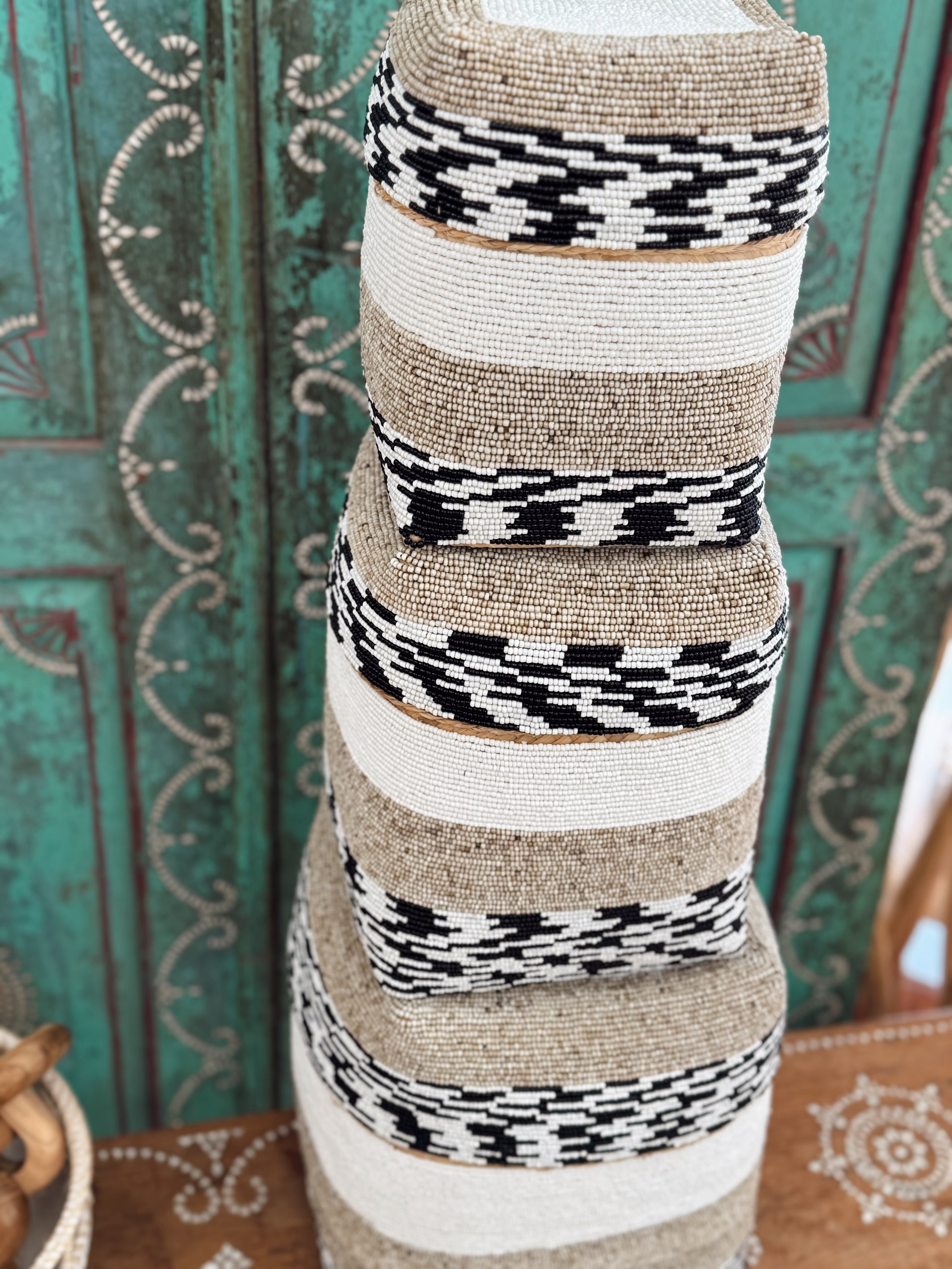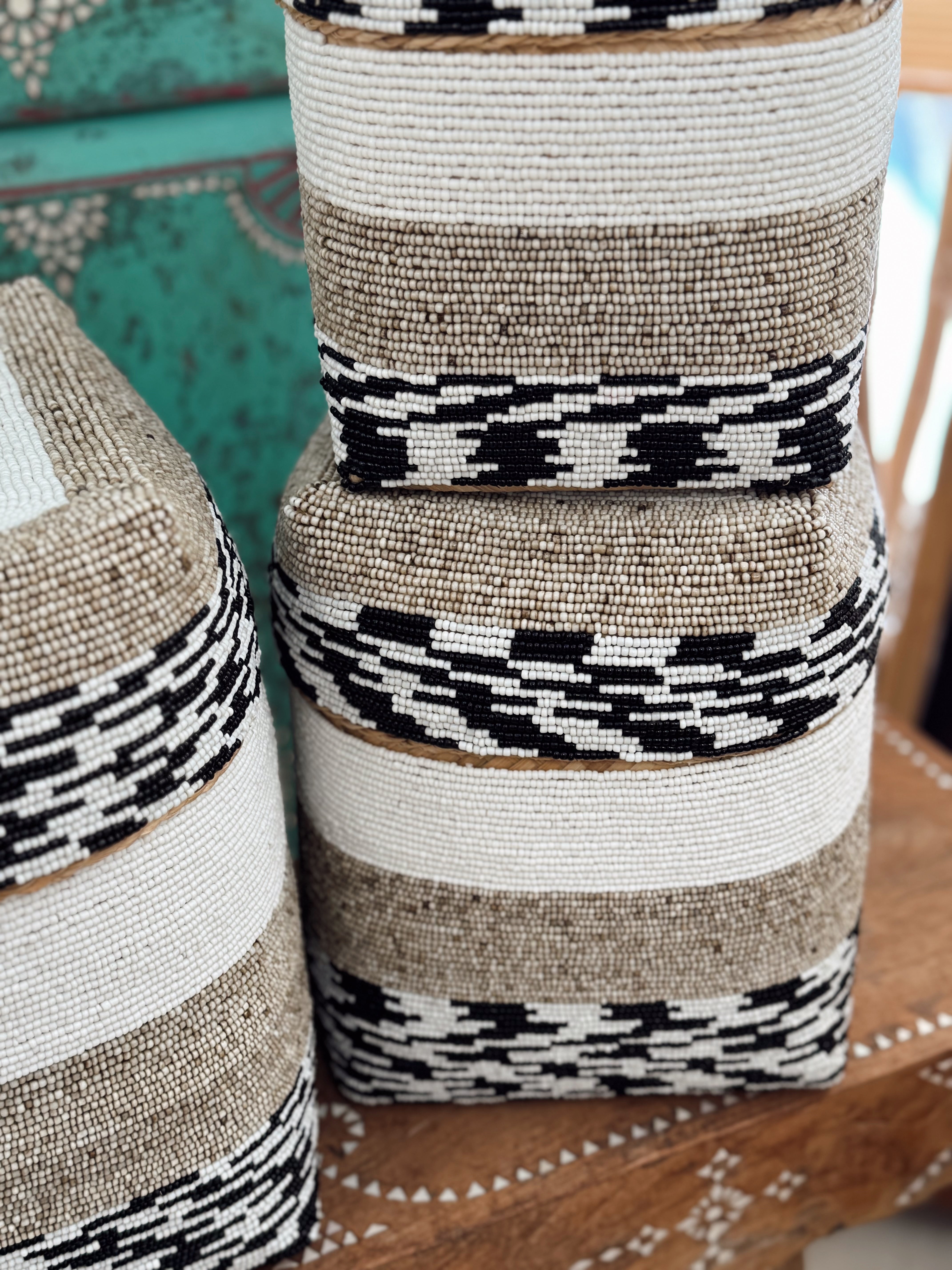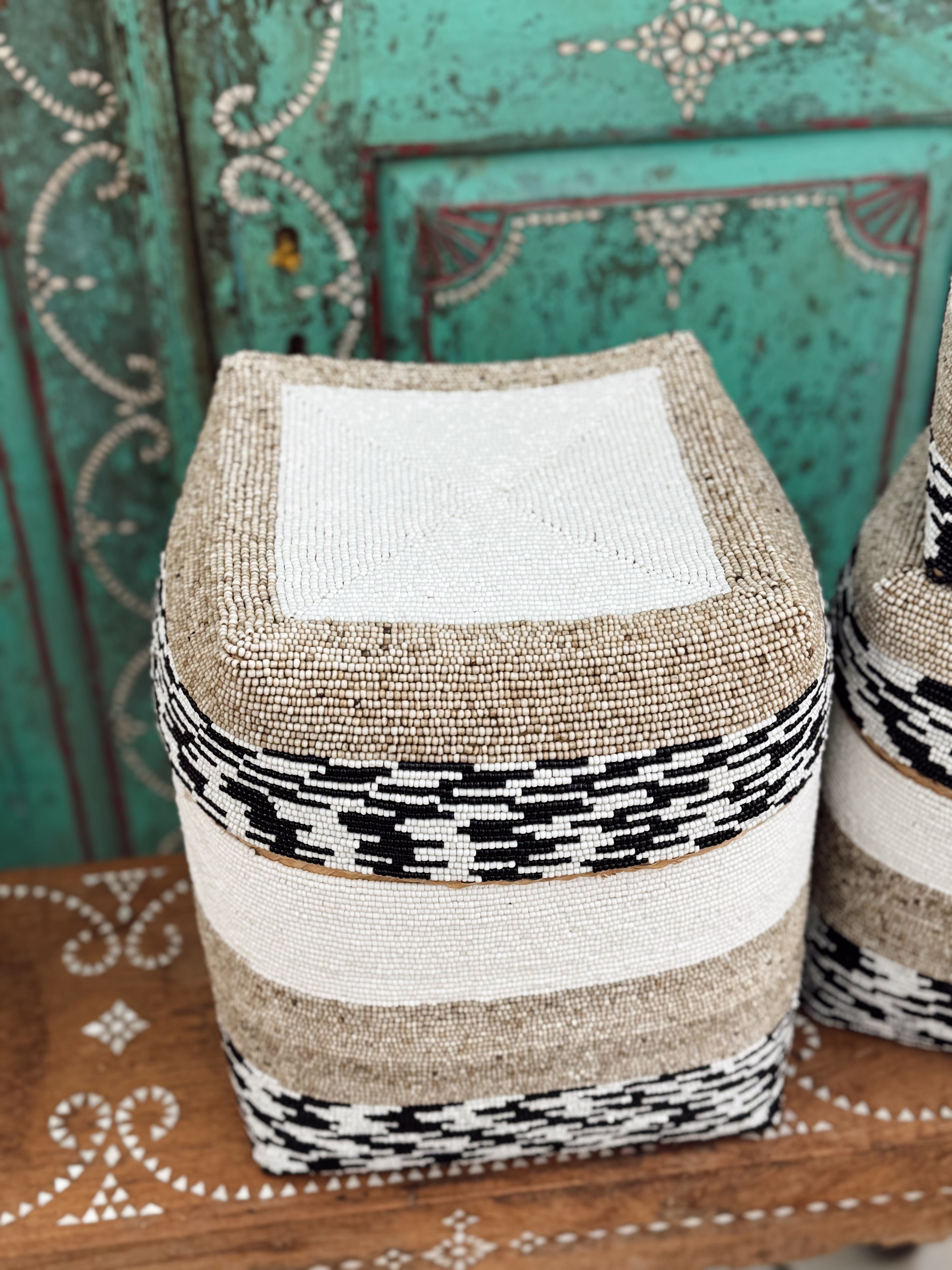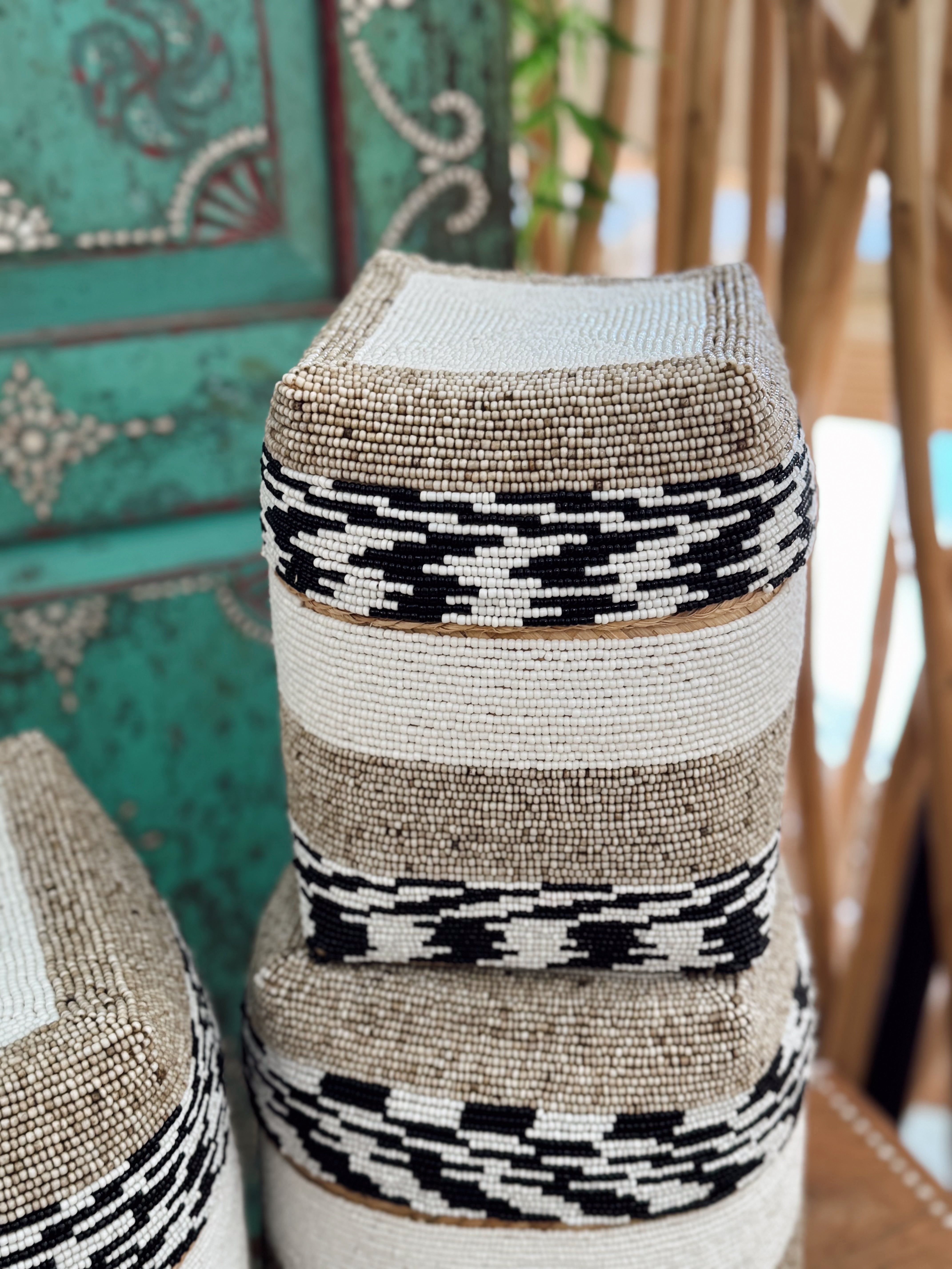 Ligne graphique, forme rectangulaire singulière et perlage subtil... Cette boîte de rangement en perles tisse le lien entre élégance artisanale et style contemporain. Parfaite pour structurer un intérieur tout en y ajoutant une touche précieuse, elle s’intègre aussi bien dans une chambre, un salon qu’un bureau.