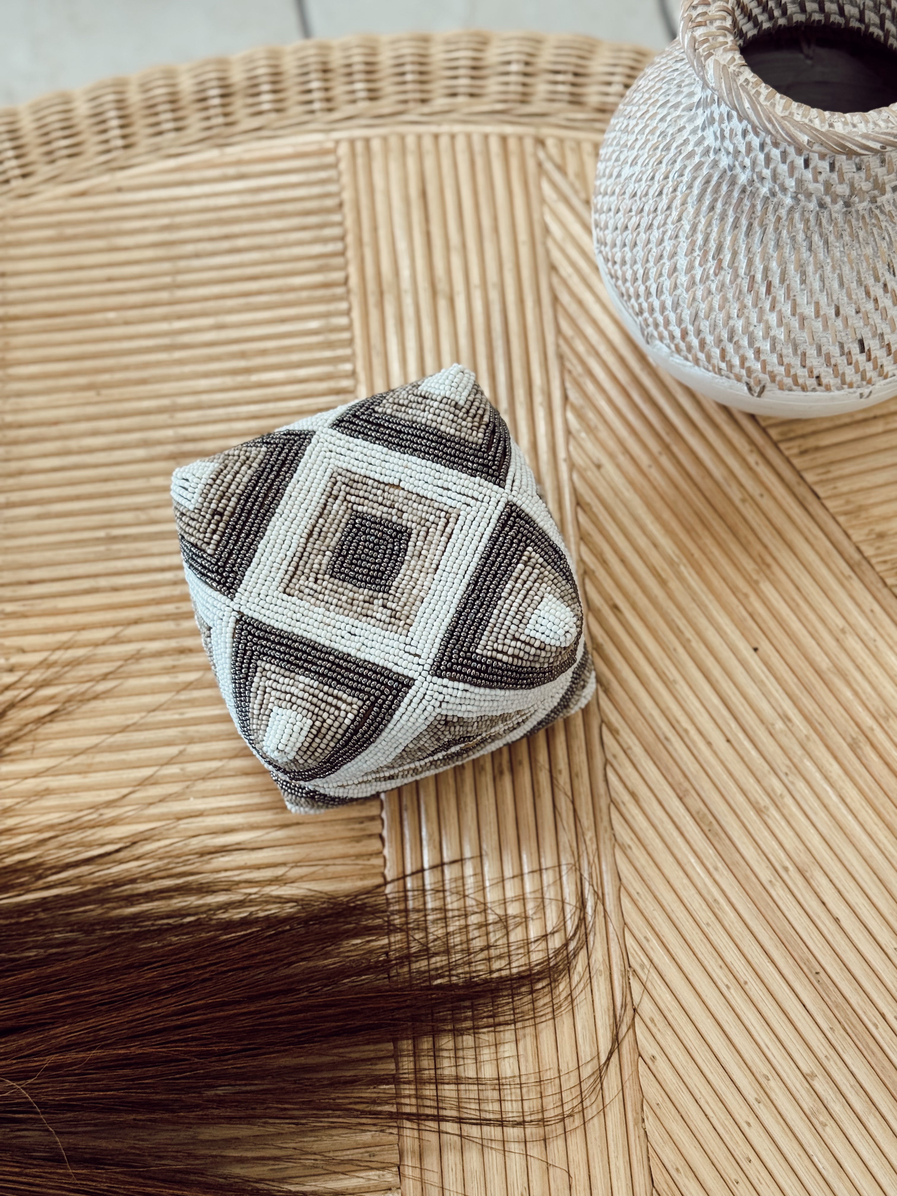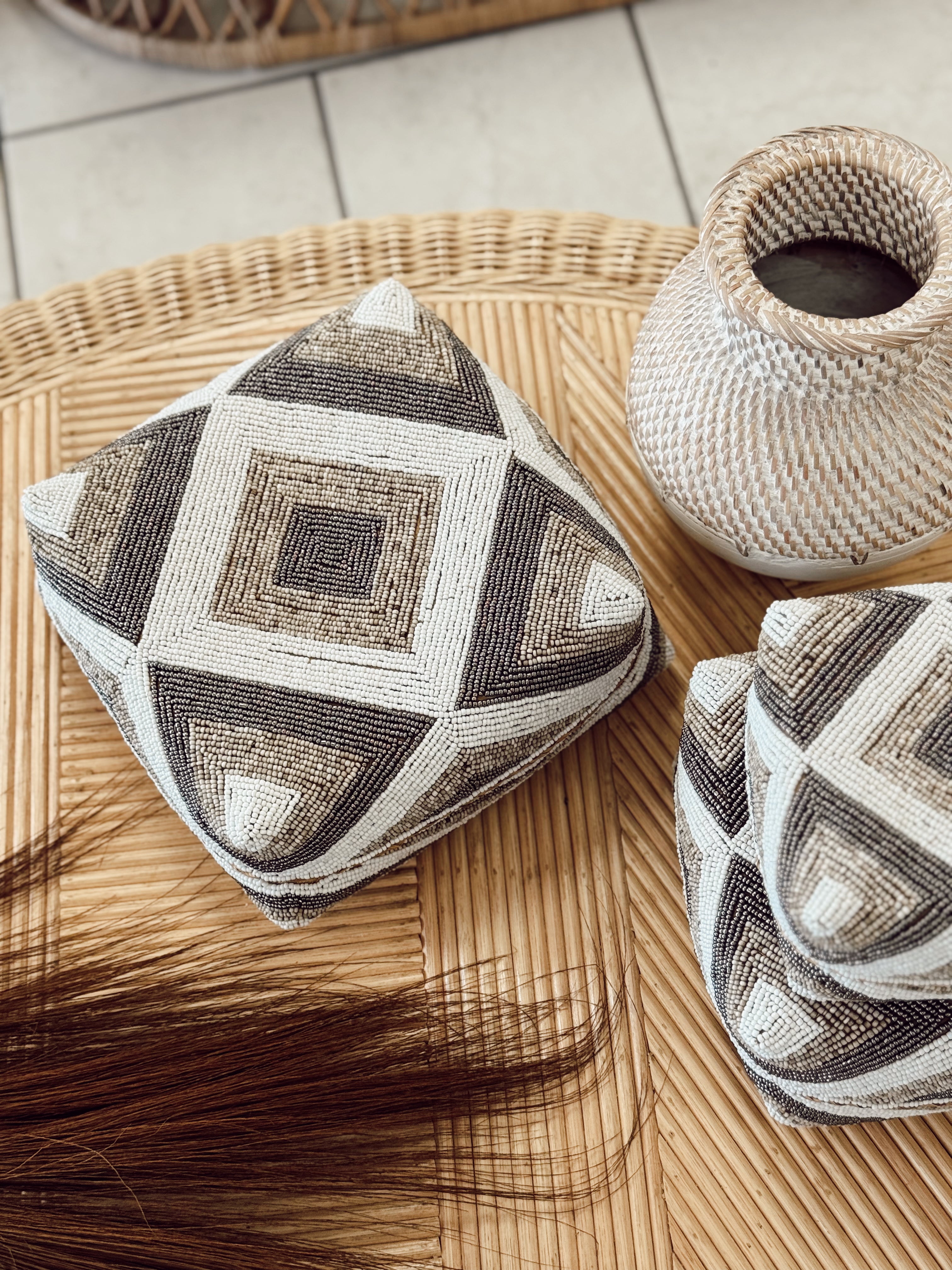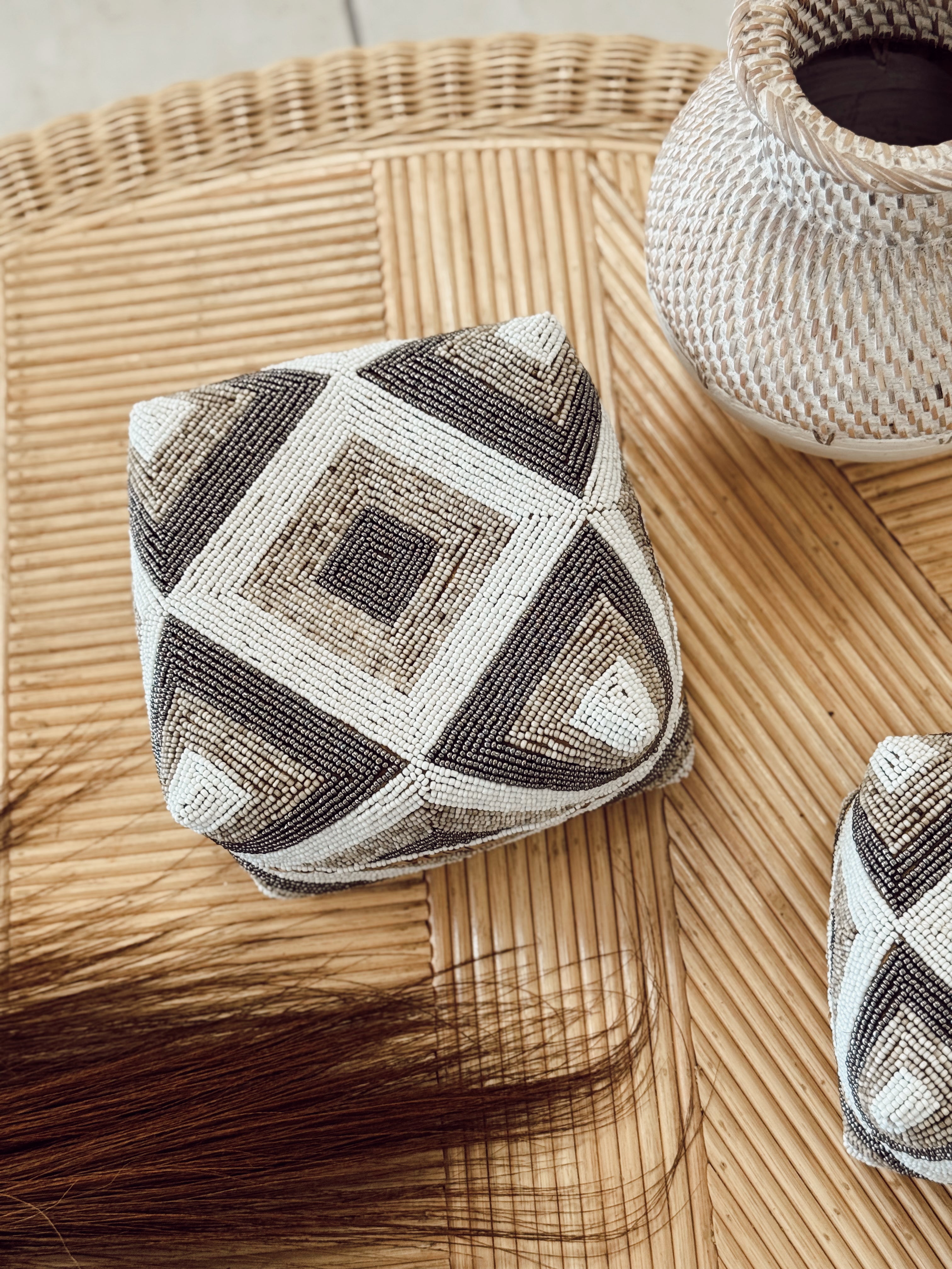 Ajoutez une touche artisanale et graphique à votre intérieur avec ces boîtes décoratives perlées entièrement faites à la main. Chaque pièce est brodée de perles aux motifs géométriques noir, ivoire et beige, pour un rendu chic et ethnique à la fois.