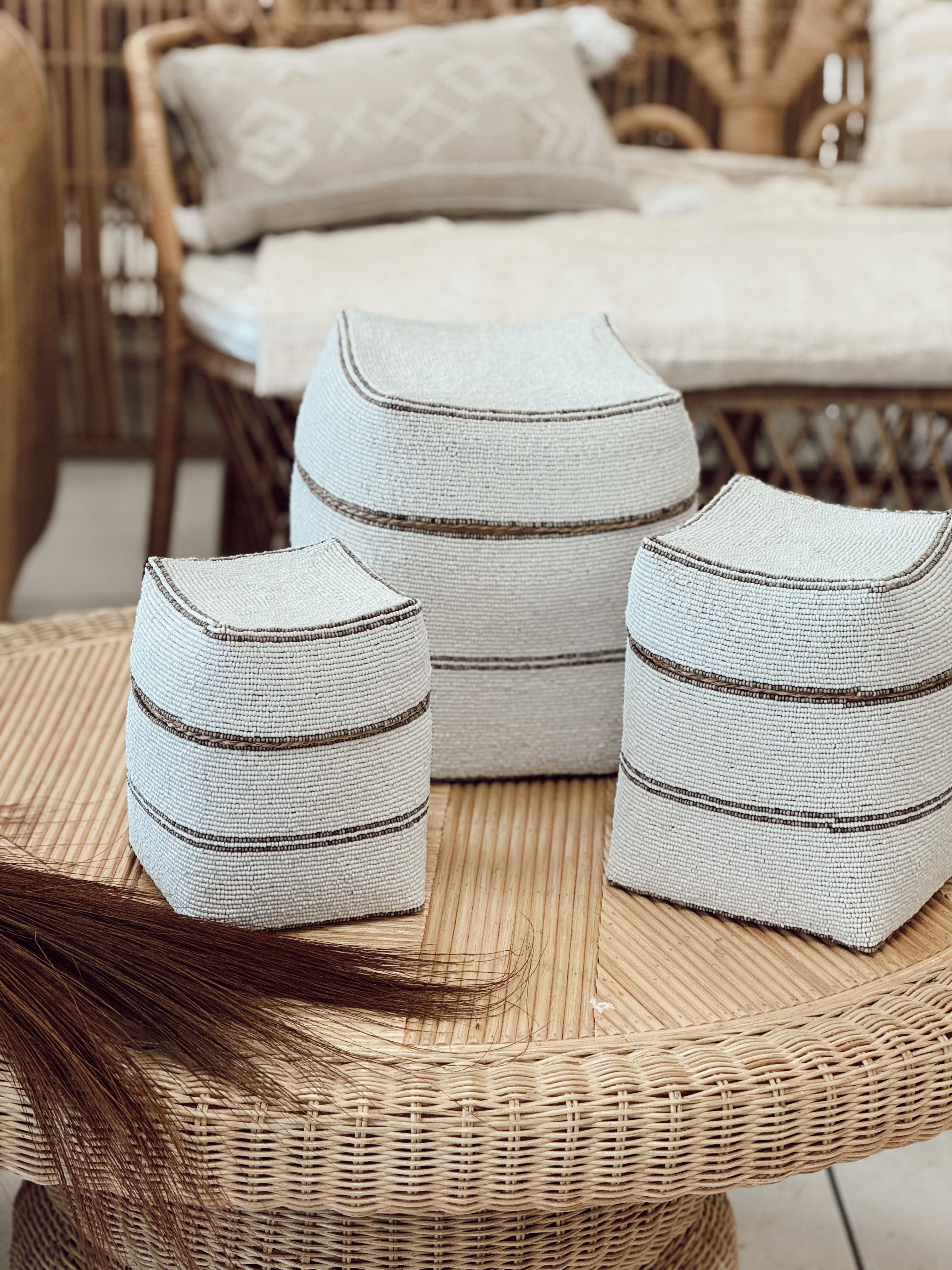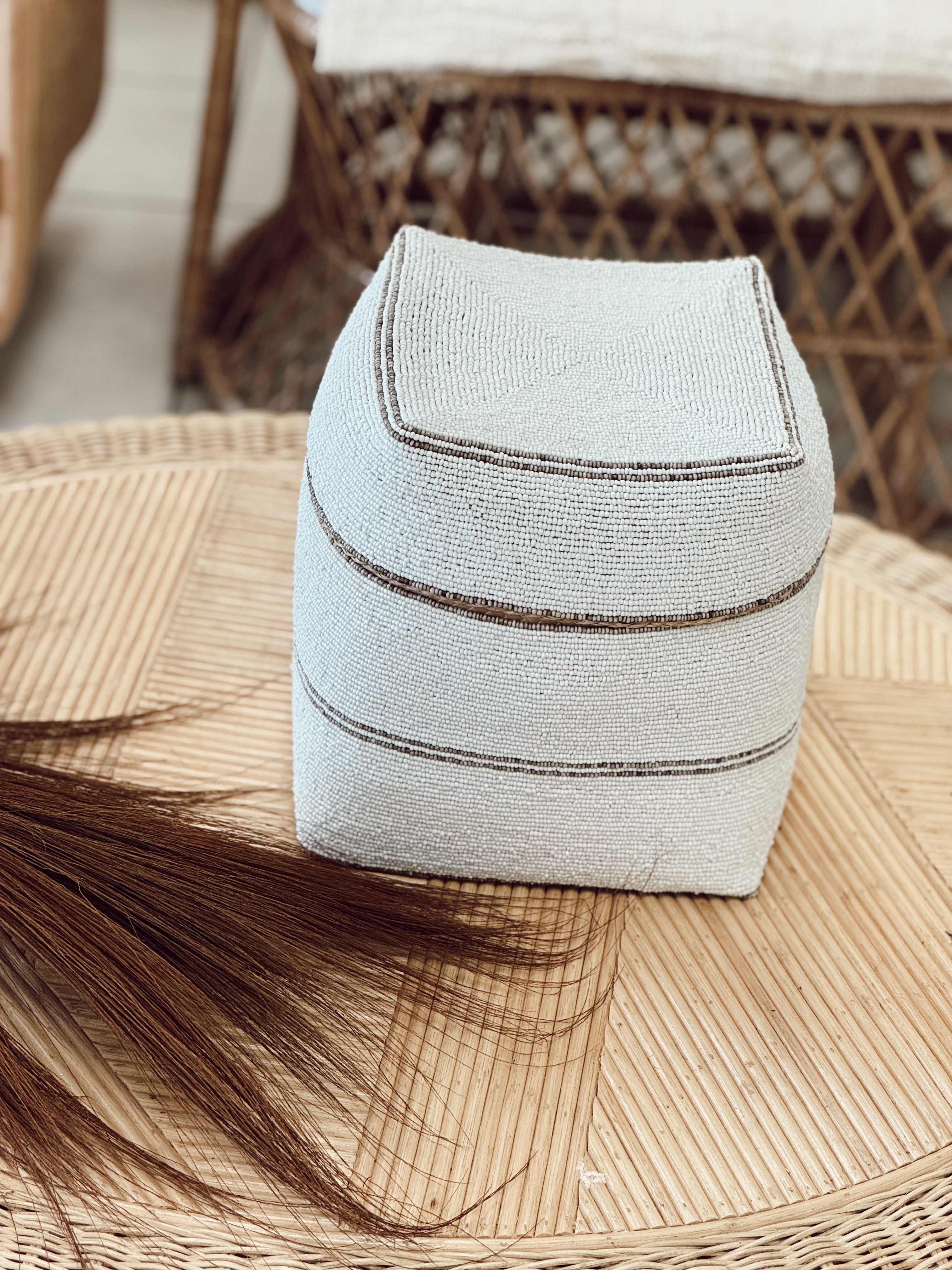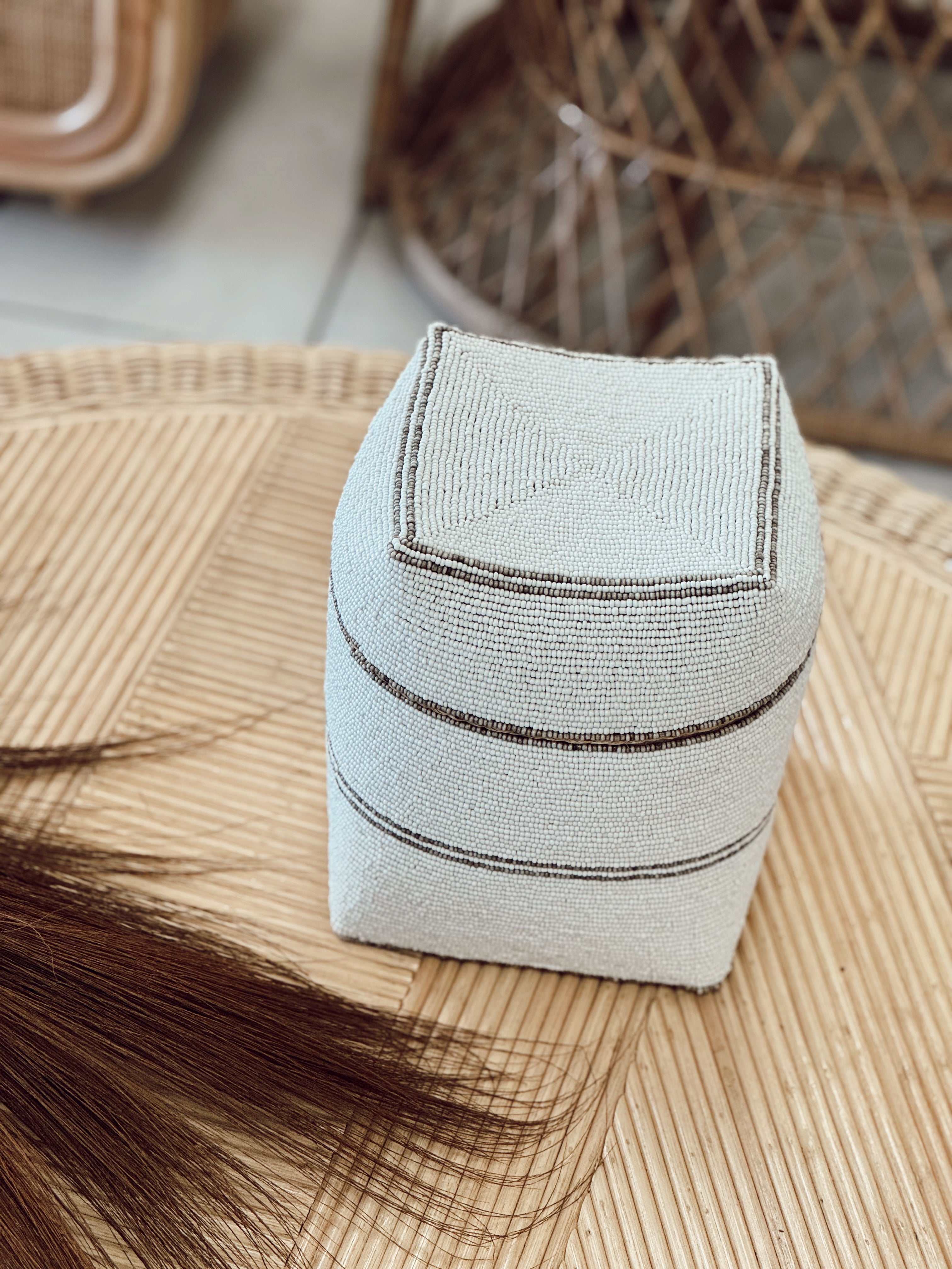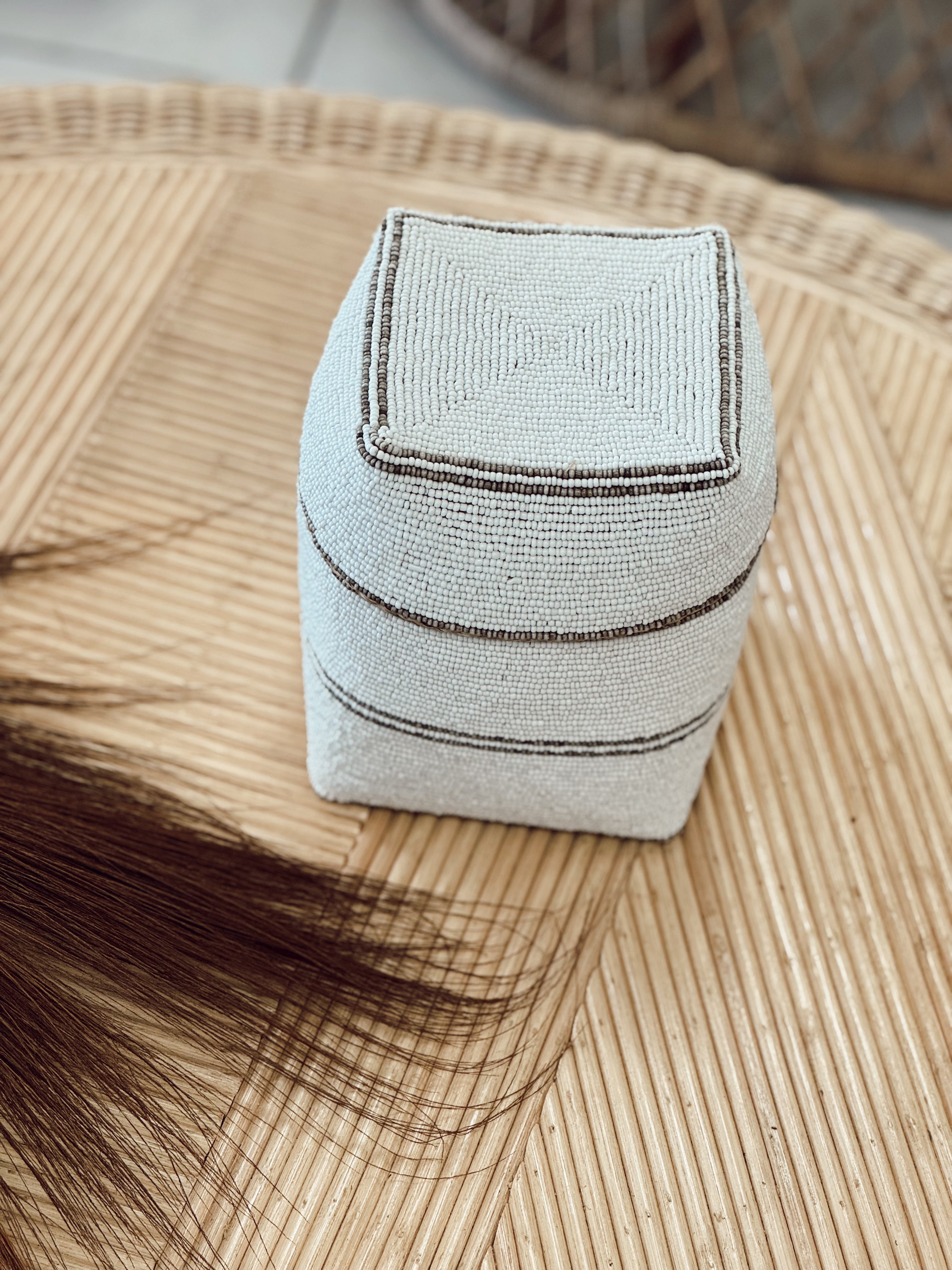 Ligne graphique, forme rectangulaire singulière et perlage subtil... Cette boîte de rangement en perles tisse le lien entre élégance artisanale et style contemporain. Parfaite pour structurer un intérieur tout en y ajoutant une touche précieuse, elle s’intègre aussi bien dans une chambre, un salon qu’un bureau.