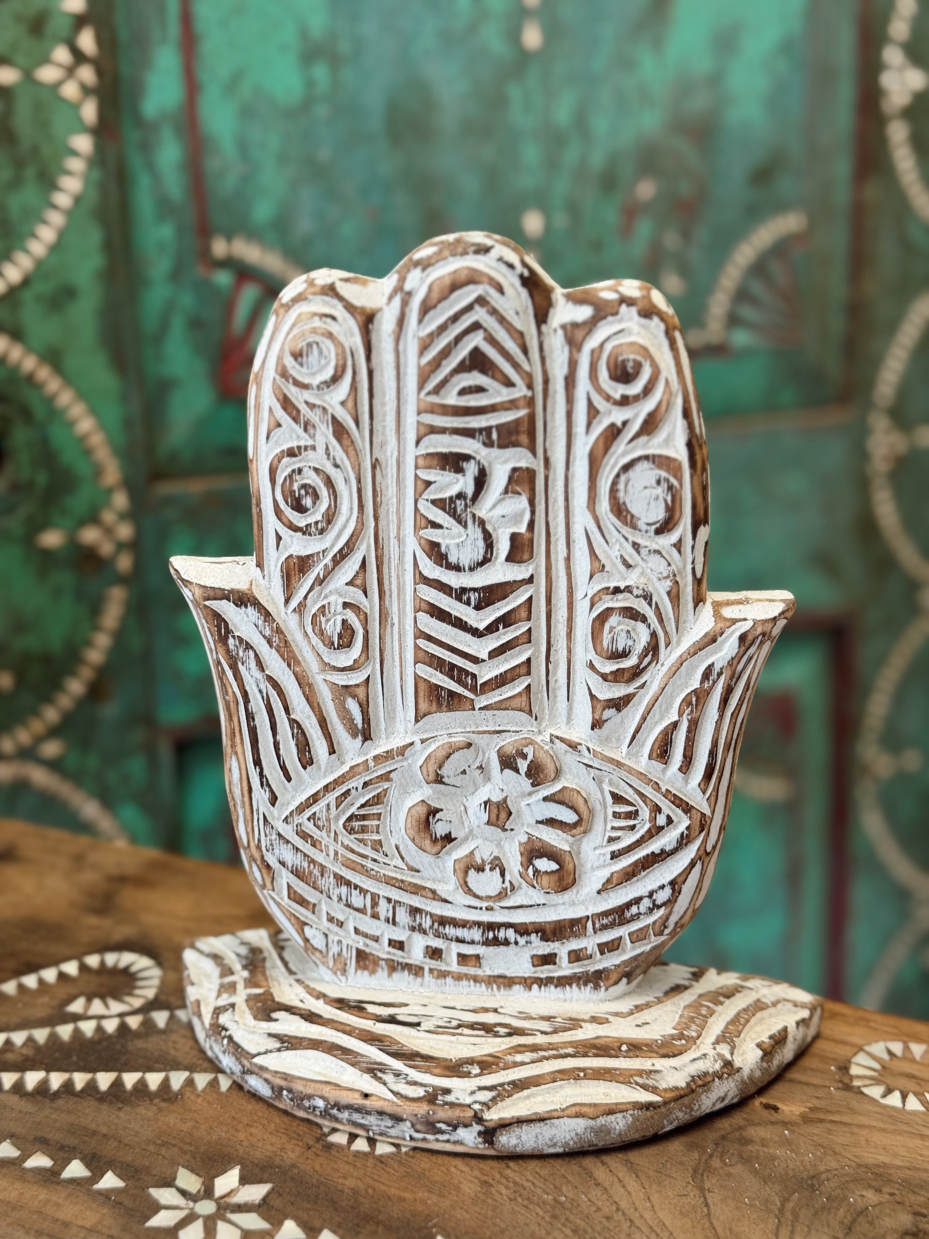 Symbole universel de protection, cette main sculptée représente l’énergie bienveillante et apaisante du hamsa. Ornée de détails finement gravés à la main à Bali, elle mêle inspirations balinaises et symboles mystiques (œil protecteur, fleur, motif "Om").