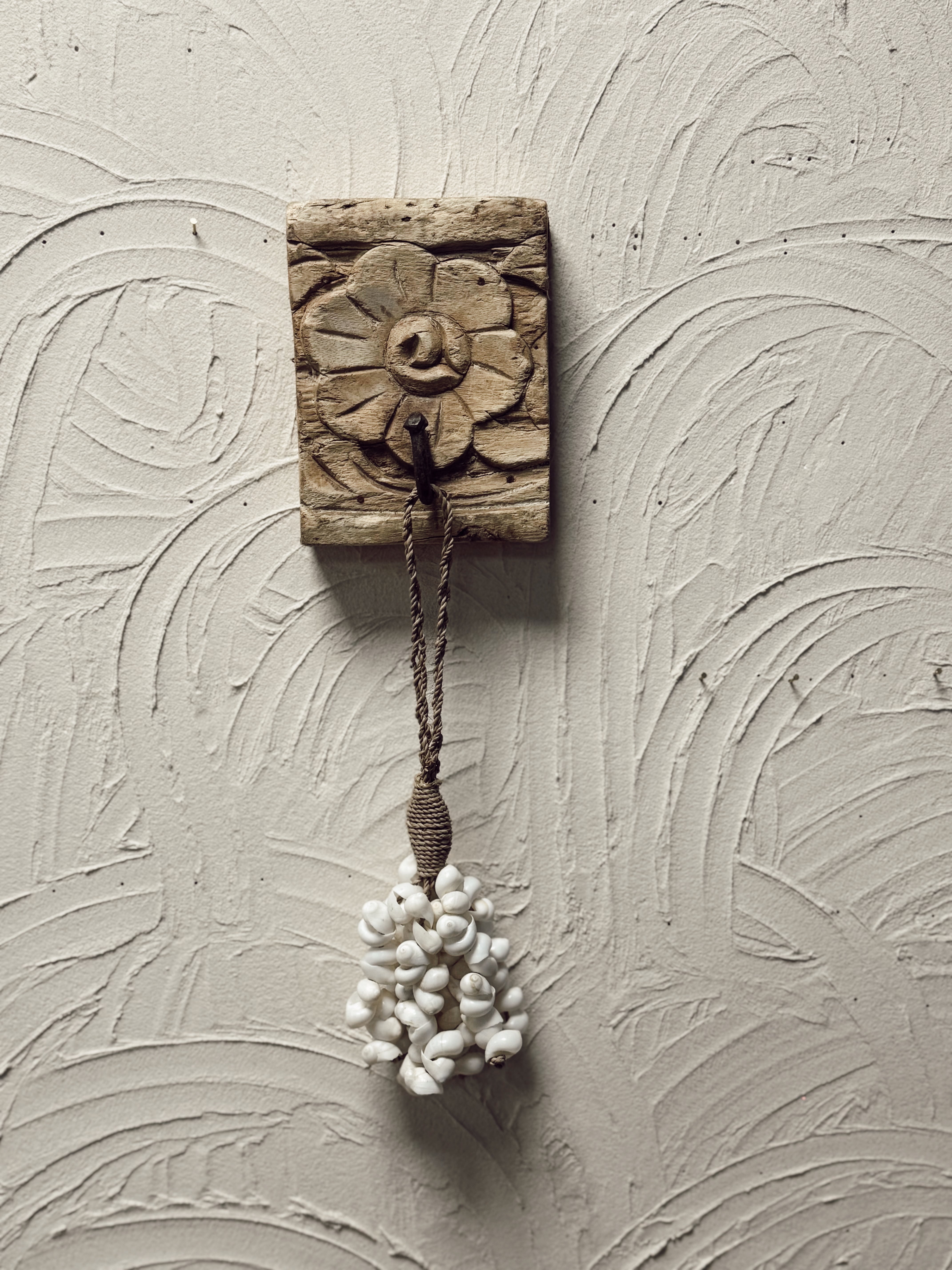 Chaque patère est unique, avec ses propres détails sculptés, ses irrégularités naturelles et sa teinte patinée. Le bois recyclé utilisé provient d’anciennes structures architecturales indiennes, lui conférant une histoire et une âme singulière