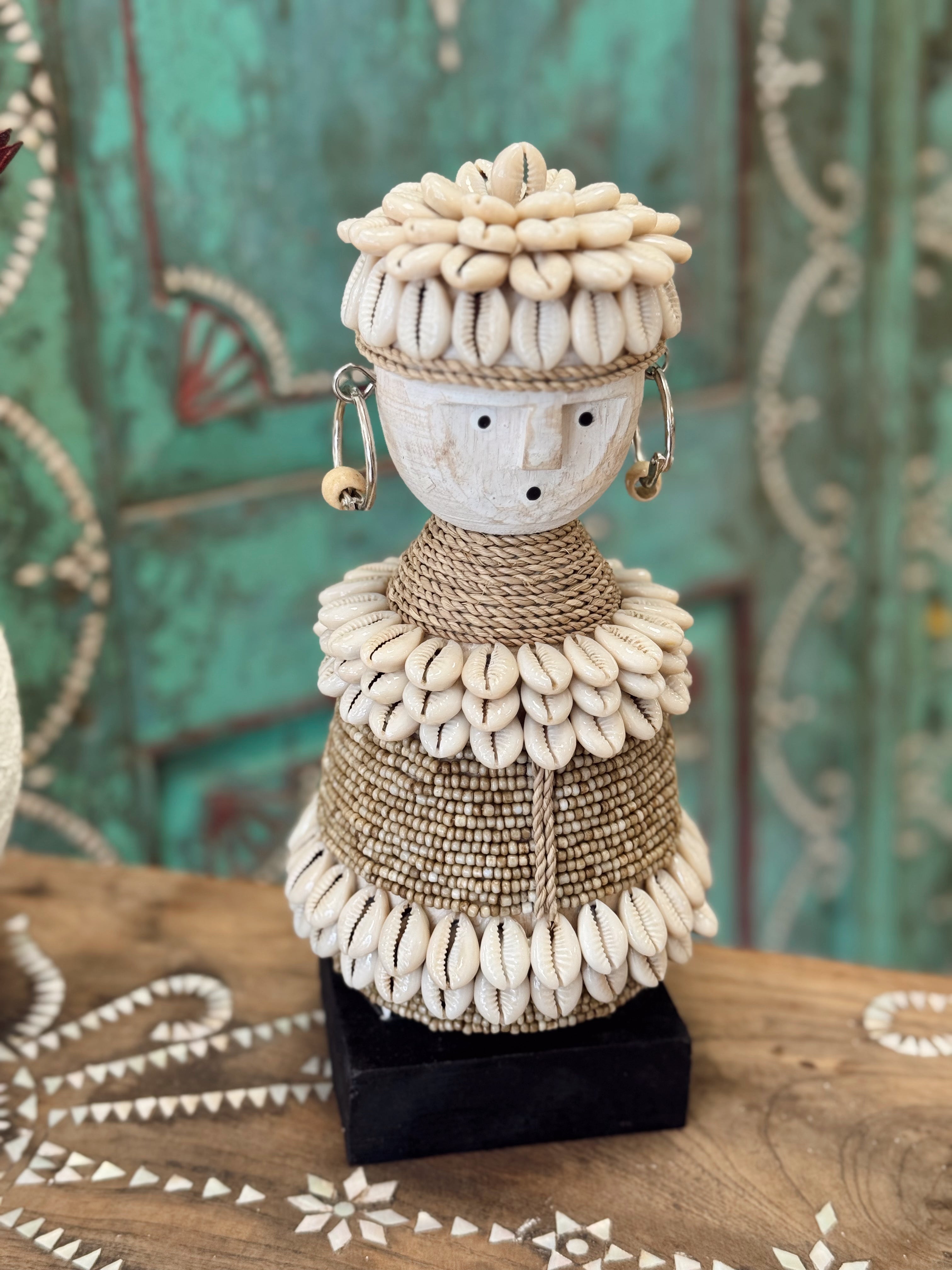 Une pièce décorative pleine de charme, entièrement confectionnée à la main à Bali. Coquillages naturels, corde tressée et détails minutieux font de cette statuette un véritable objet d’art ethnique à poser.