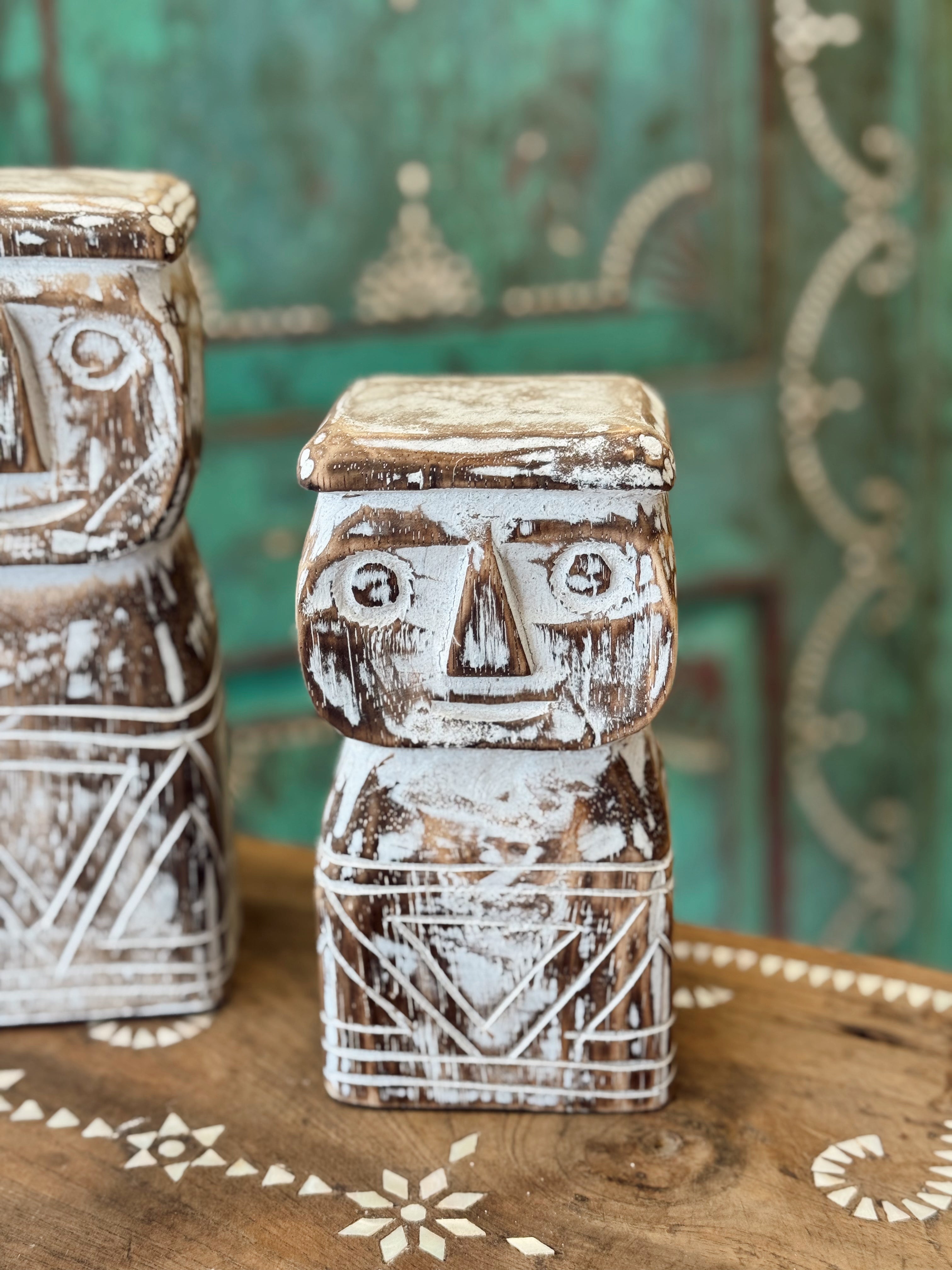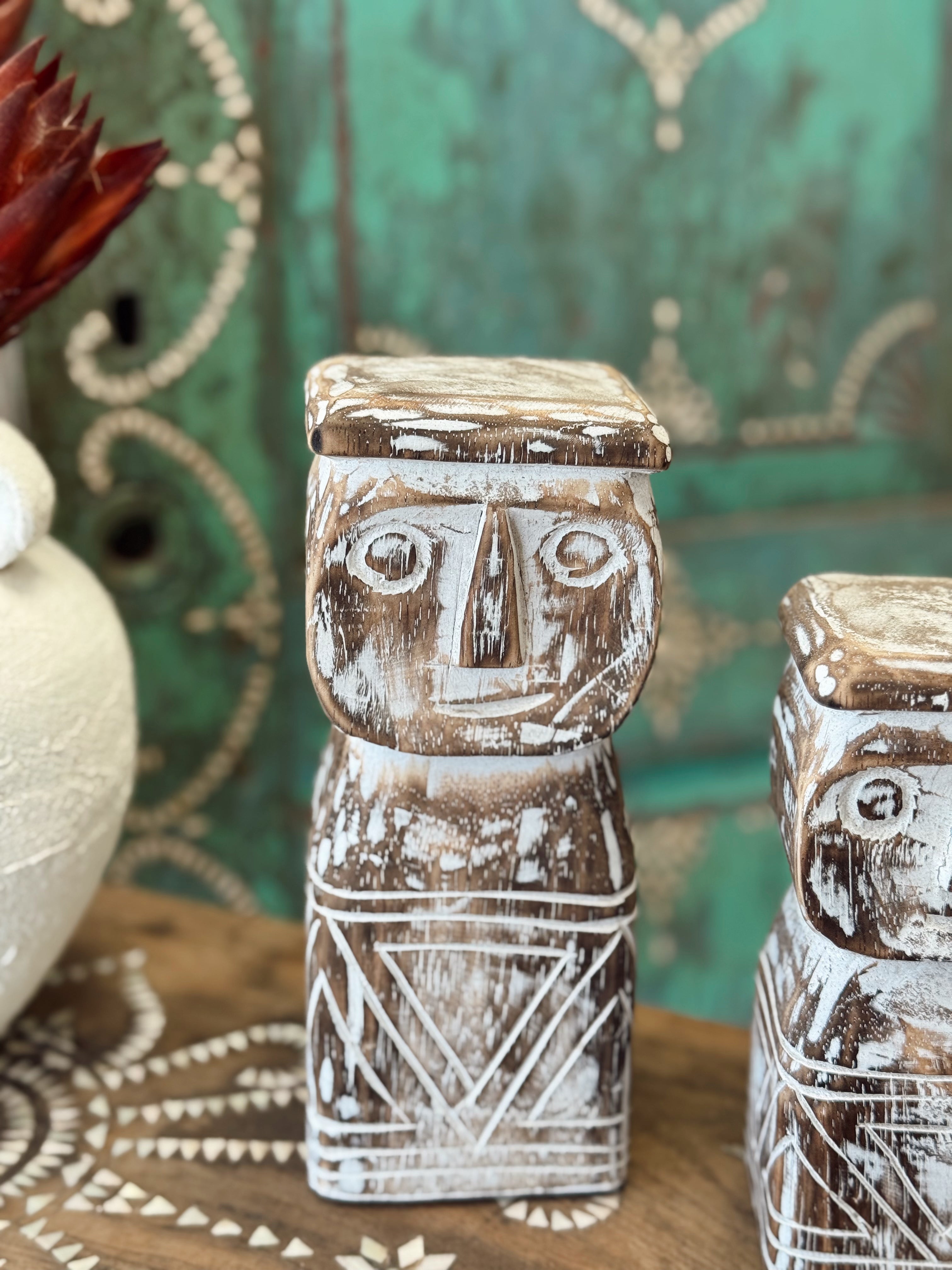Inspirées des sculptures traditionnelles balinaises, ces statuettes apportent une touche artisanale et spirituelle à votre décoration. Chacune est taillée et patinée à la main dans un bois brut, puis blanchie pour un rendu texturé et authentique.