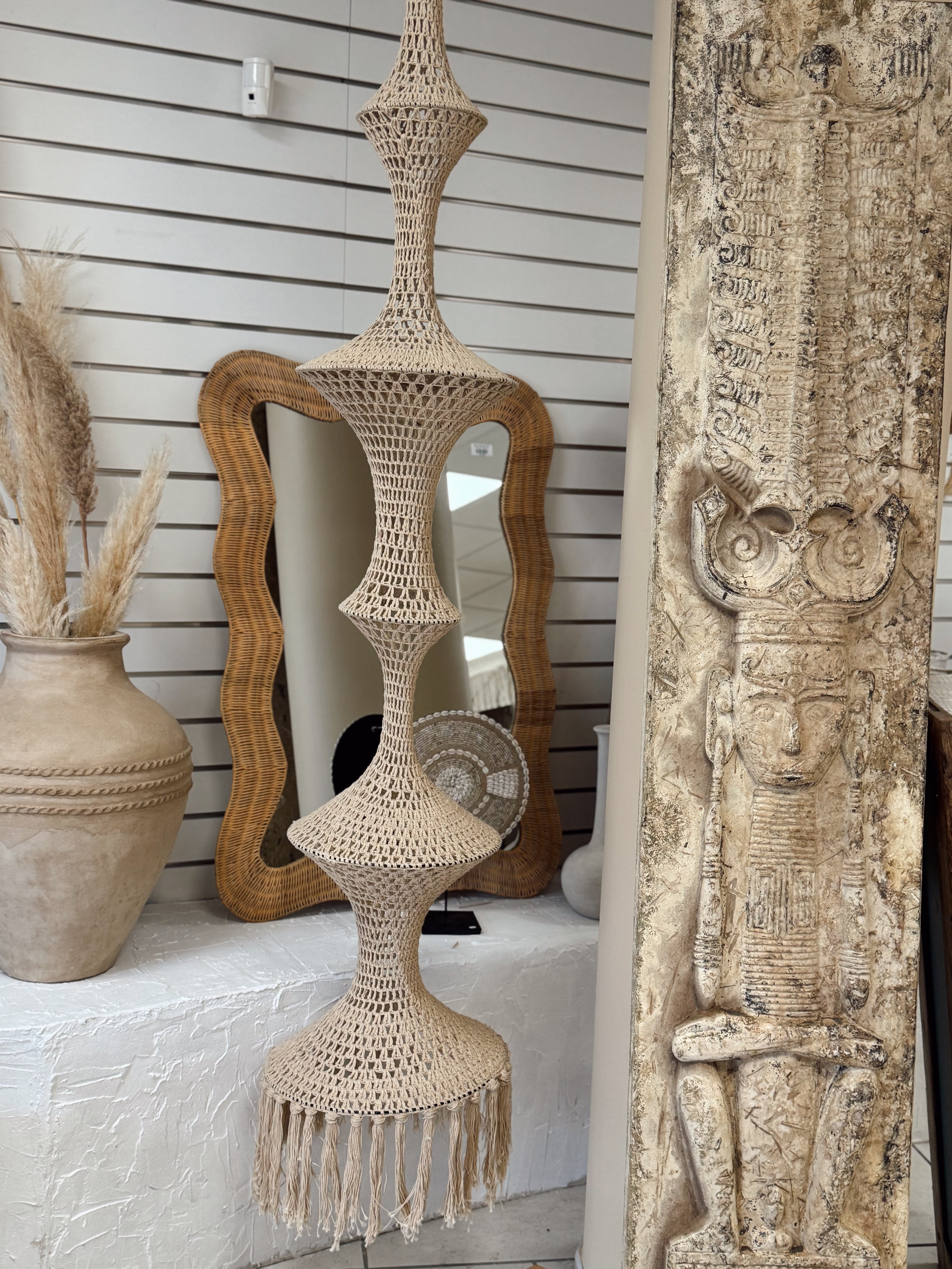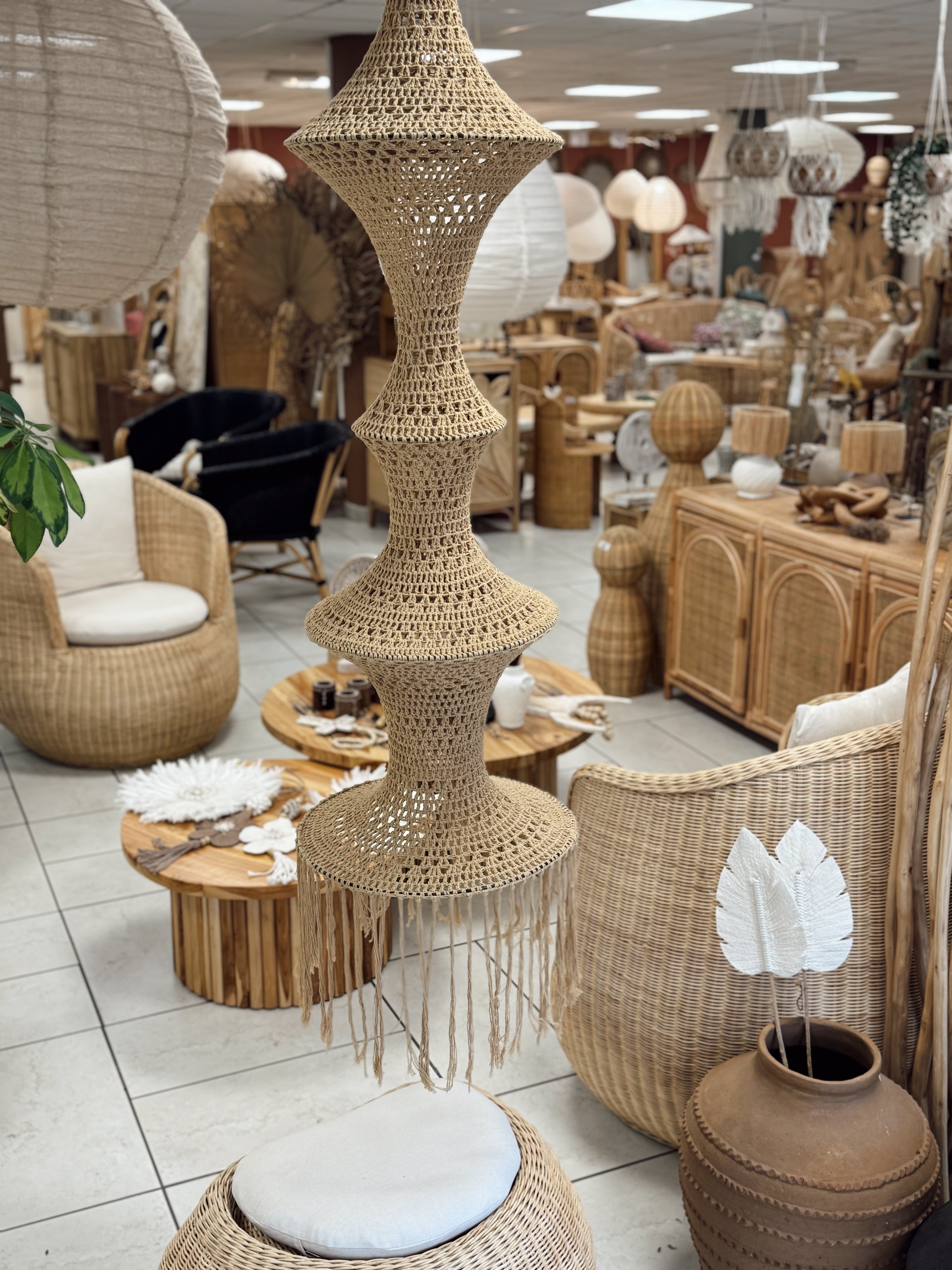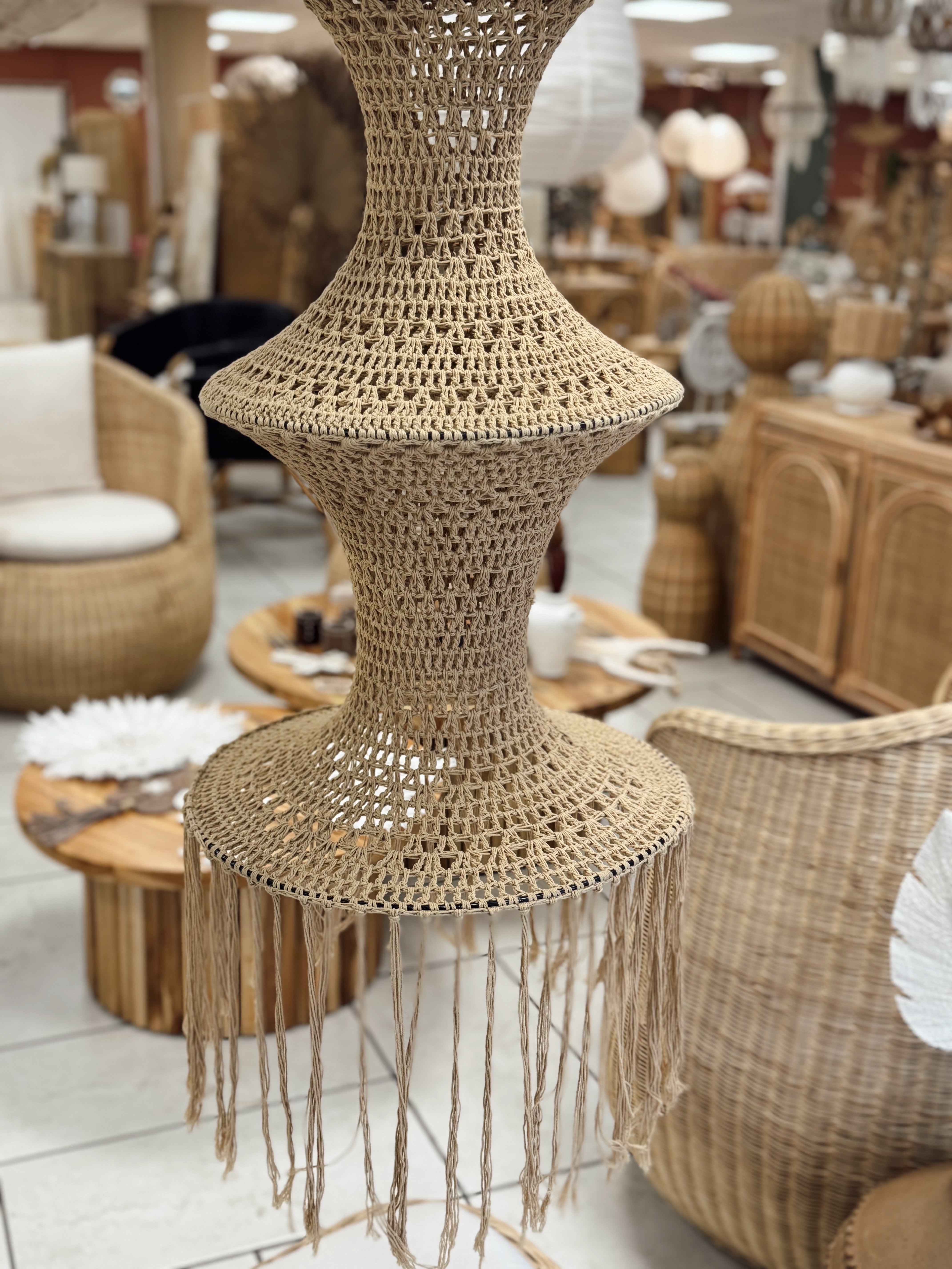 Cette suspension tressée en macramé est une véritable œuvre d’art textile. Avec ses formes galbées sculpturales, elle habille l’espace à elle seule. Elle peut être utilisée telle quelle en suspension déco ou électrifiée pour devenir une suspension lumineuse.