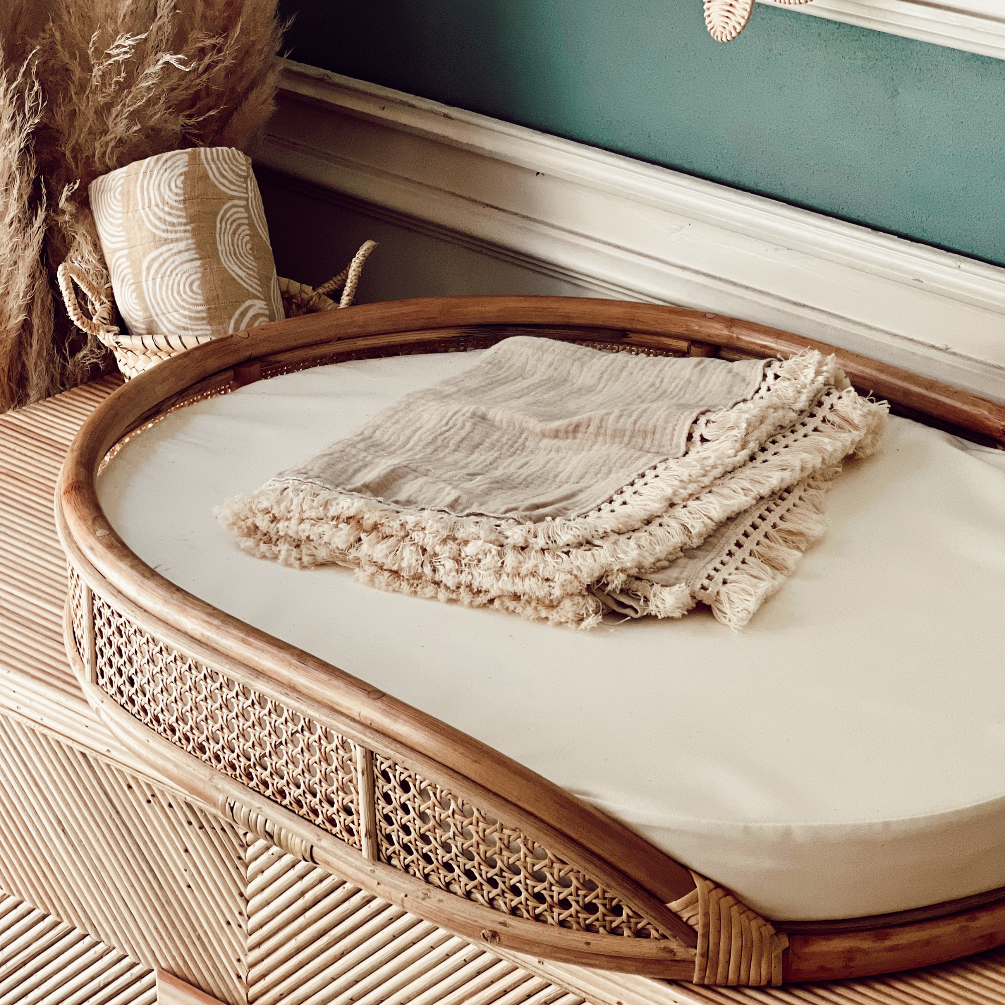 Notre panier à langer de la collection Nusa Penida vous permettra de changer vos kids dans toutes les pièces de la maison et apportera une petite touche bohème à votre déco.