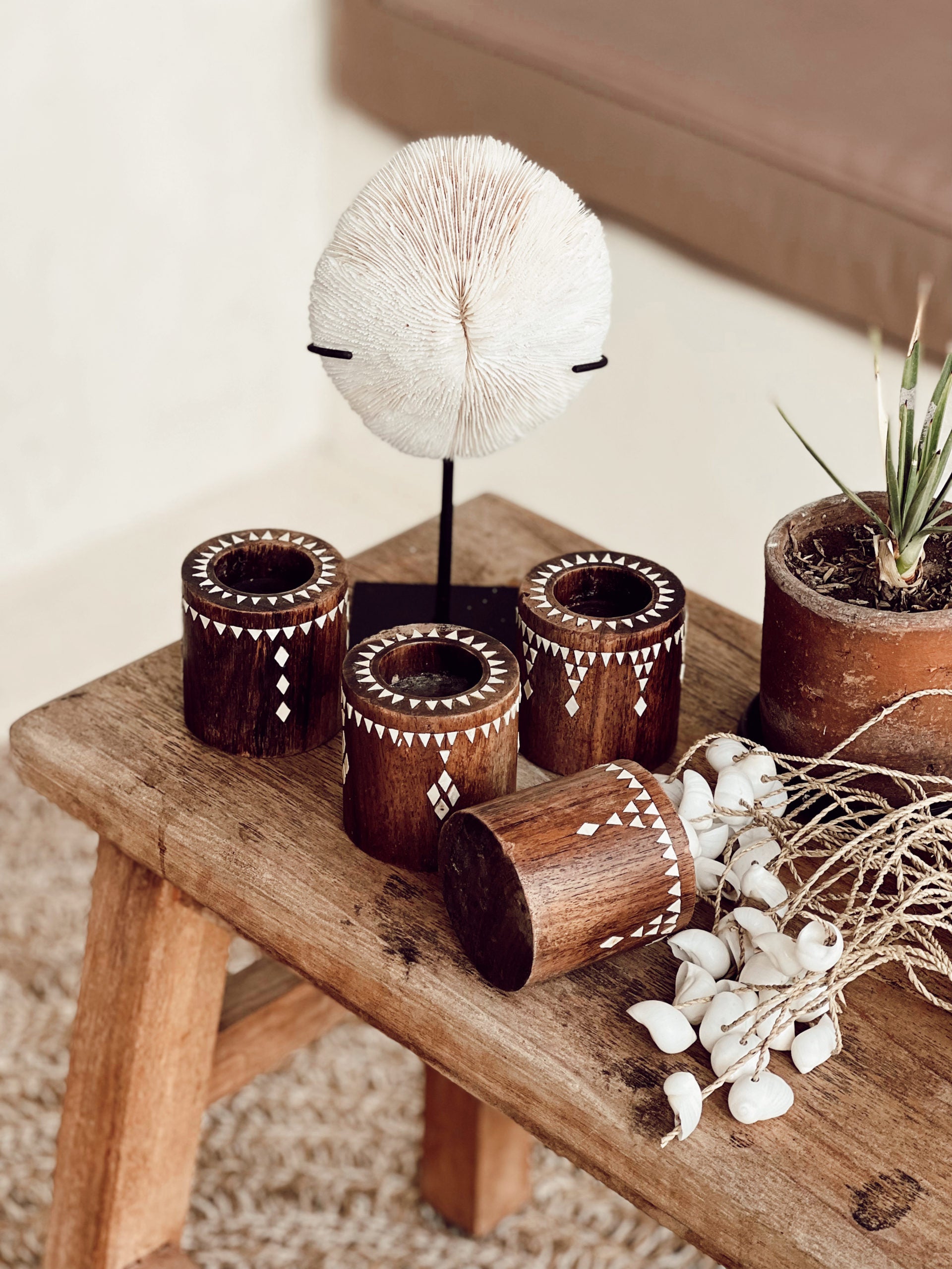 Nos bougeoirs en teck ancien avec une incrustation de nacre apporteront à votre intérieur une ambiance ethnique chic.