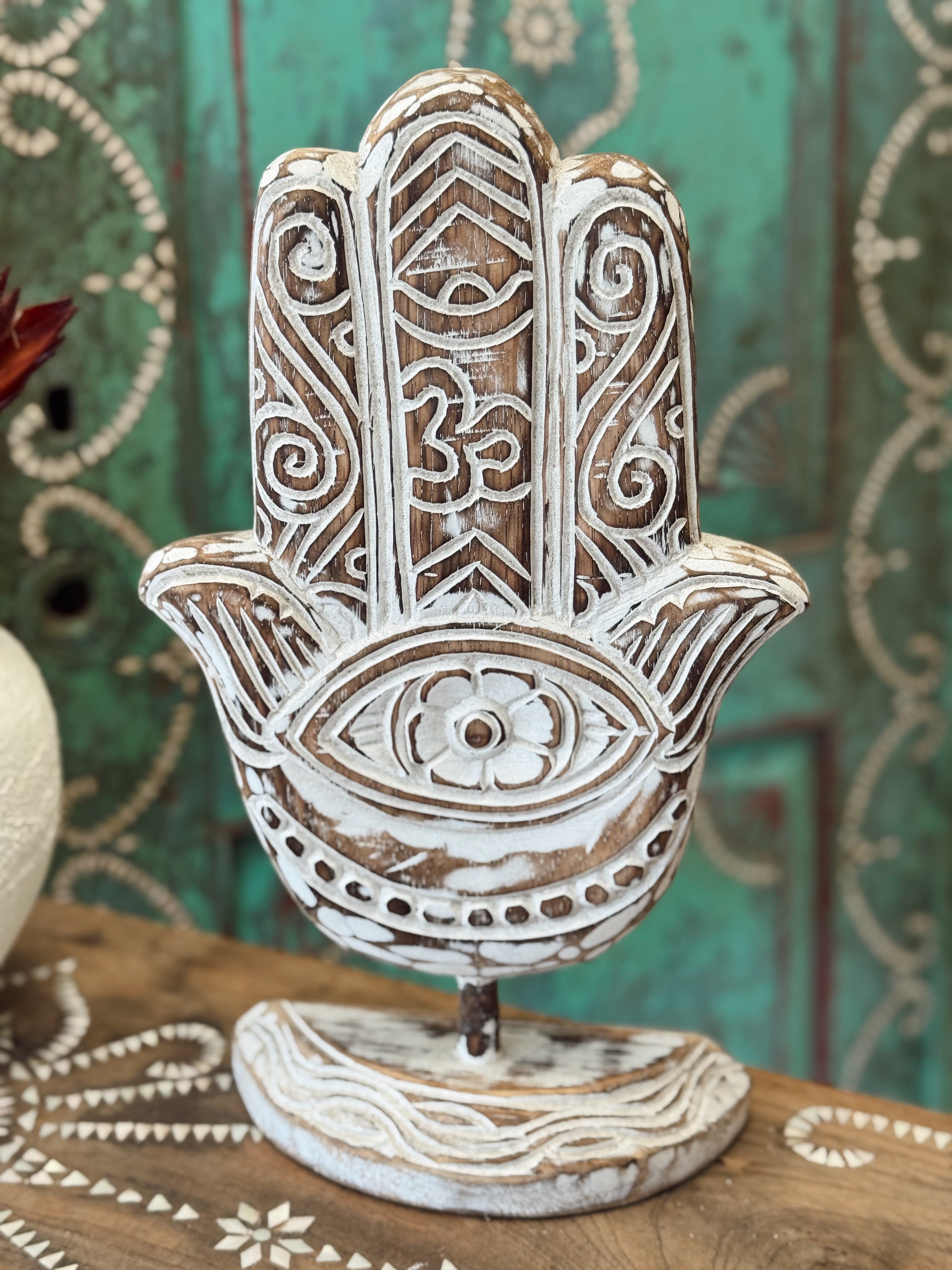 Symbole universel de protection, cette main sculptée représente l’énergie bienveillante et apaisante du hamsa. Ornée de détails finement gravés à la main à Bali, elle mêle inspirations balinaises et symboles mystiques (œil protecteur, fleur, motif "Om").