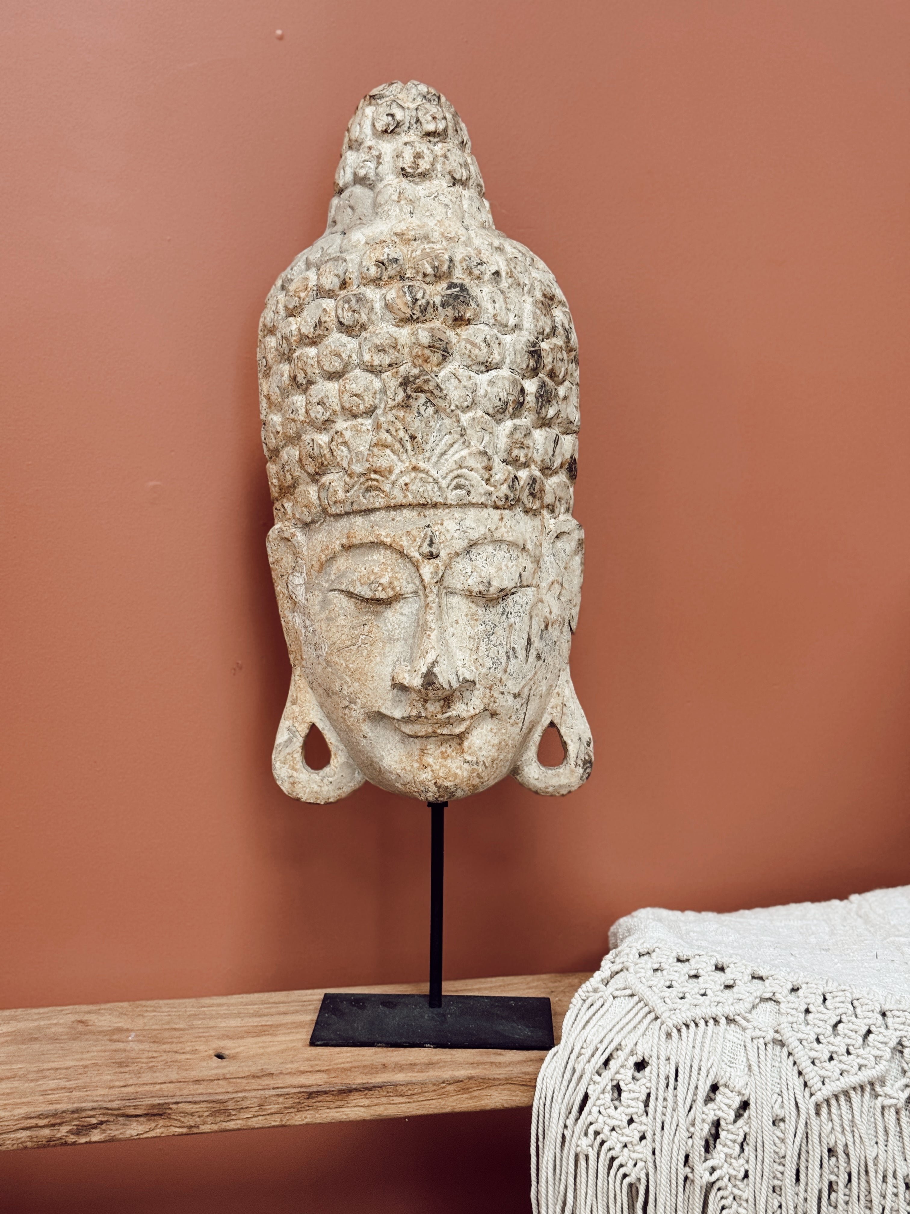 Des pièces fortes et pleines d’âme, tout droit venues de Bali. Ces sculptures représentent des visages de divinités balinaises et bouddhistes, dans un bois patiné à la main pour un rendu brut et authentique.