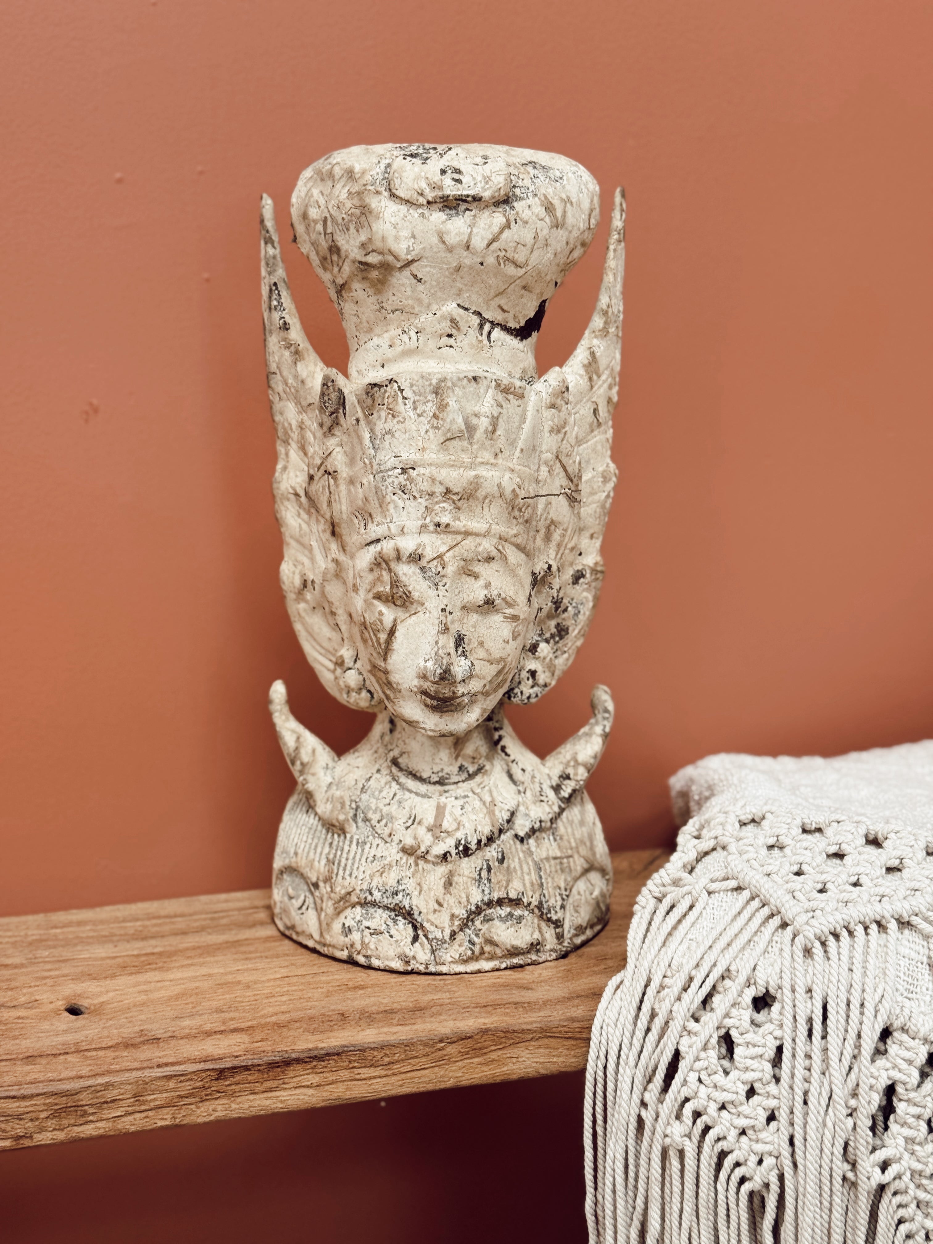 Chaque pièce est sculptée à la main dans du bois massif par des artisans balinais. Les détails sont travaillés avec finesse, et la patine blanche ou brune vieillie apporte une profondeur unique à chaque visage.