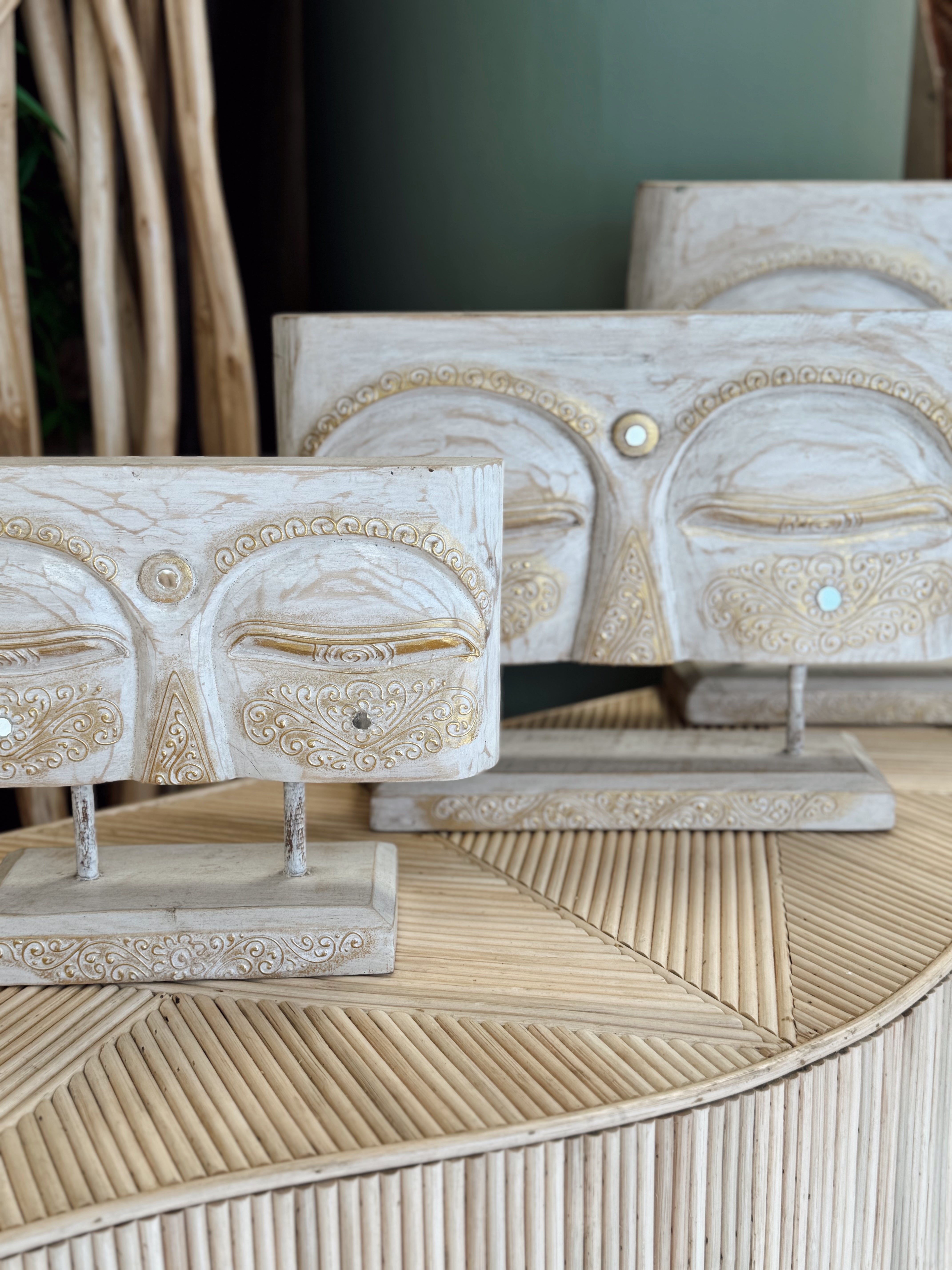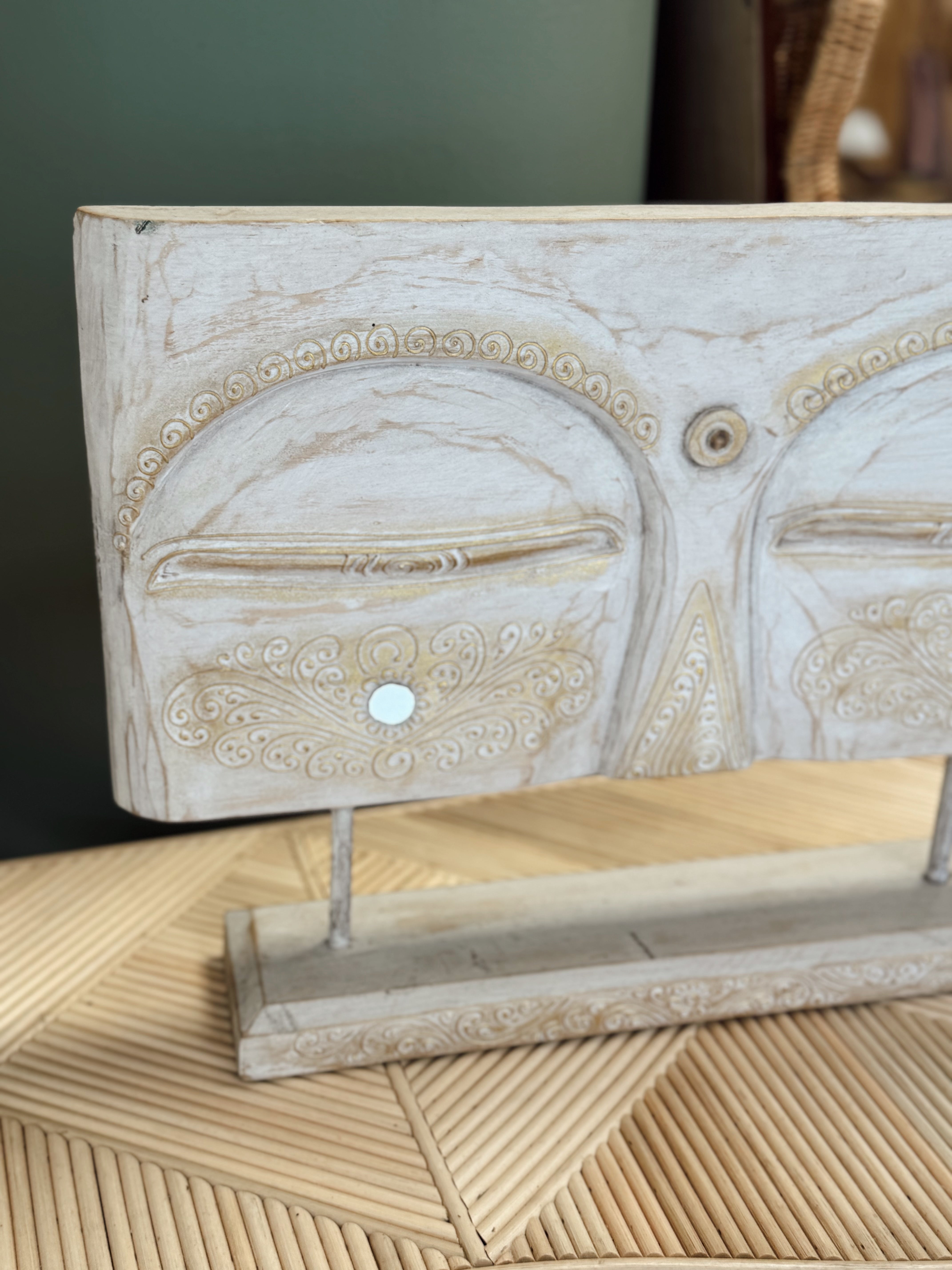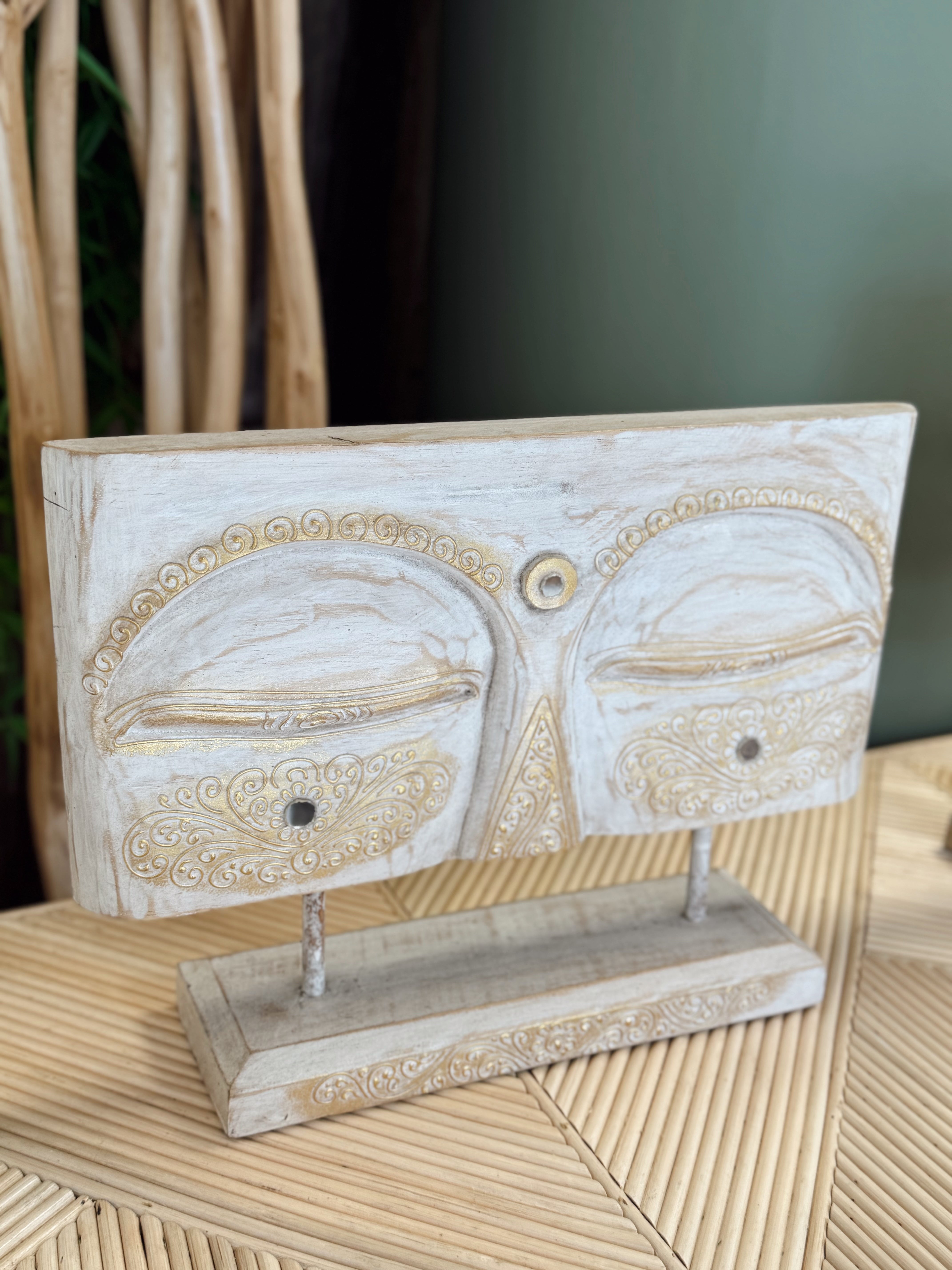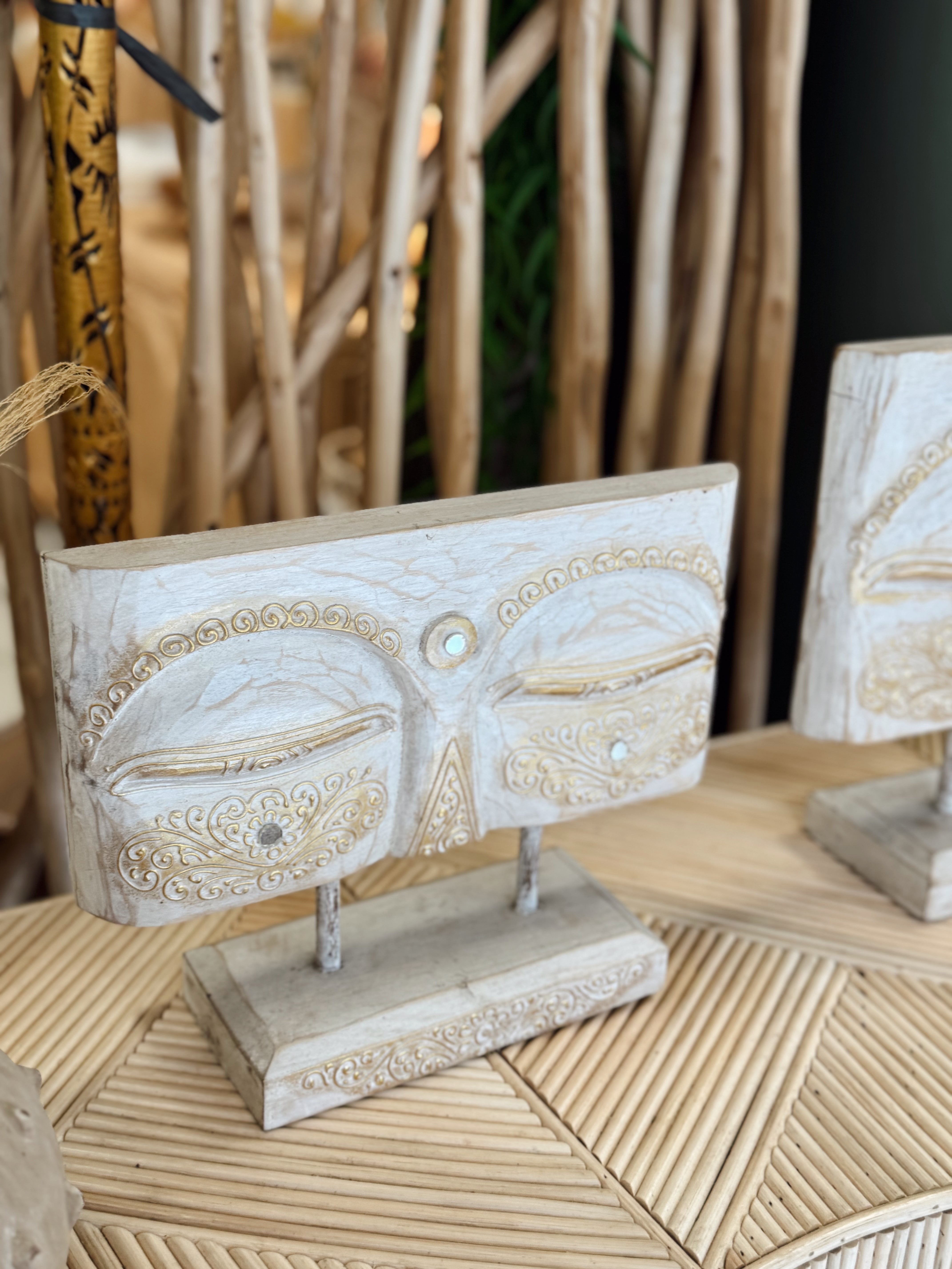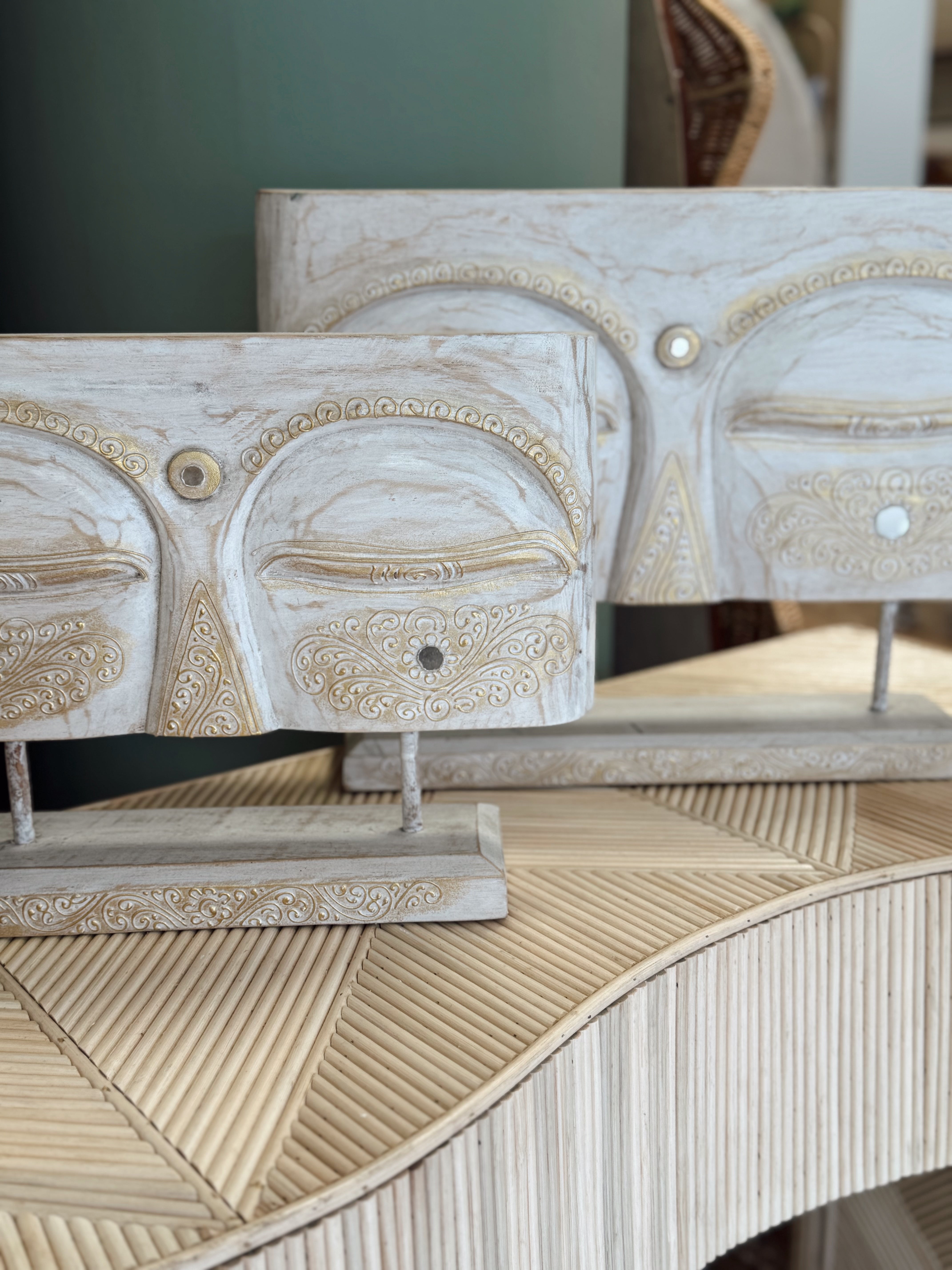 Pièce emblématique de la décoration ethnique chic, cette sculpture représente un visage stylisé sculpté à la main dans du bois blanchi. Chaque détail gravé à la main reflète le savoir-faire balinais, entre spiritualité et modernité. À poser sur un buffet, une étagère ou une console pour une touche artisanale forte.