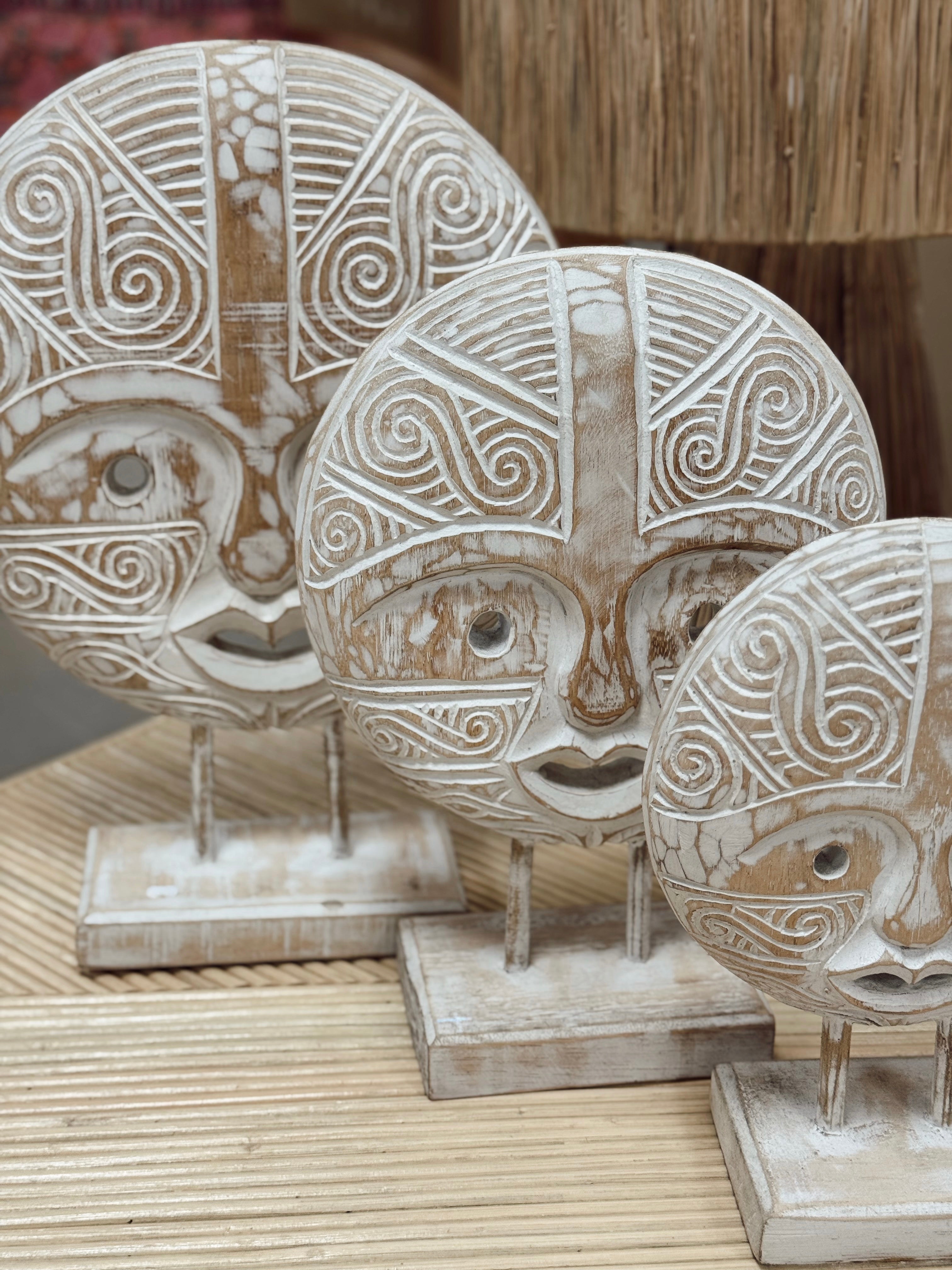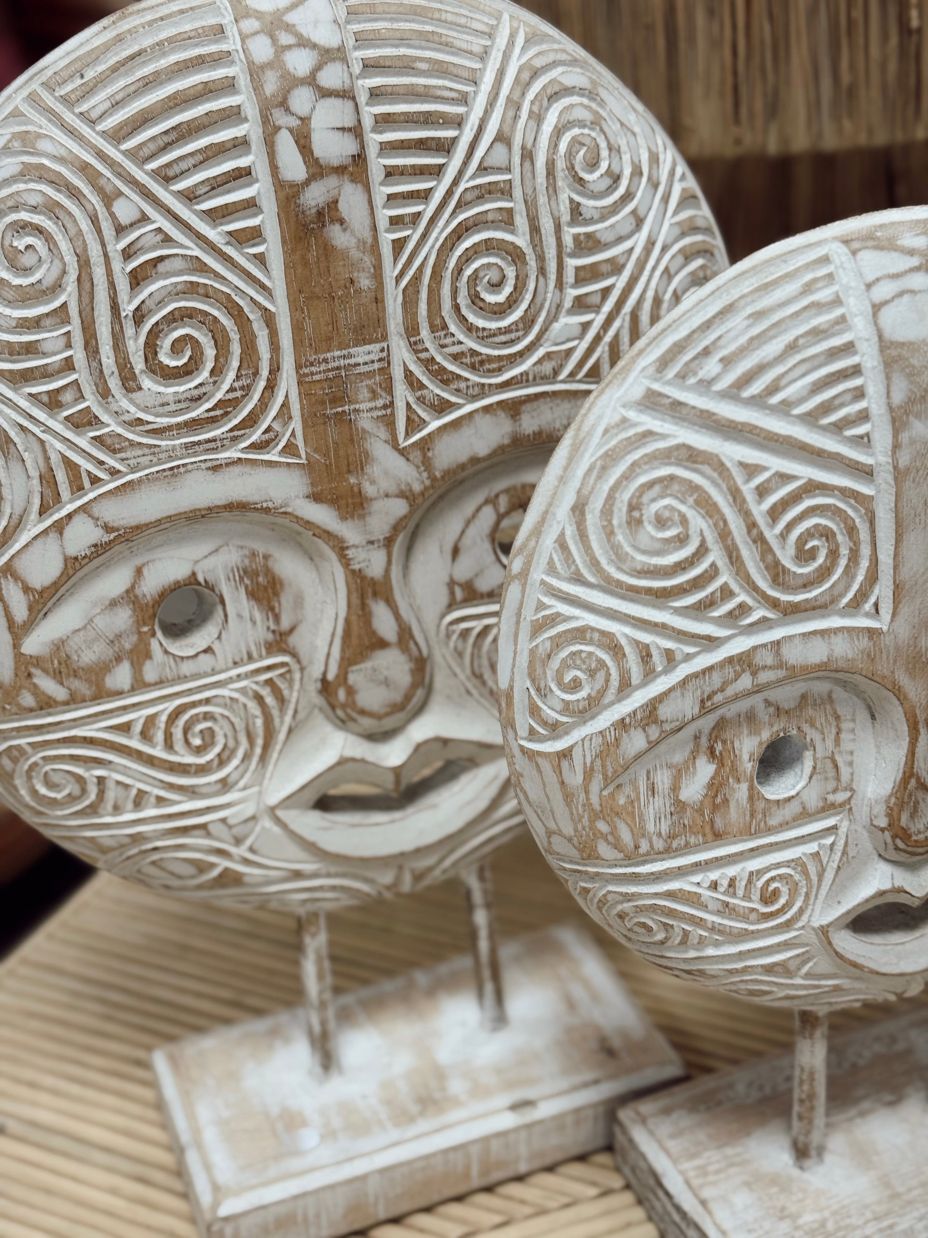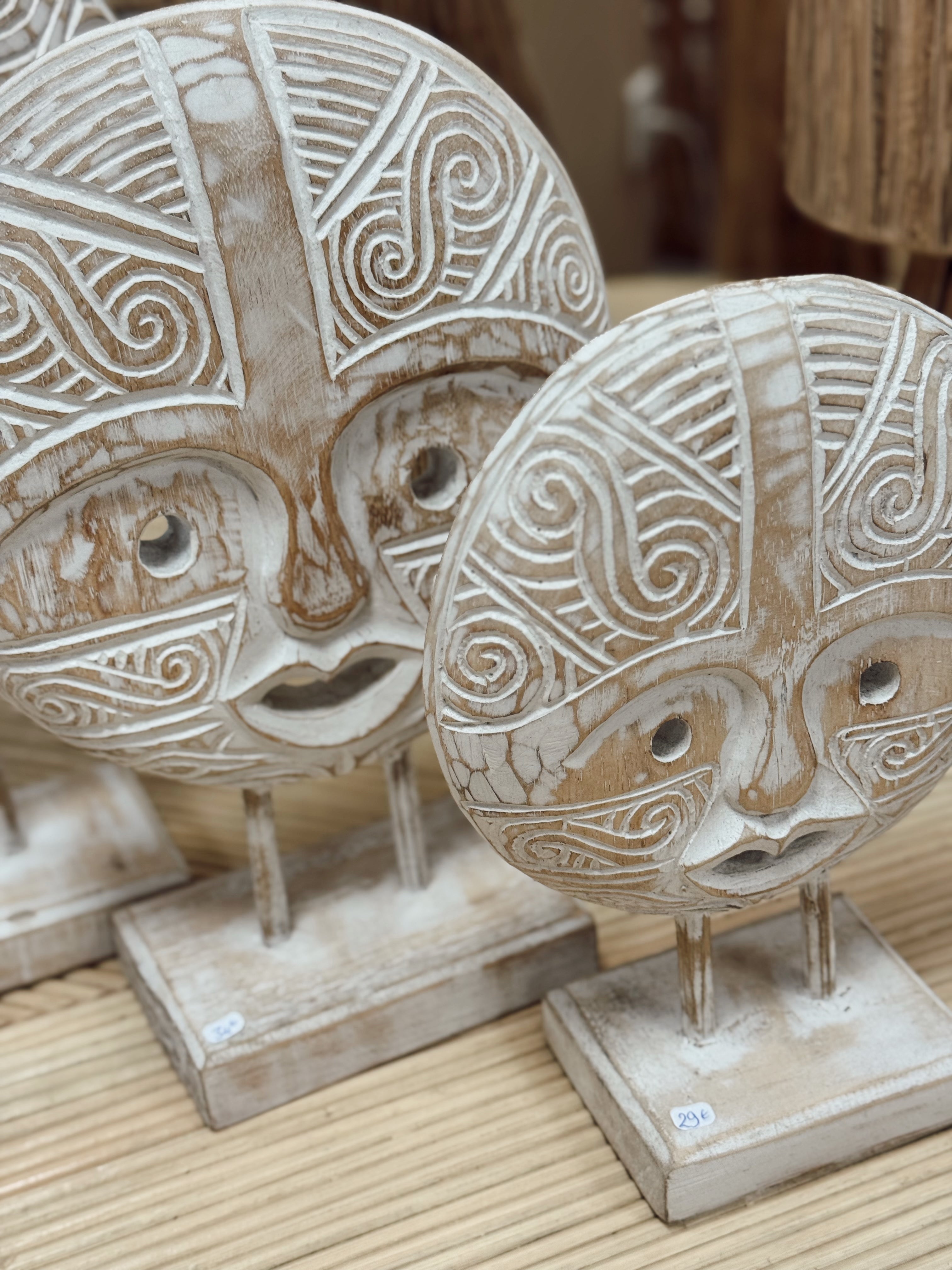 Ces statuettes en bois représentent des visages tribaux inspirés des cultures ancestrales indonésiennes. Leurs courbes gravées à la main et leurs motifs en spirale évoquent l’art Ikat, entre spiritualité et artisanat sacré. Chaque pièce semble raconter une histoire venue d’ailleurs.