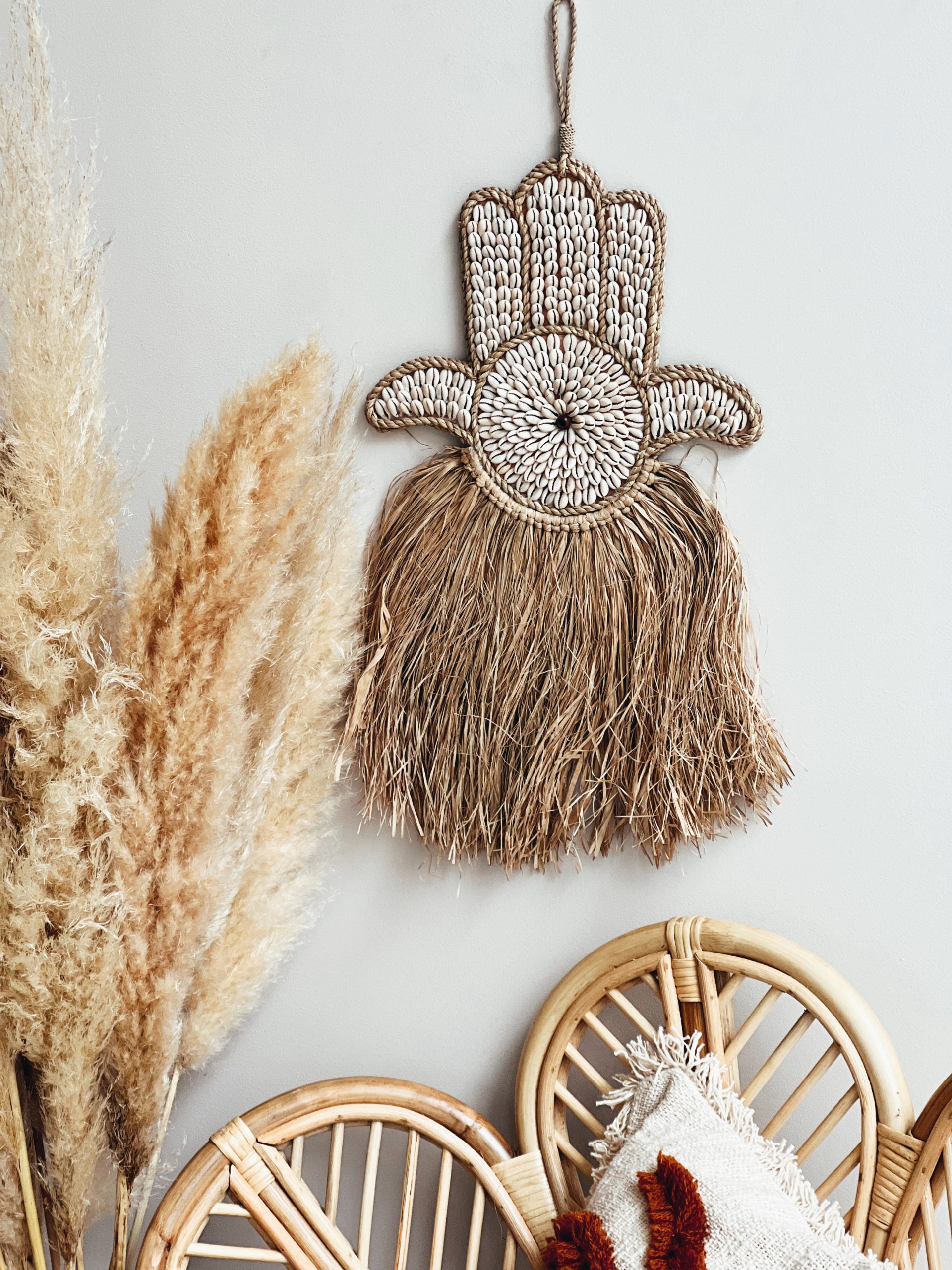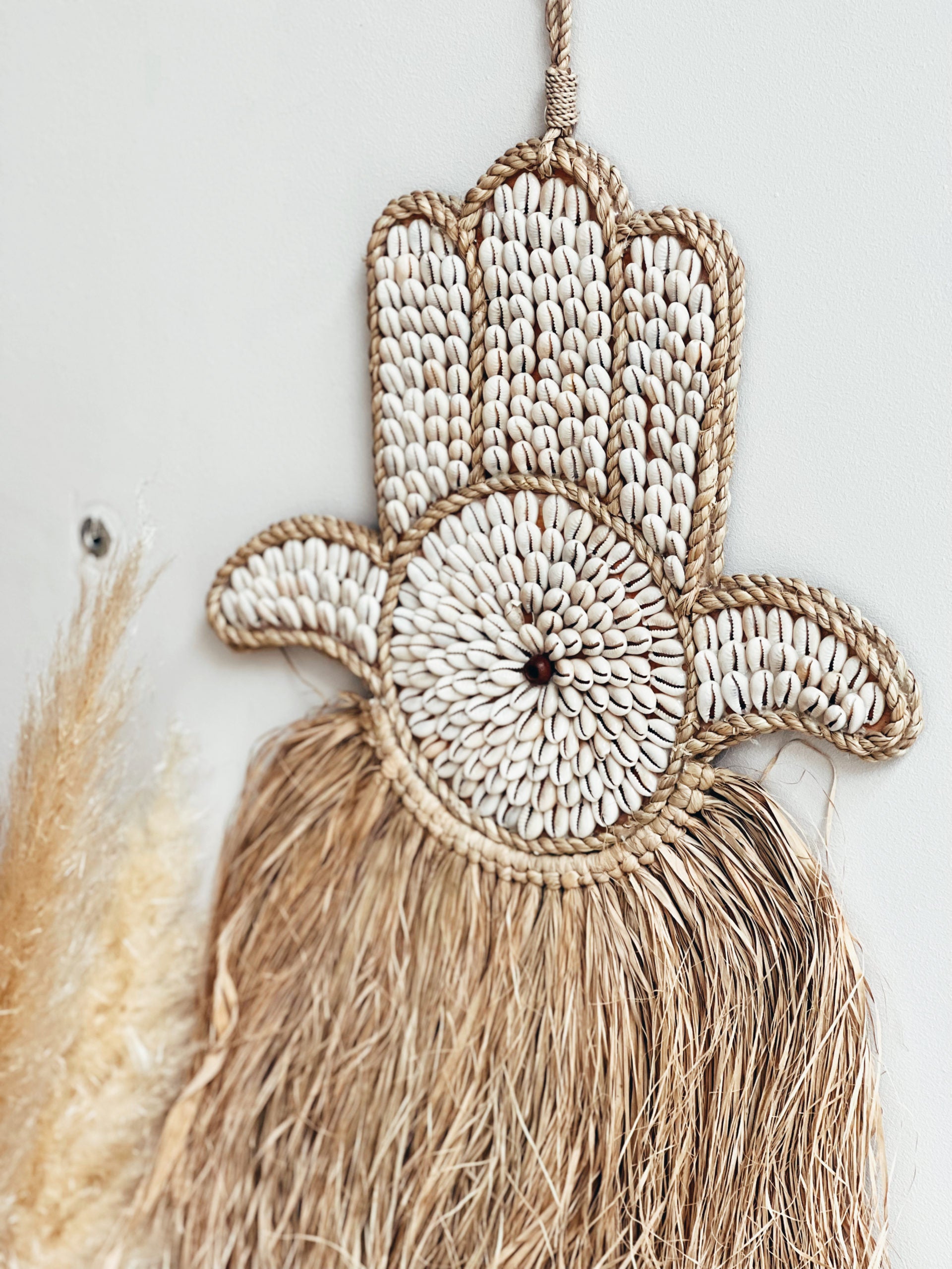 Suspension main en coquillage et raphia fabriquée à la main par des artisans balinais. A accrocher ou suspendre, cette suspension donnera une ambiance bohème à votre décoration.