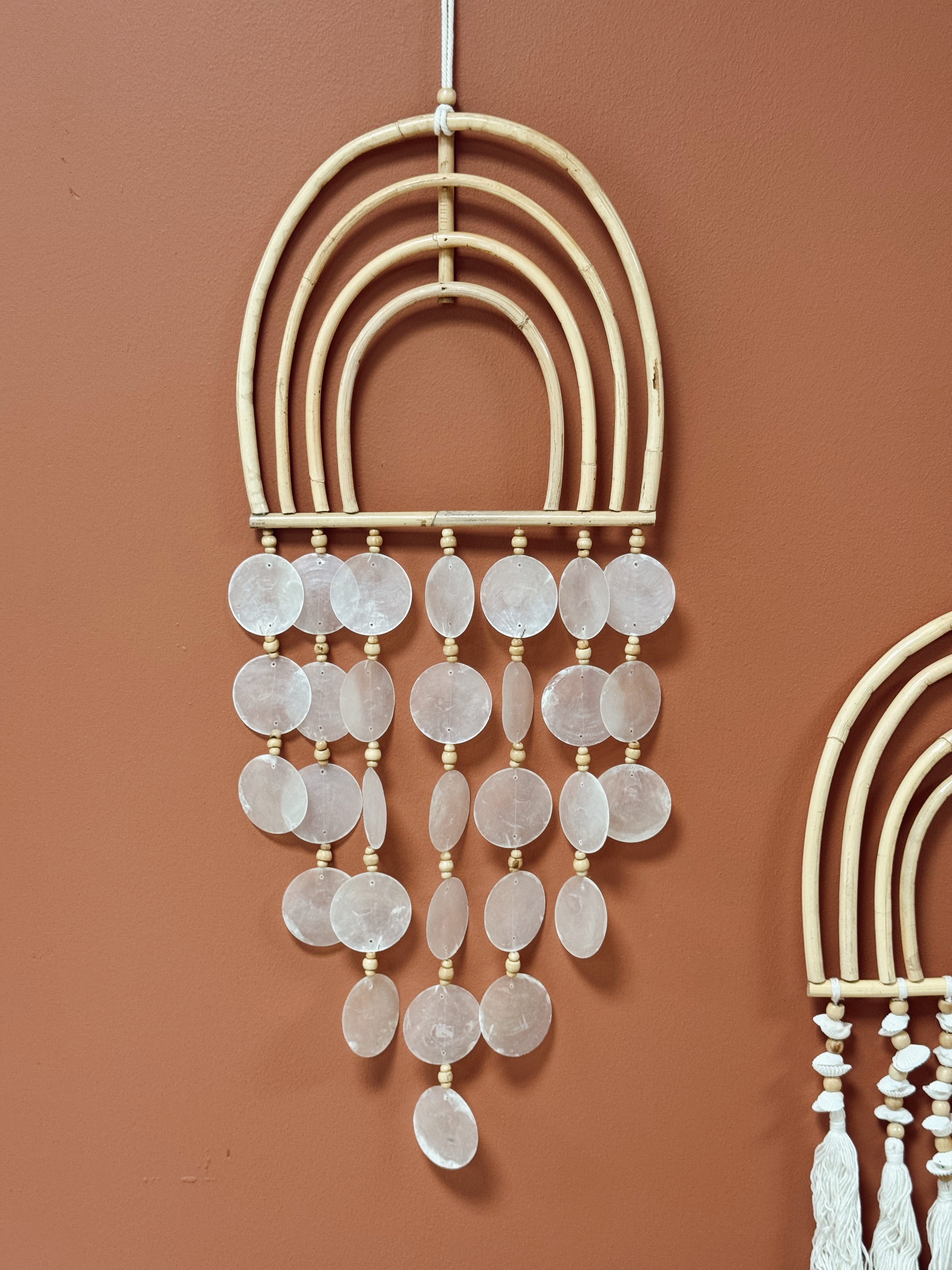 • Modèle nacré –  63cm x 25cm Pampilles en coquillages translucides et perles de bois naturelles