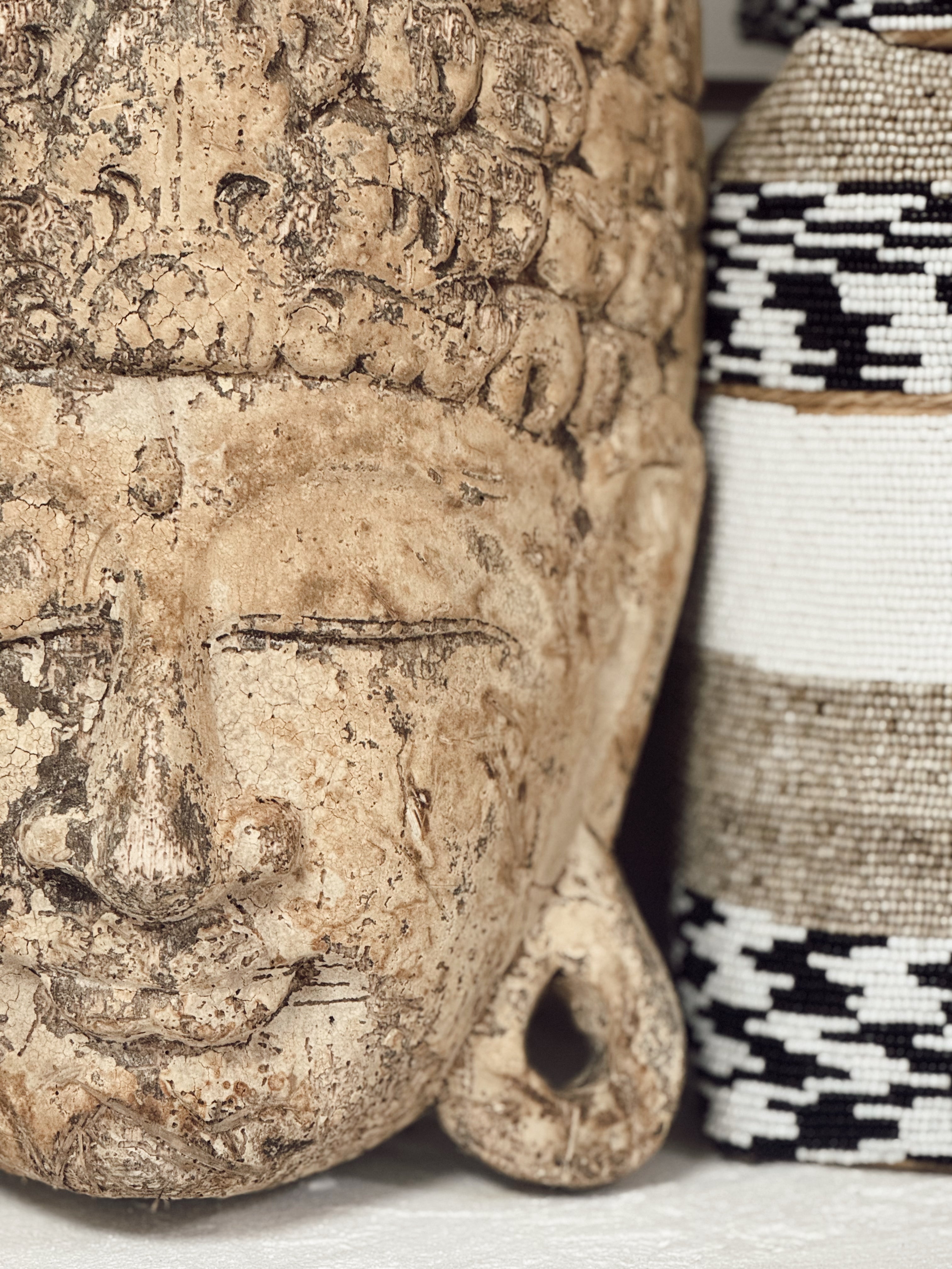 Chaque pièce est sculptée à la main à Bali dans un bois ancien, puis volontairement patinée pour obtenir un effet vieilli unique. Les irrégularités et craquelures font partie intégrante de son charme brut.