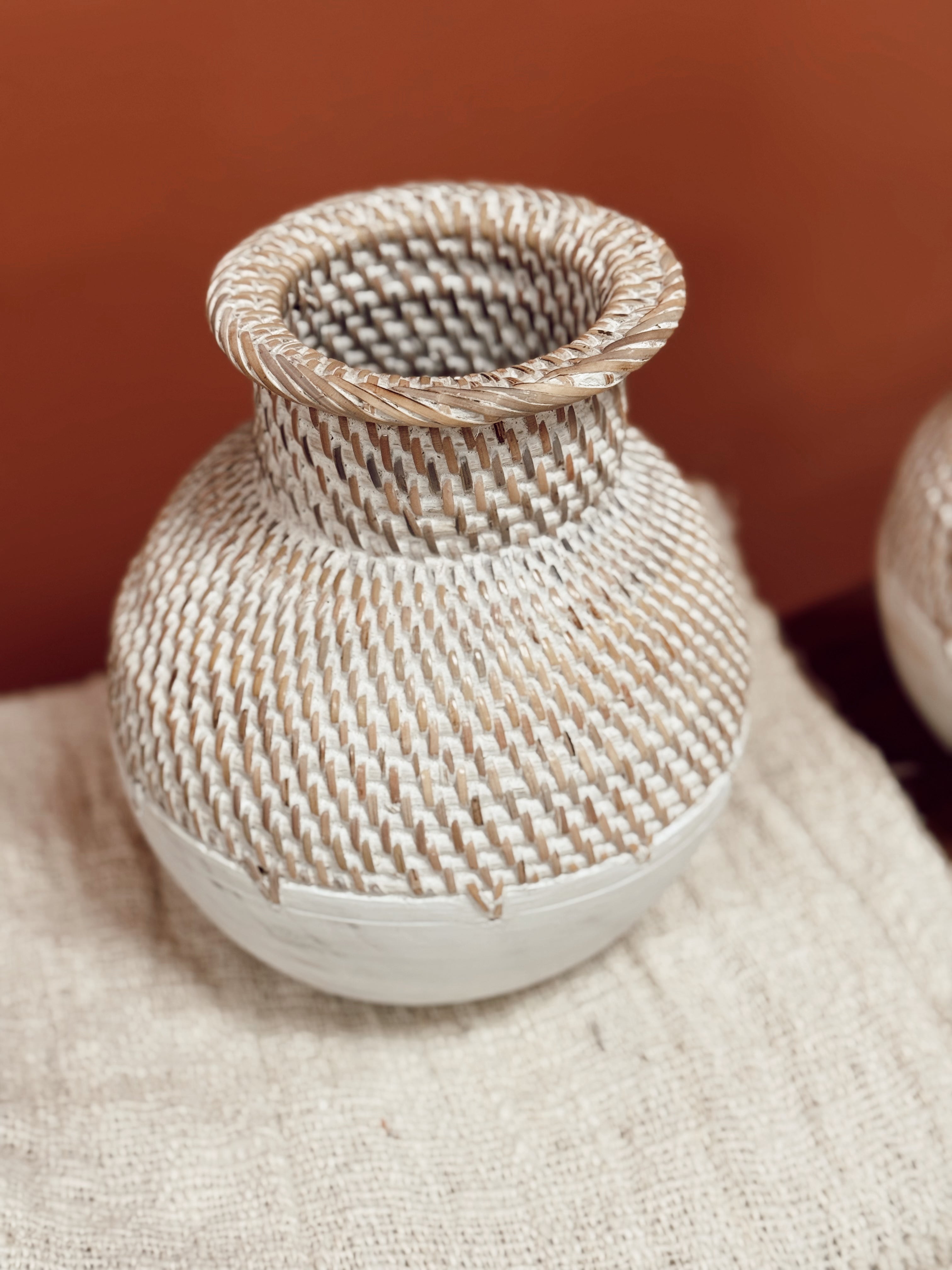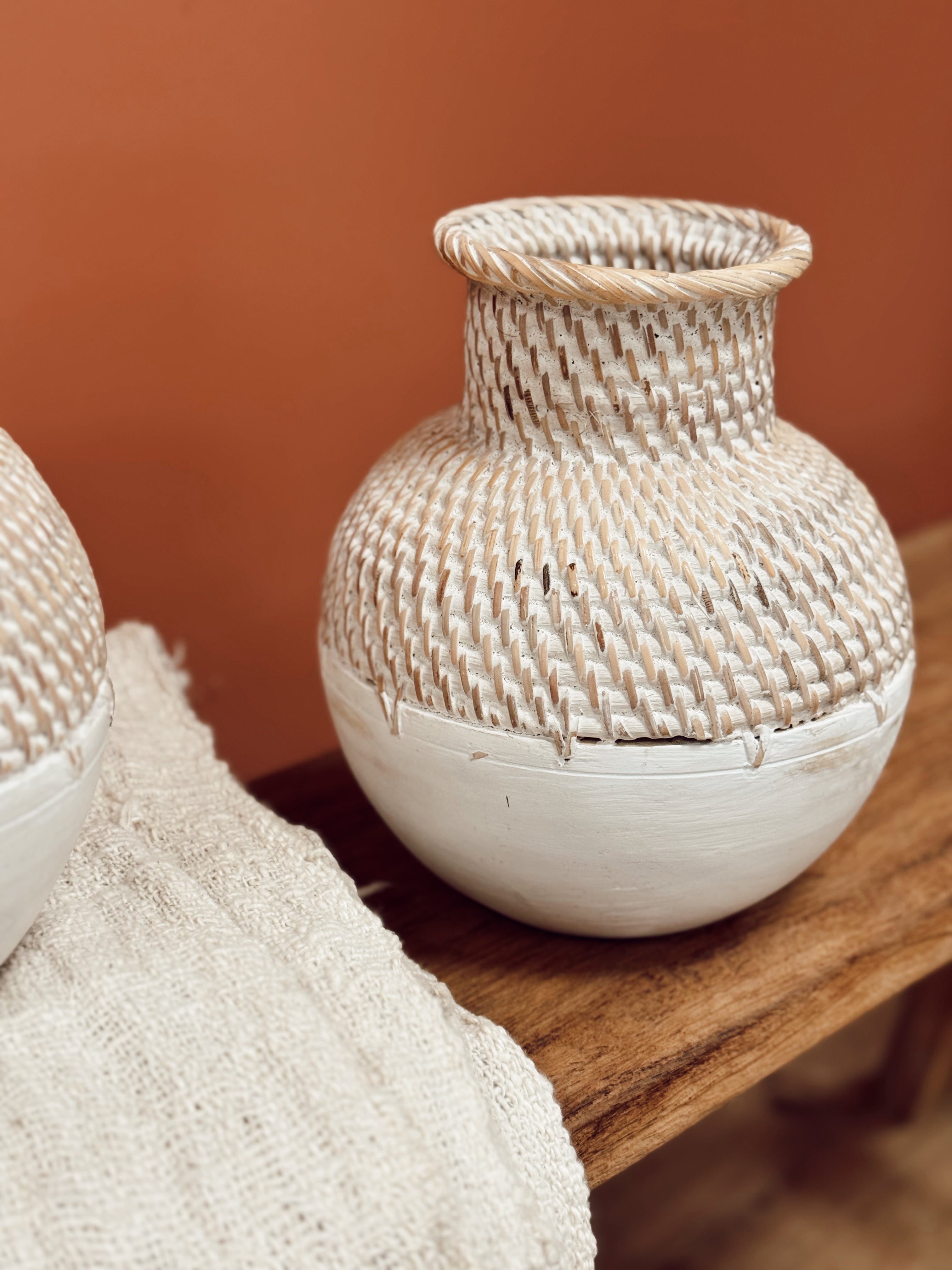 Élégant et épuré, ce vase décoratif associe bois patiné et tressage naturel pour une ambiance douce et artisanale. Il sublime vos intérieurs, avec ou sans fleurs.