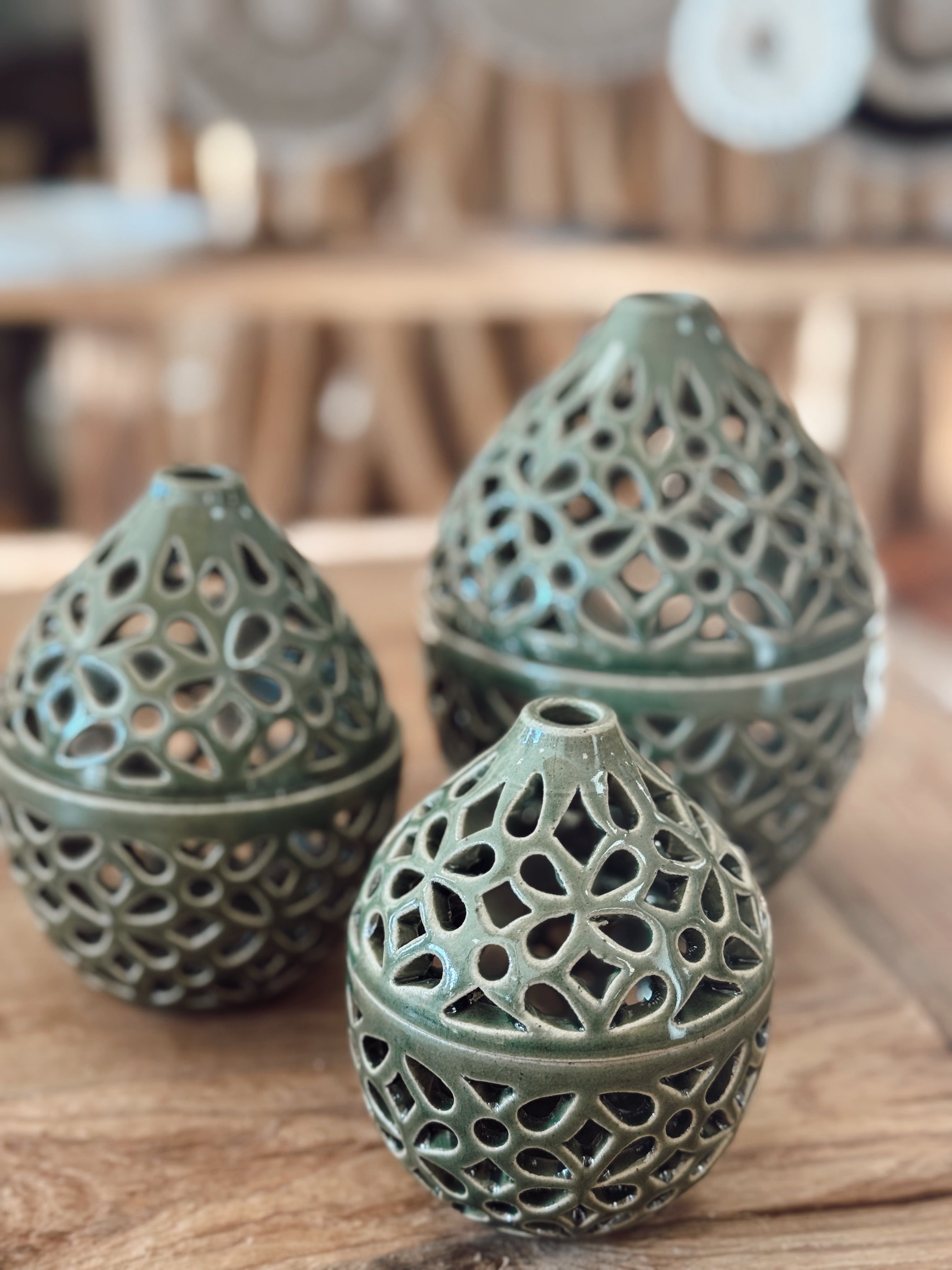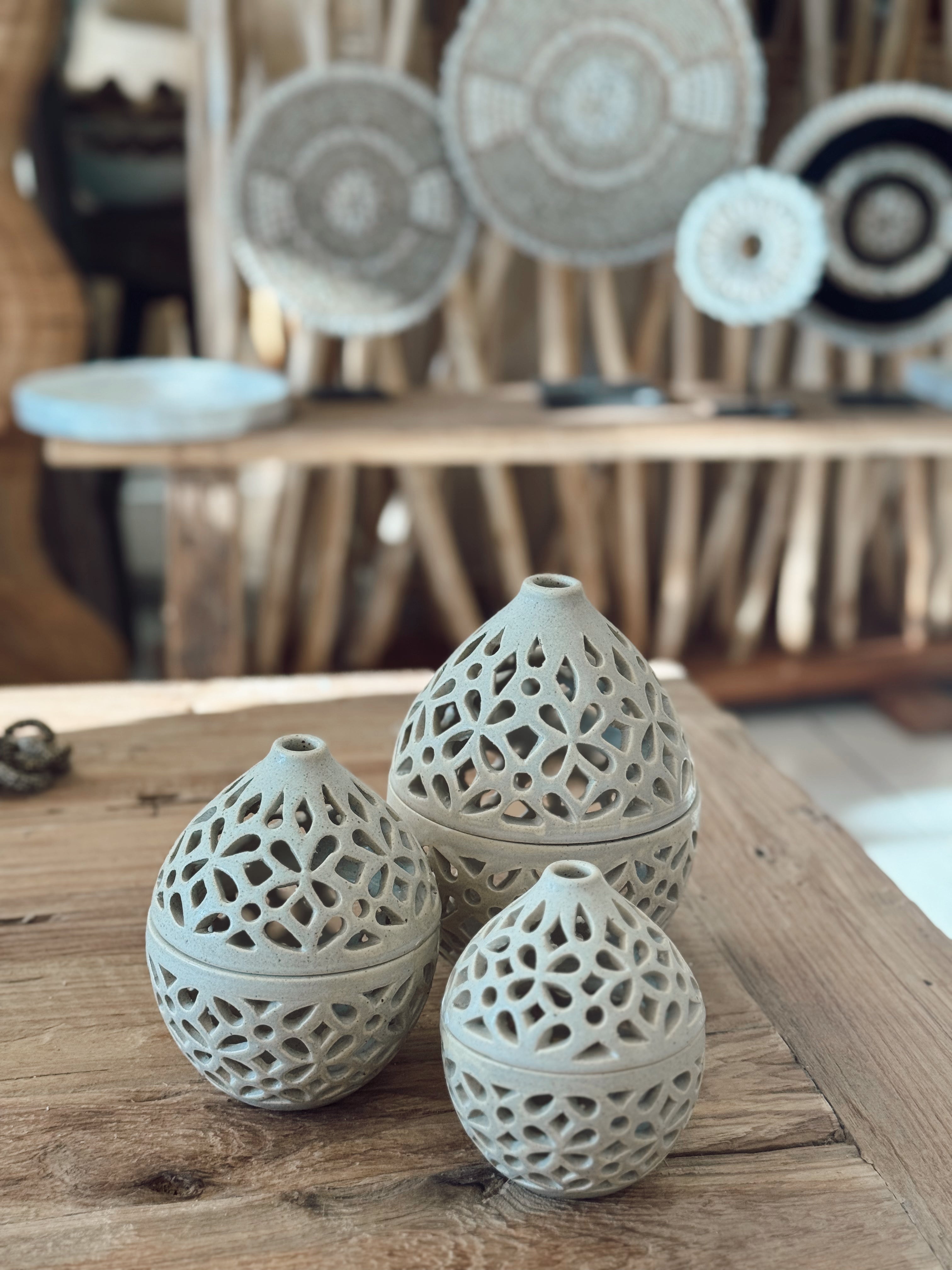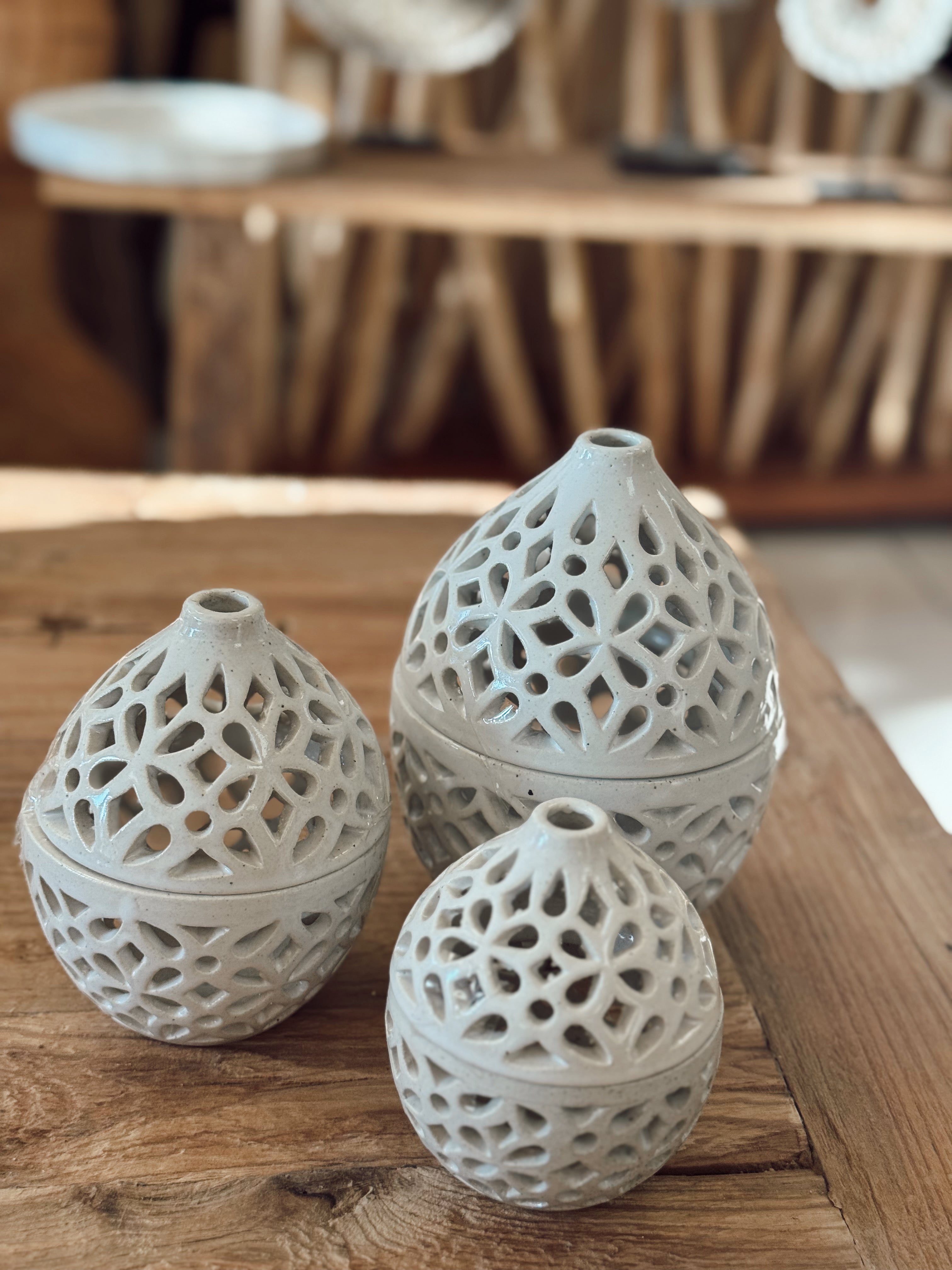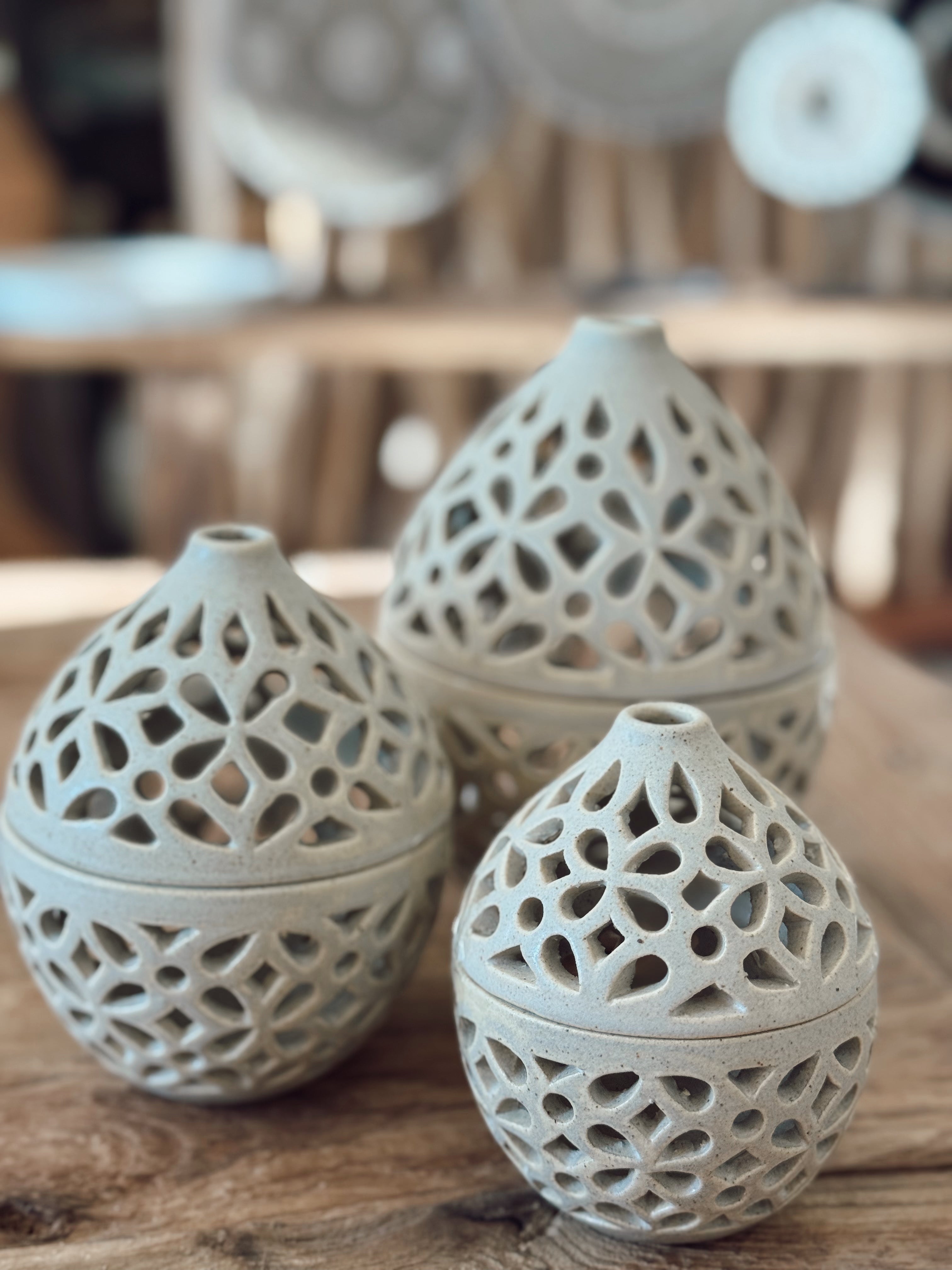 Un objet décoratif élégant qui allie beauté artisanale et ambiance apaisante. Ces diffuseurs en céramique ajourée accueillent vos cônes d’encens pour libérer une fumée douce et parfumée, tout en projetant de jolis motifs lumineux. Un incontournable pour créer une atmosphère zen et raffinée.
