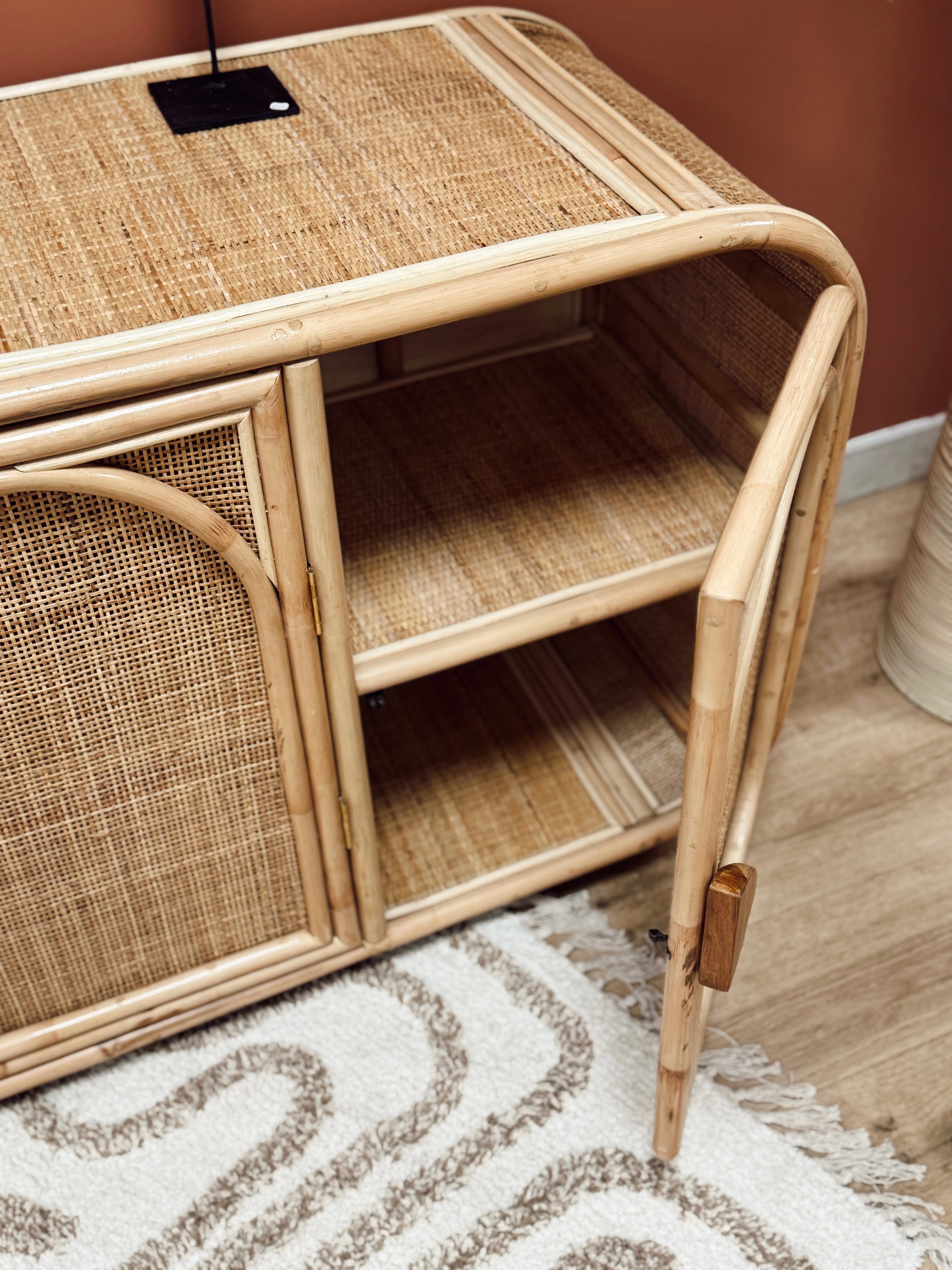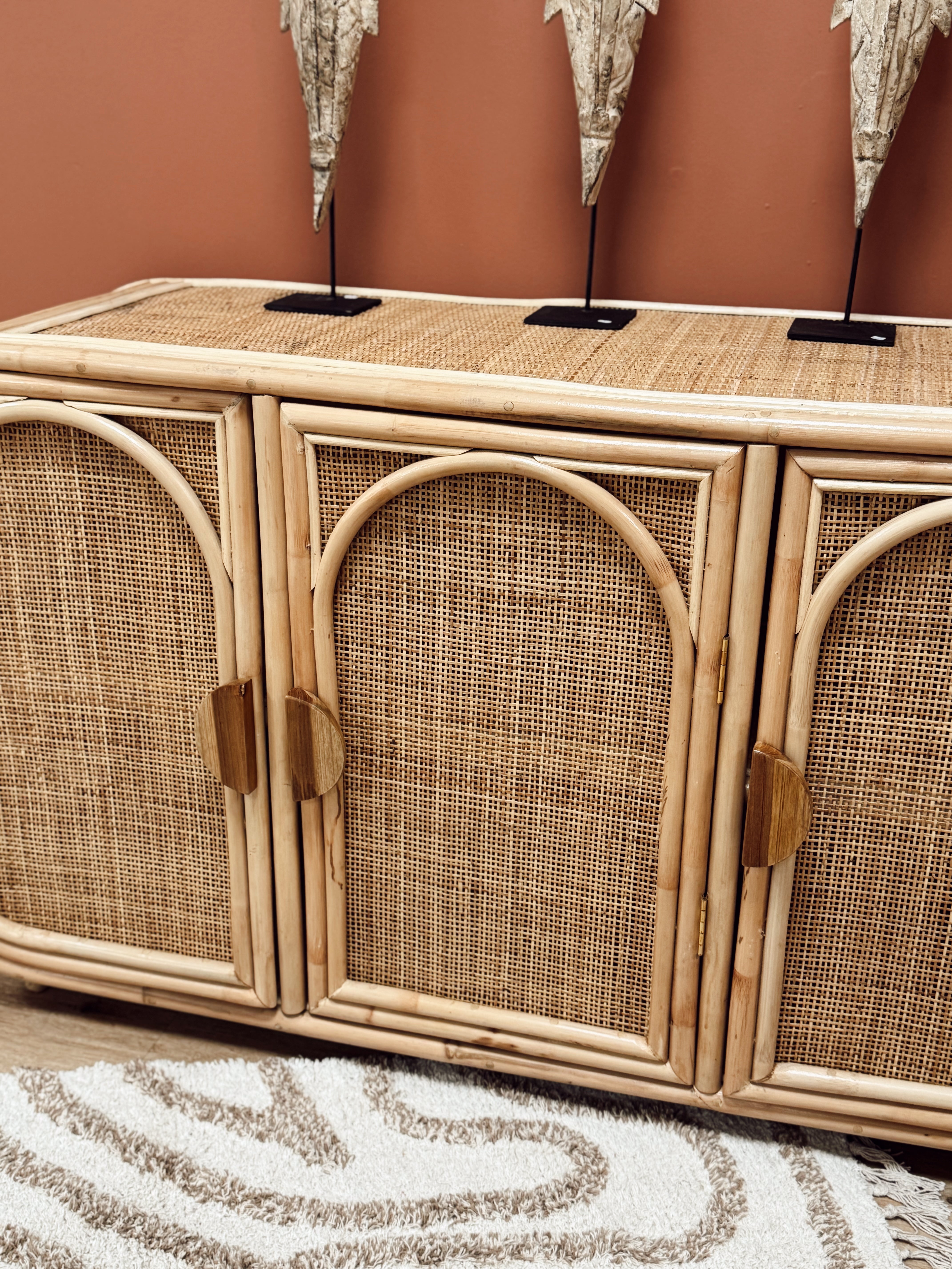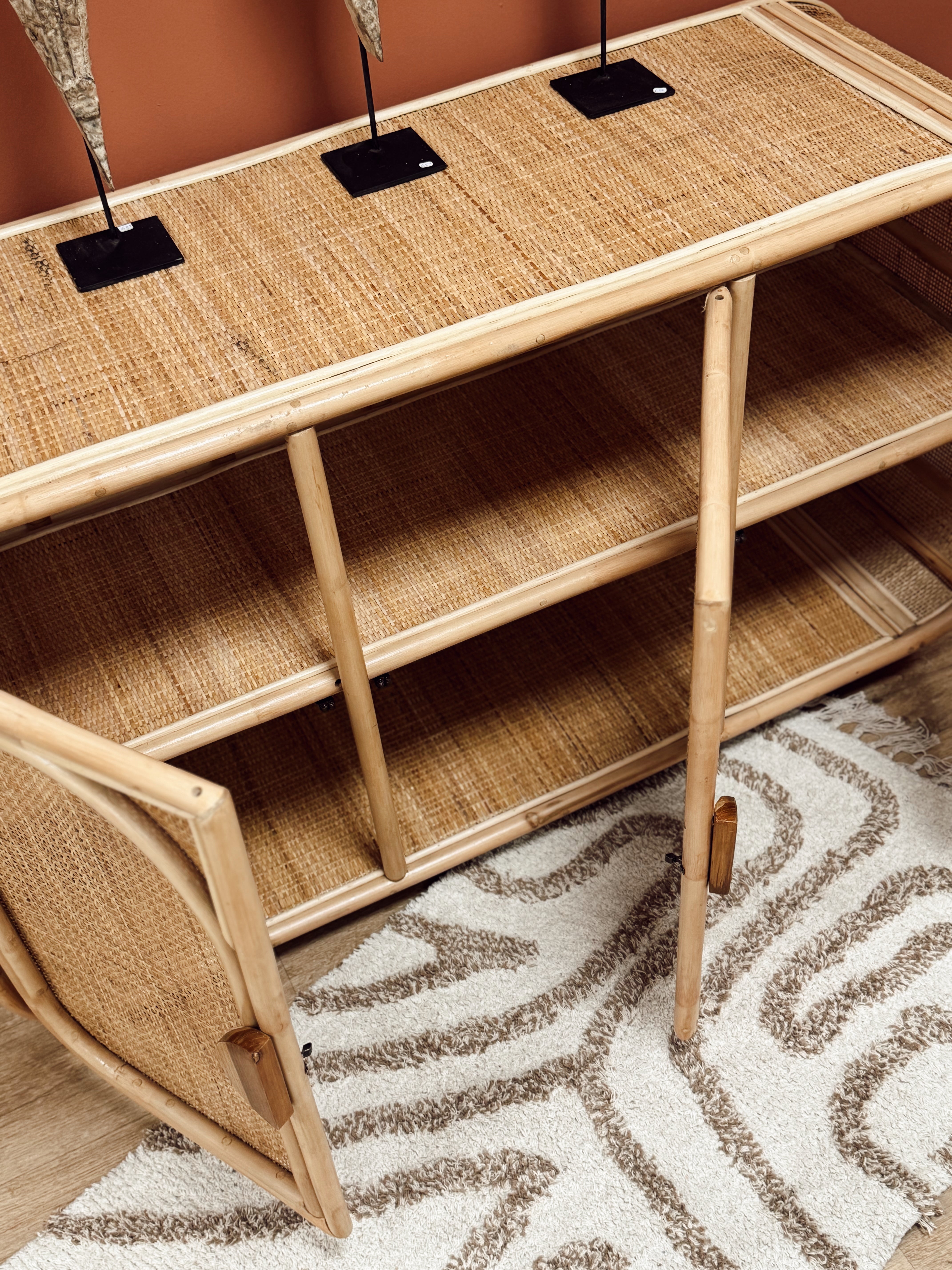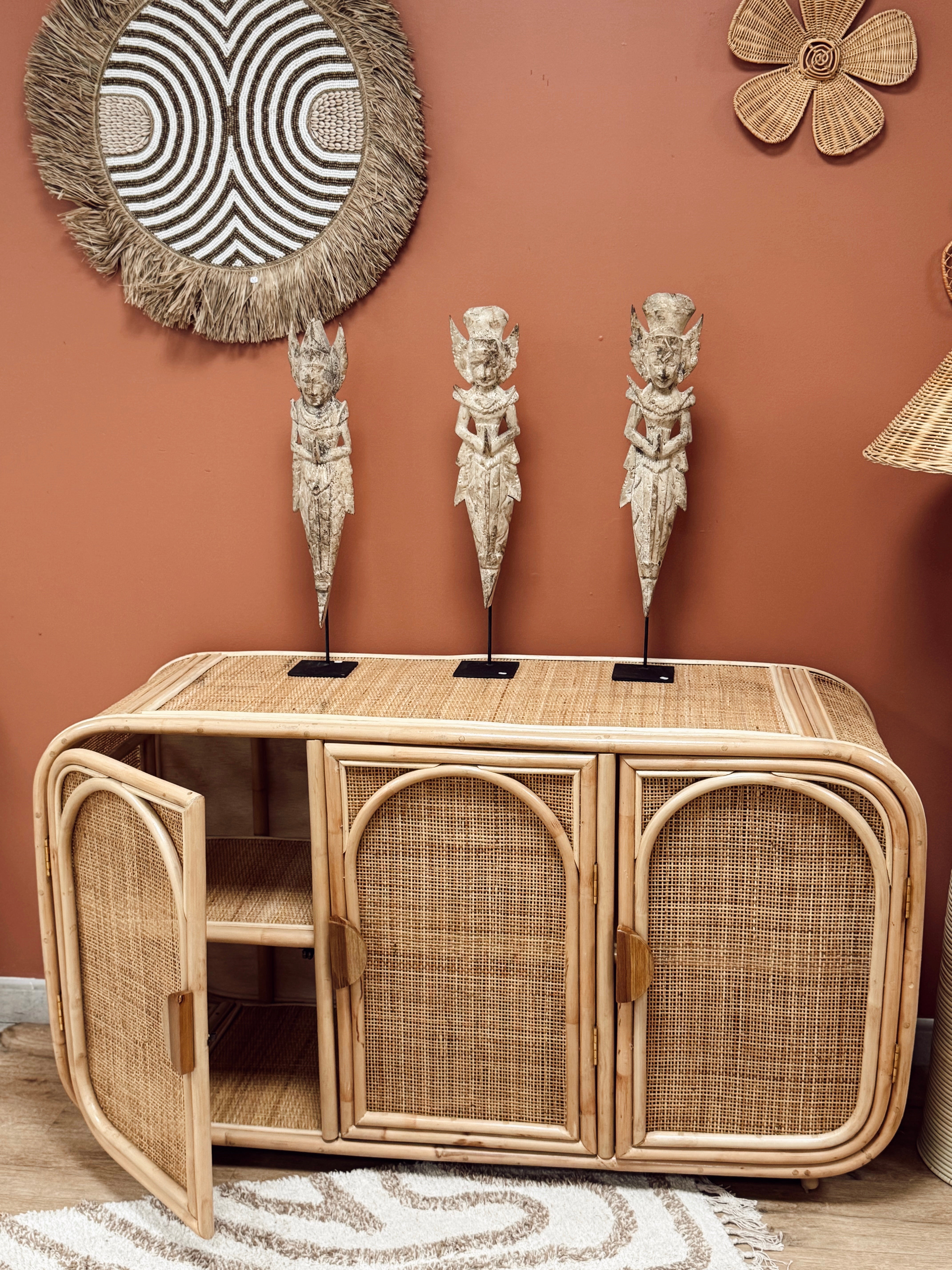 Avec ses courbes arrondies, ses portes en cannage et sa structure en rotin clair, le buffet Nusa incarne l'élégance des intérieurs balinais.