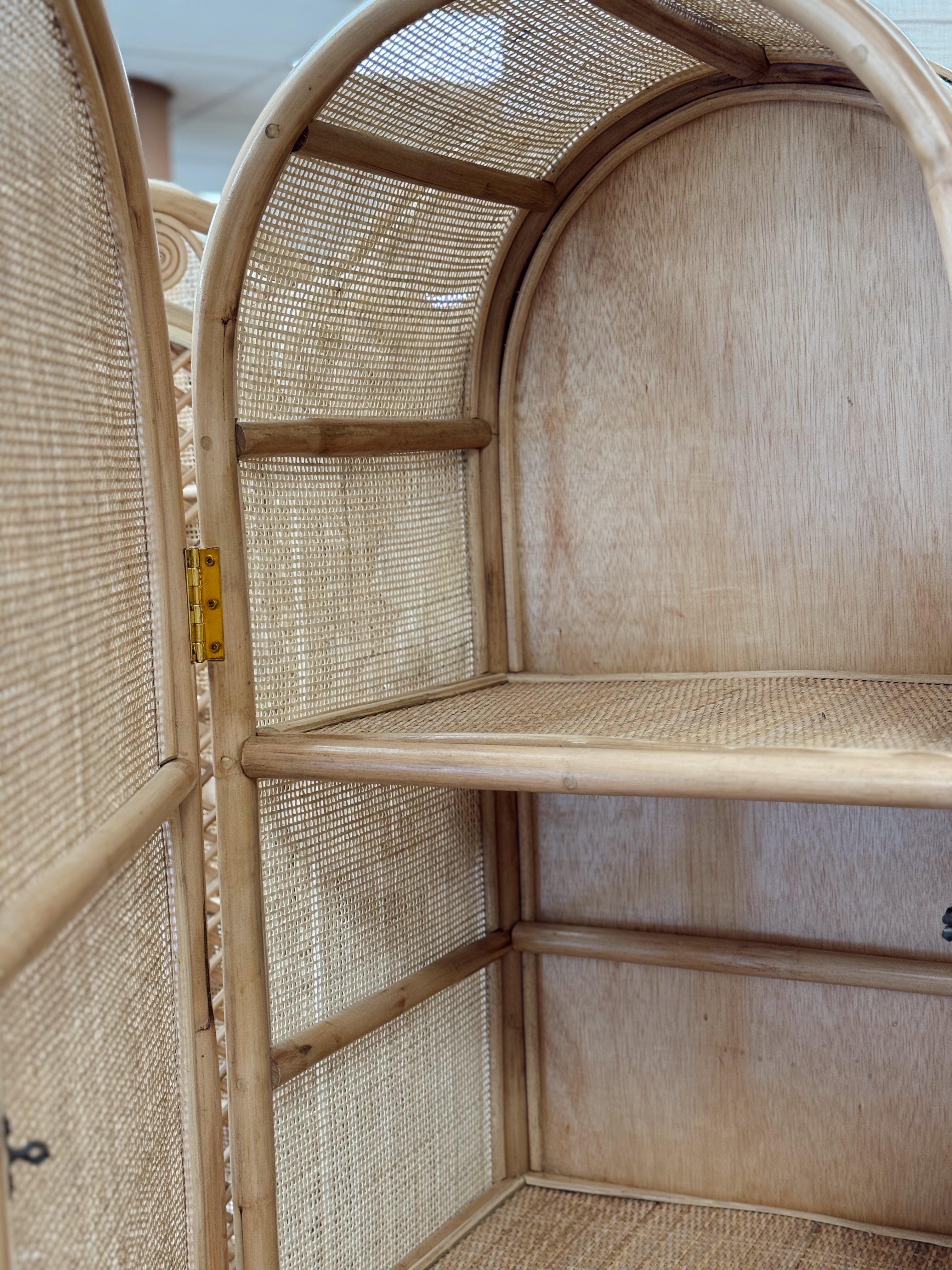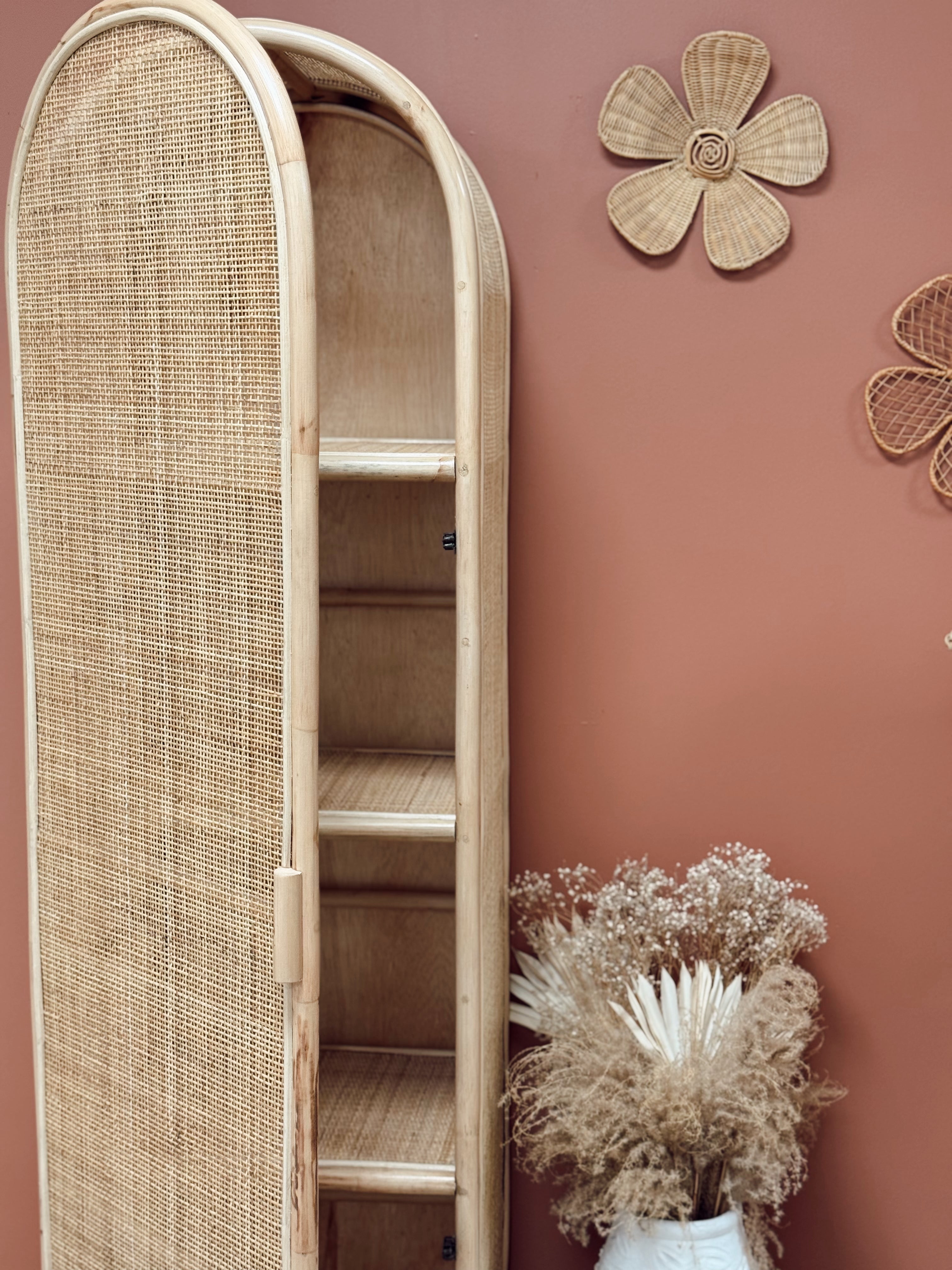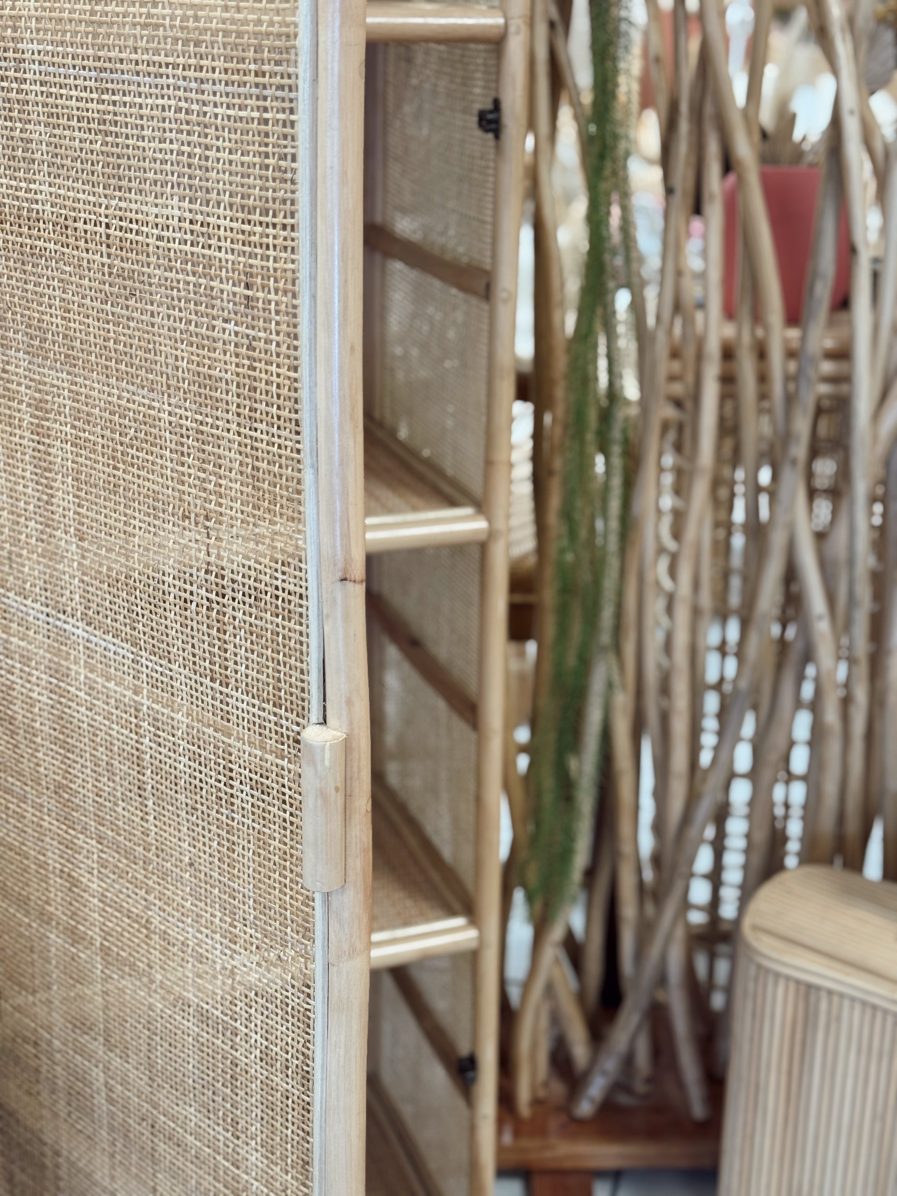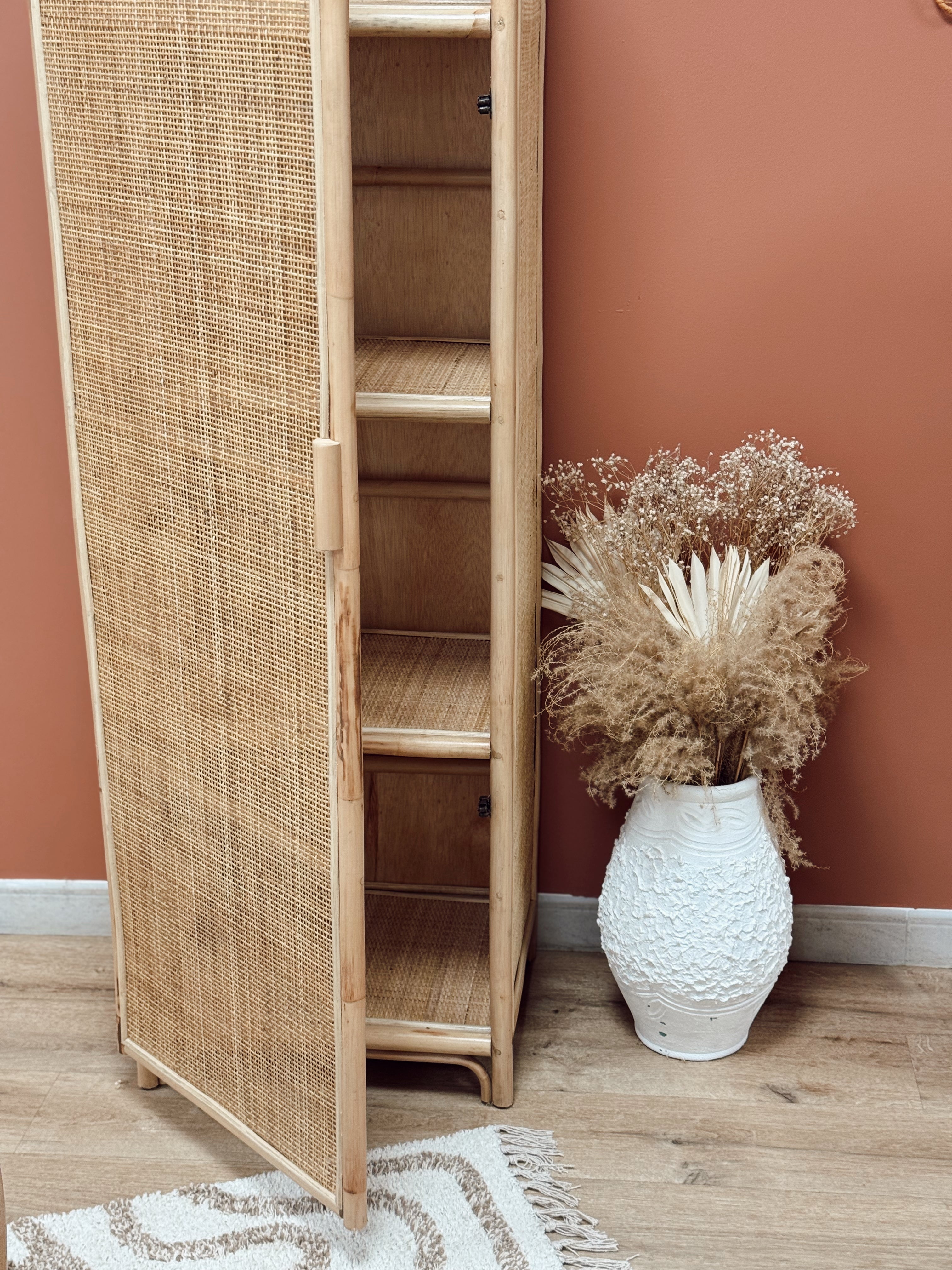 Ce cabinet en rotin séduit par ses lignes arrondies et son cannage ajouré, qui évoquent l’art de vivre balinais dans toute sa simplicité. Fabriqué à la main à Bali, il incarne le savoir-faire artisanal local et s’intègre avec élégance dans tous les intérieurs.