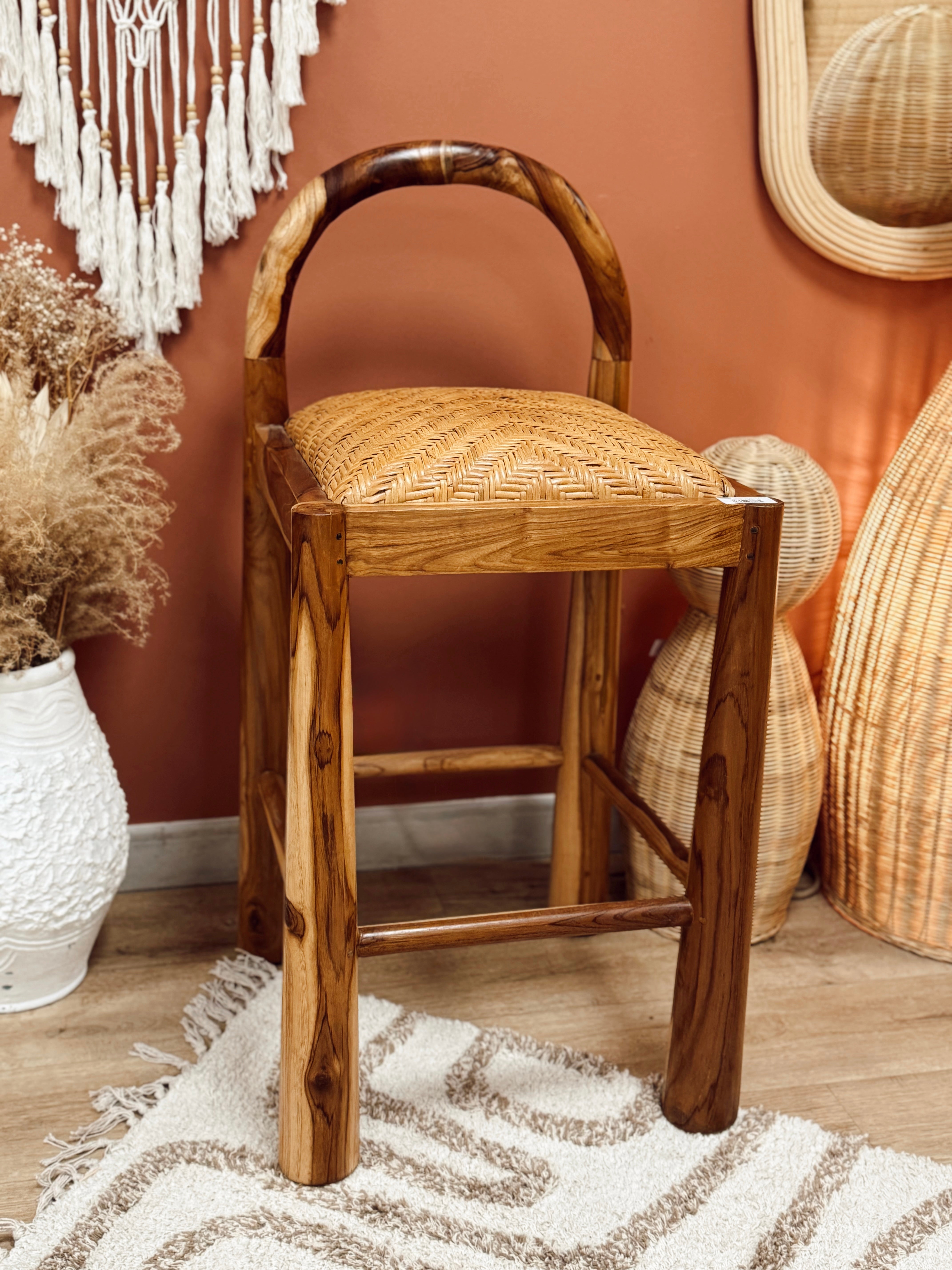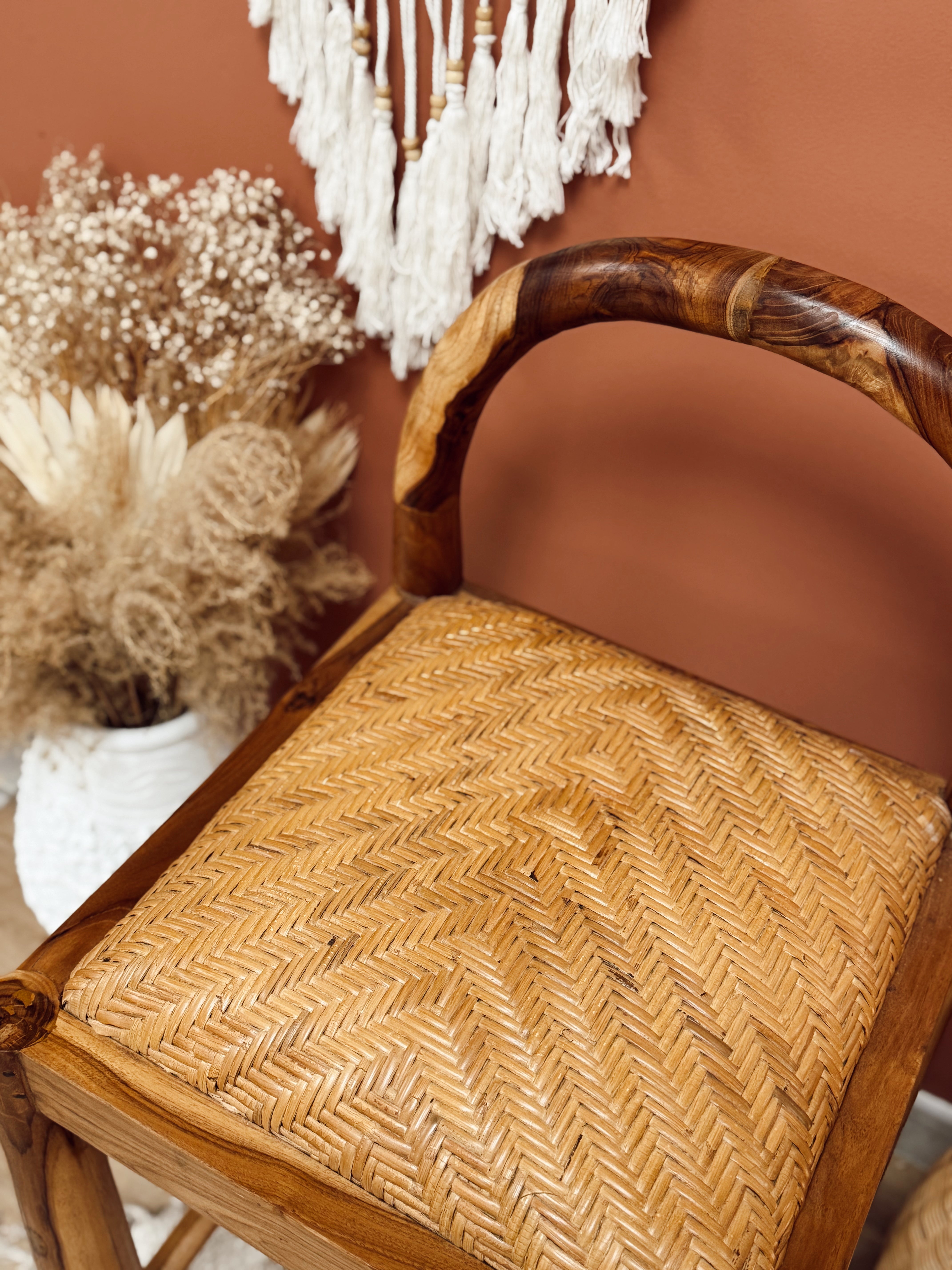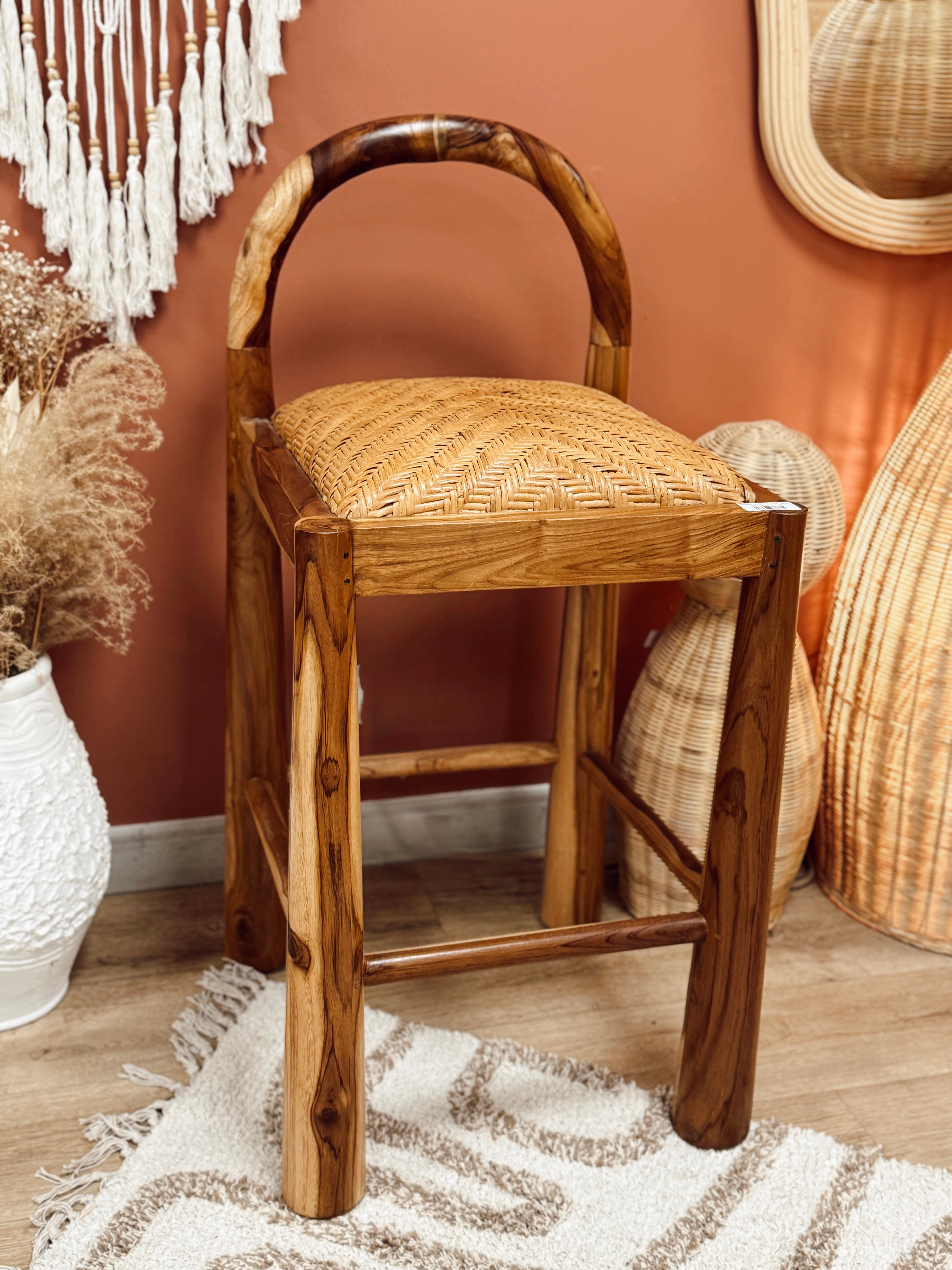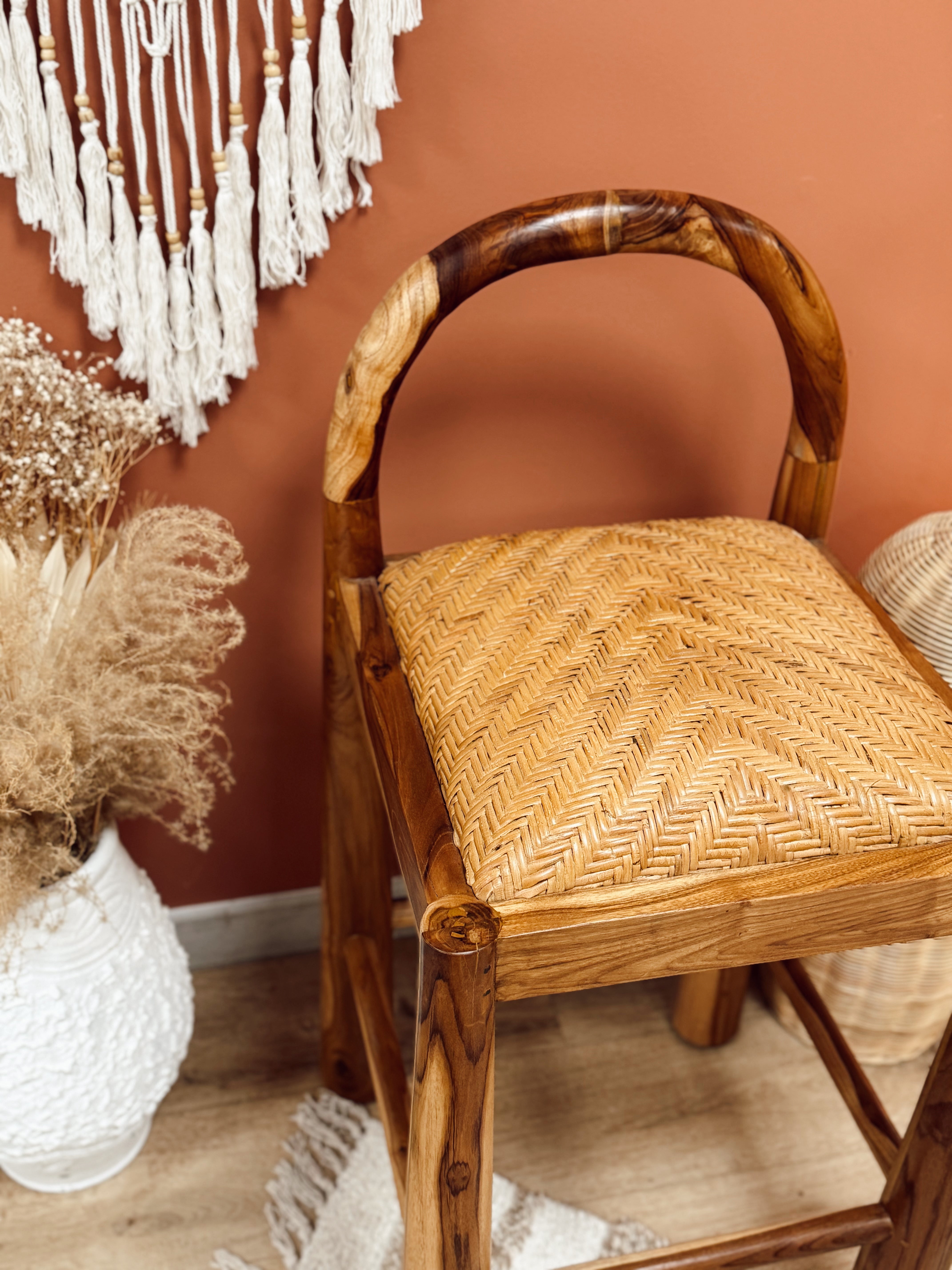 Avec sa silhouette robuste et son assise en rotin tressé, la chaise haute Tana allie charme authentique et confort naturel. Son dossier arrondi en bois massif ajoute une touche sculpturale à cette pièce idéale pour une cuisine ouverte, un îlot central ou un comptoir bar.