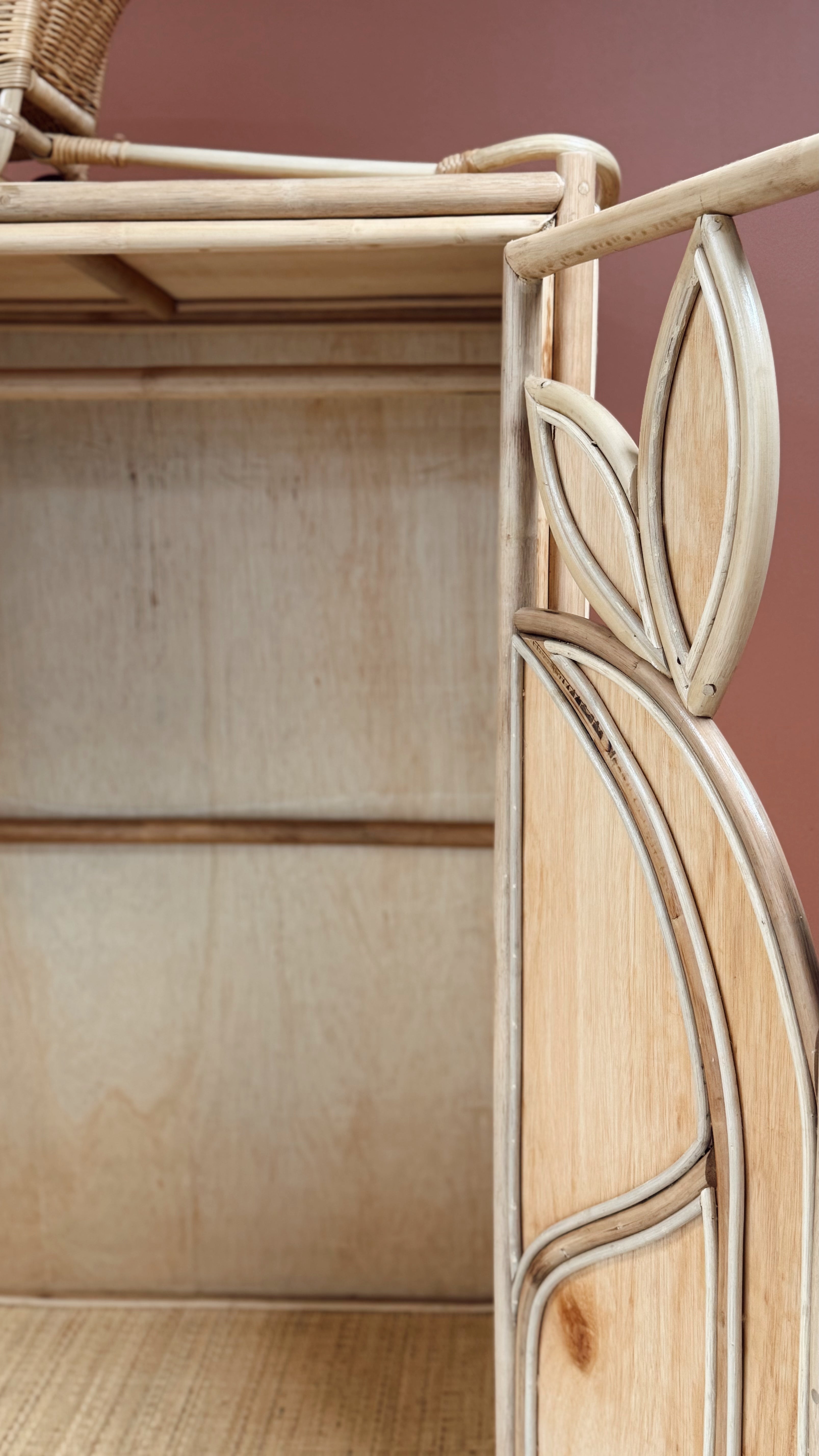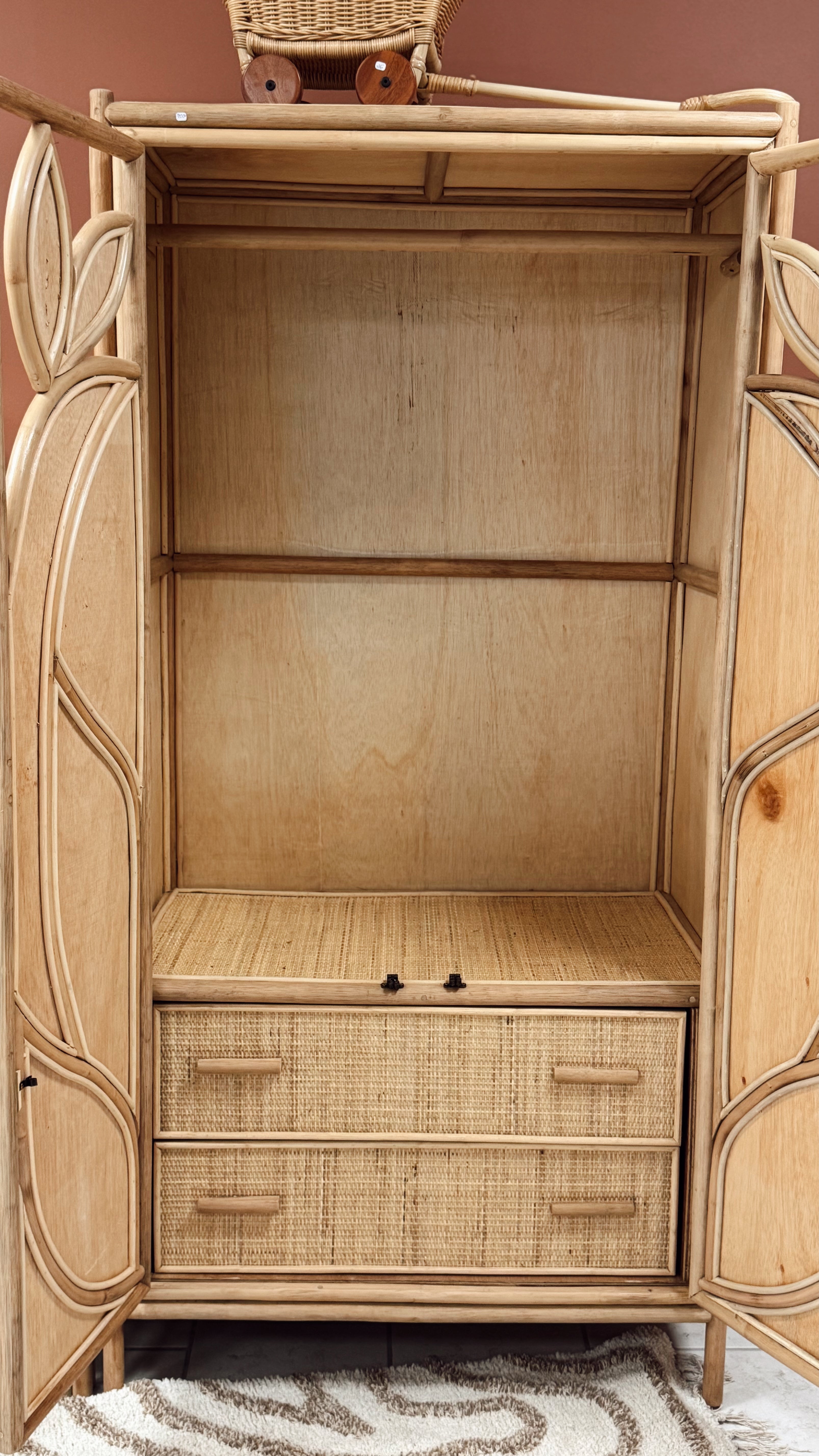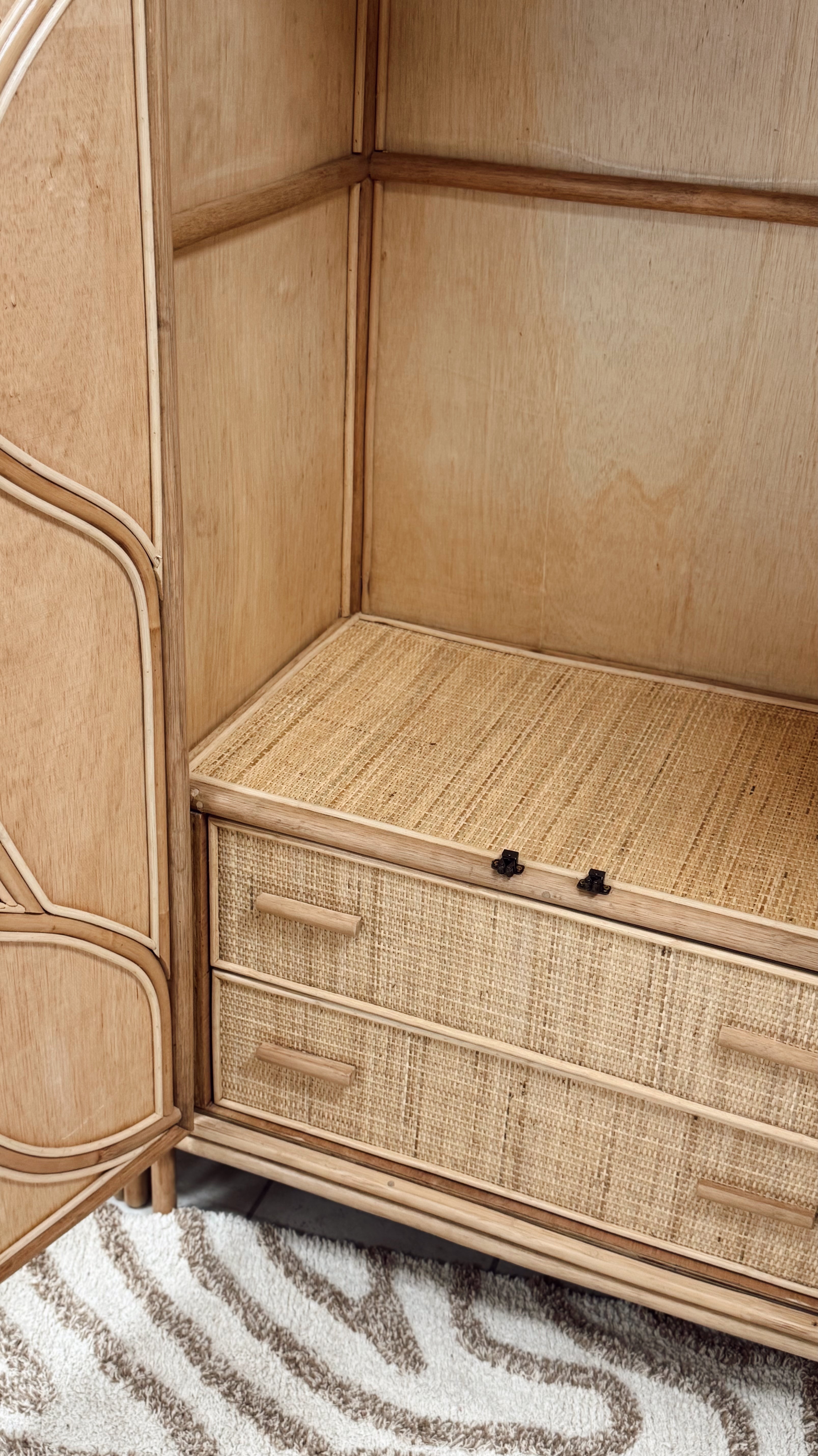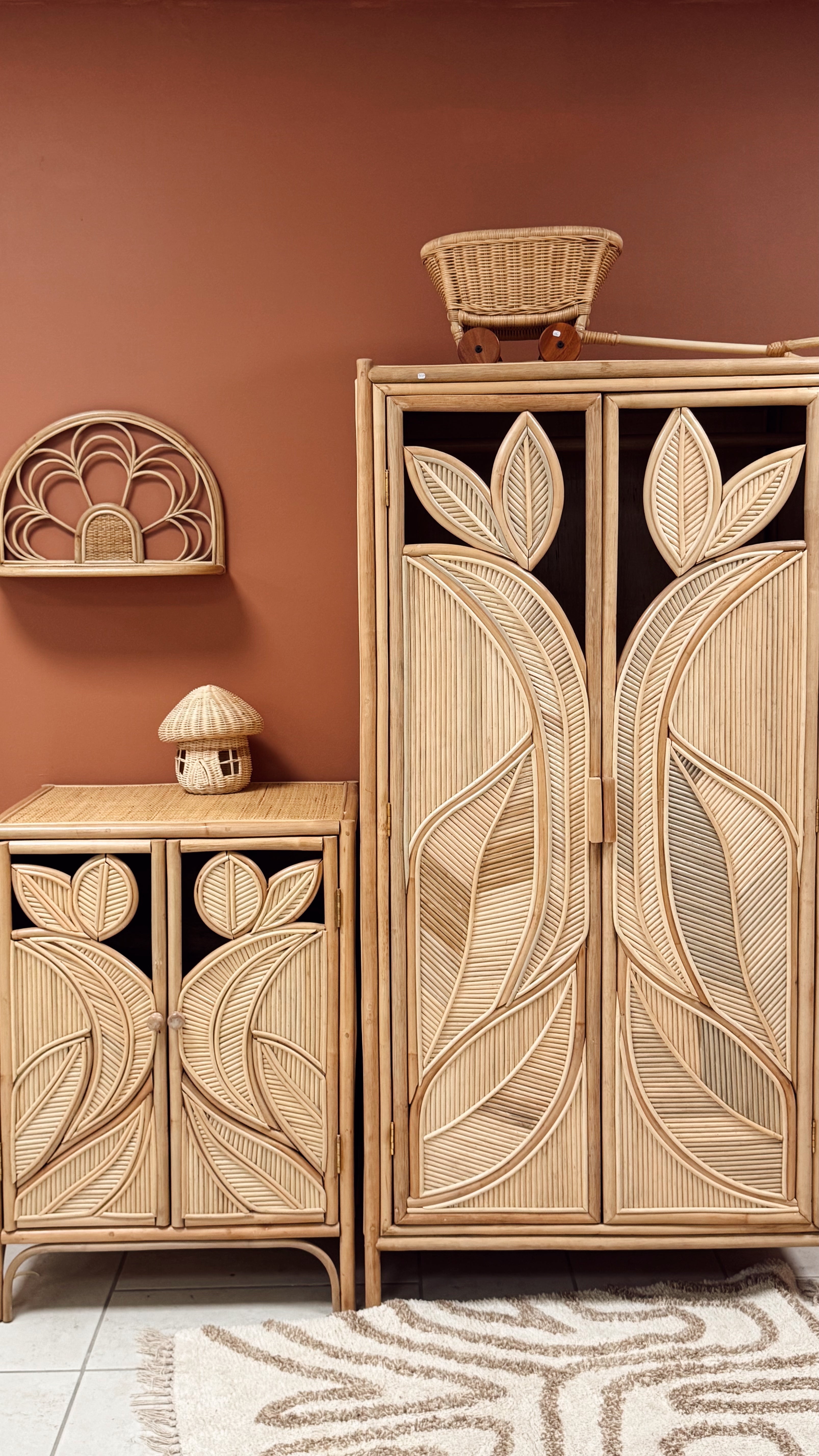Avec ses lignes sculptées et son tressage en relief, l’armoire June affirme son style tout en élégance. À l’intérieur : deux tiroirs spacieux, une penderie et un espace de rangement pour organiser vêtements ou linge de maison. Un modèle aussi fonctionnel qu’esthétique, pour sublimer une chambre d’enfant ou un intérieur bohème.
