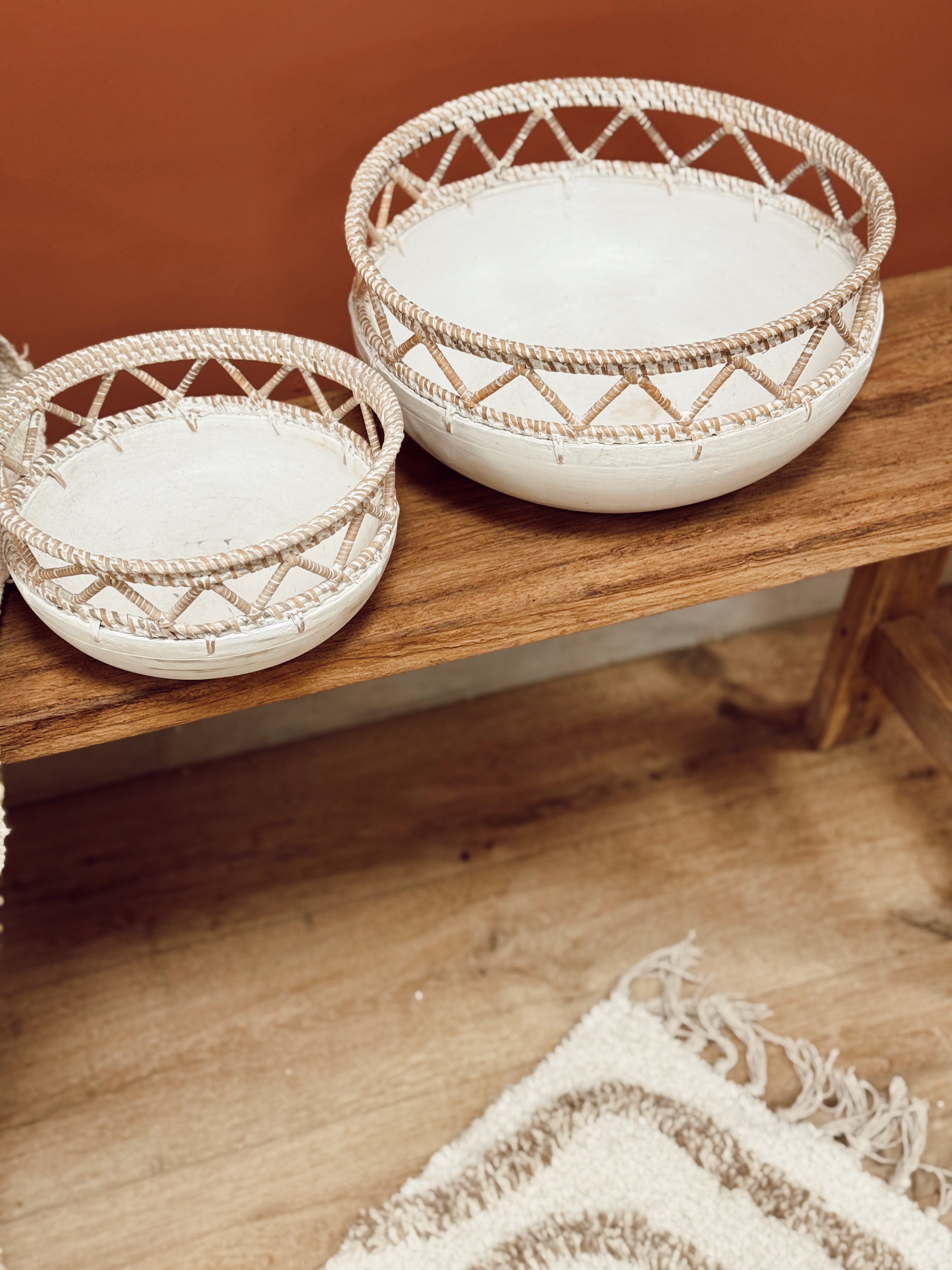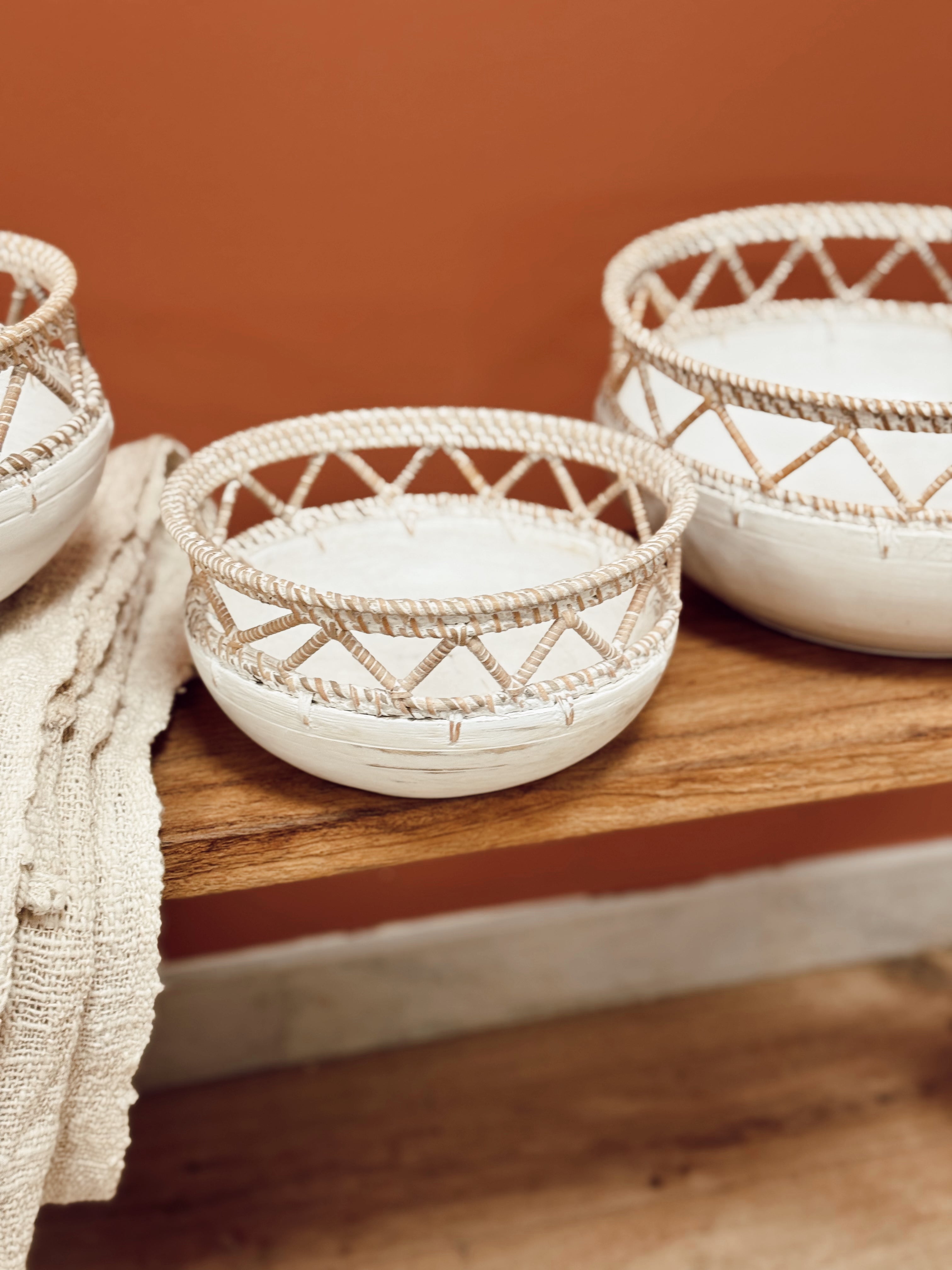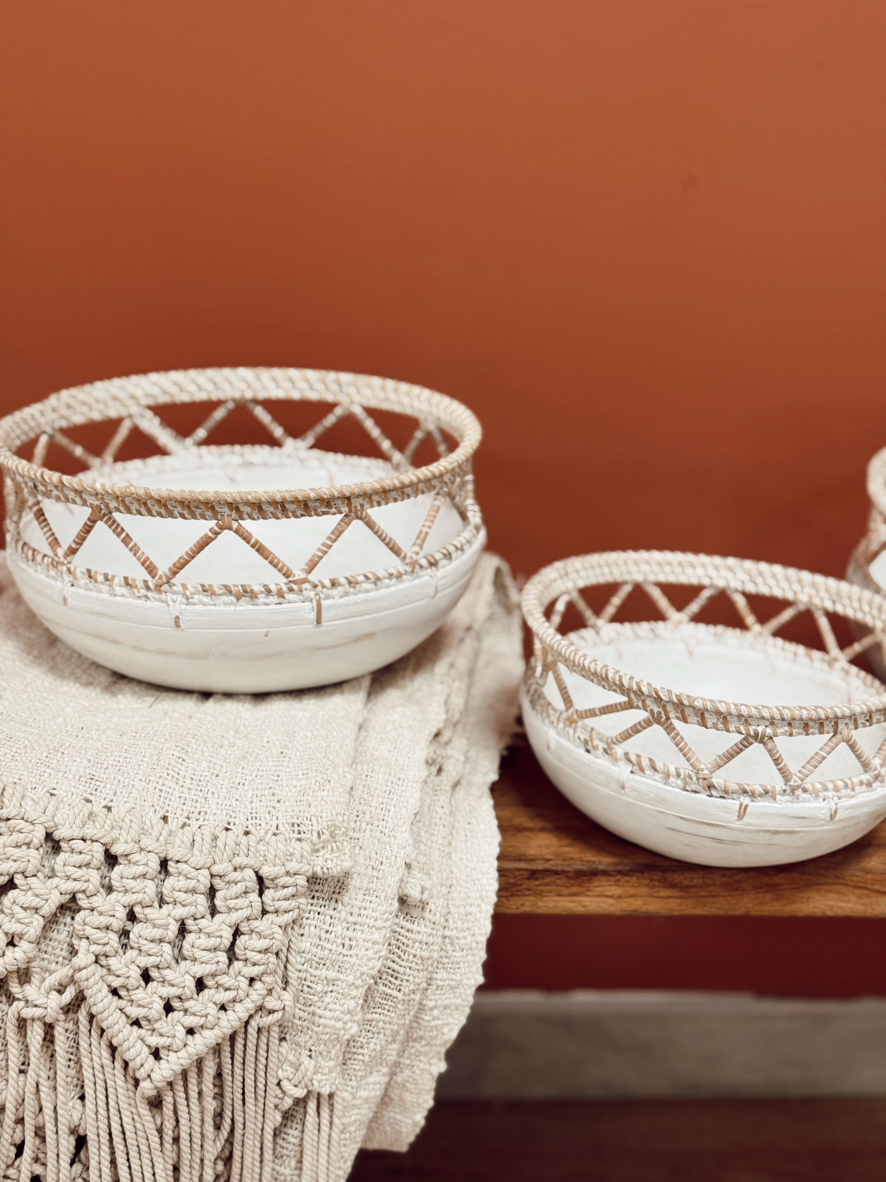 Chaque coupelle est fabriquée à la main à Bali. La base en bois est recouverte d'une peinture blanche mate, tandis que le bord supérieur est habillé d’un tressage ajouré en corde naturelle formant de jolis motifs géométriques.