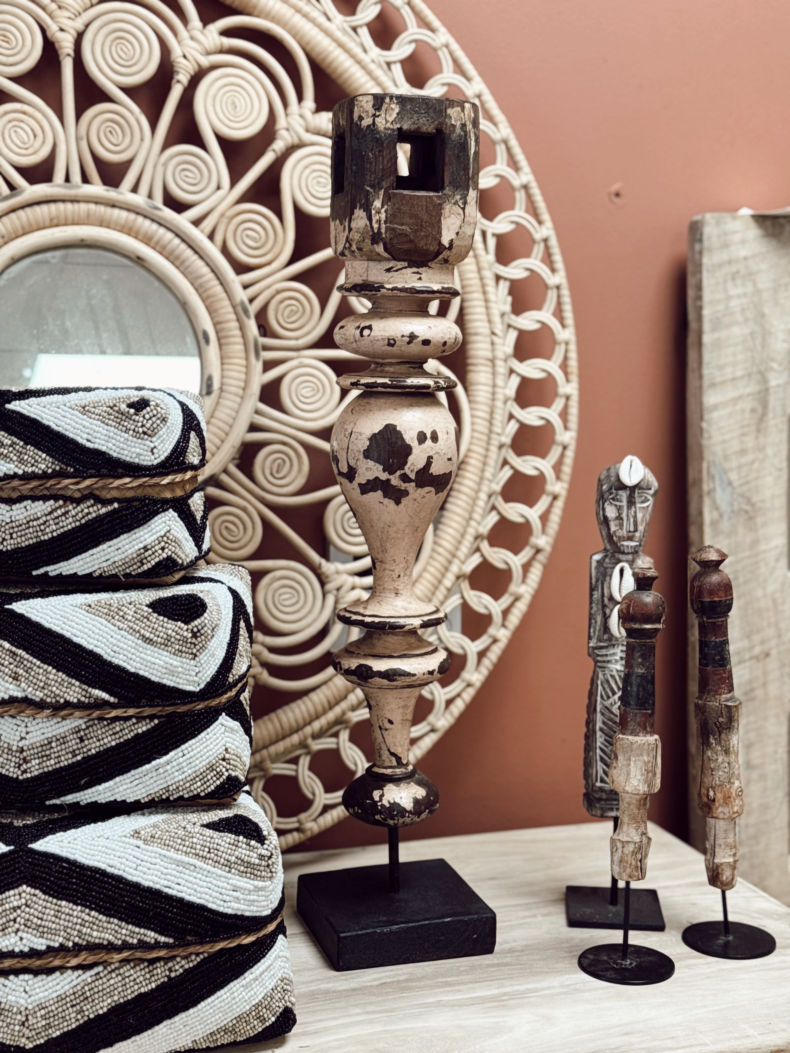 Cette pièce unique, entièrement sculptée à la main dans un bois ancien indien, incarne tout le charme brut et spirituel des objets de décoration authentiques. Un bougeoir sculptural, chargé d’histoire, parfait pour créer une ambiance chaleureuse et singulière dans votre intérieur.