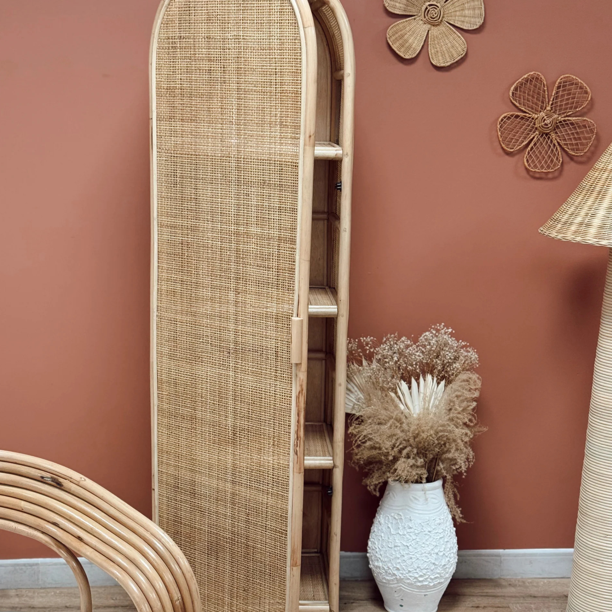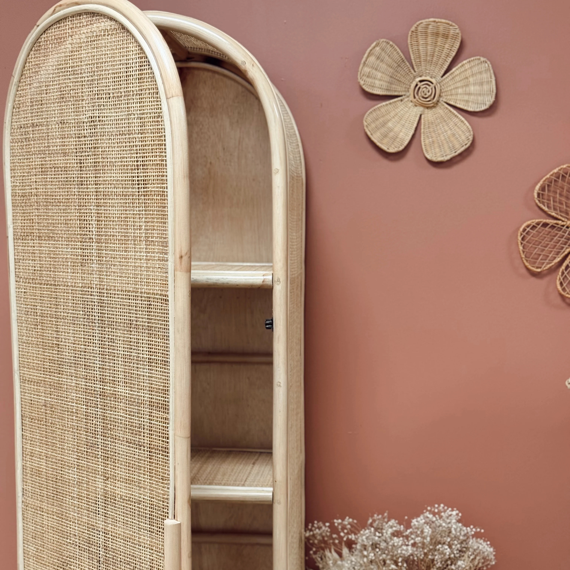 Ce cabinet en rotin séduit par ses lignes arrondies et son cannage ajouré, qui évoquent l’art de vivre balinais dans toute sa simplicité. Fabriqué à la main à Bali, il incarne le savoir-faire artisanal local et s’intègre avec élégance dans tous les intérieurs.