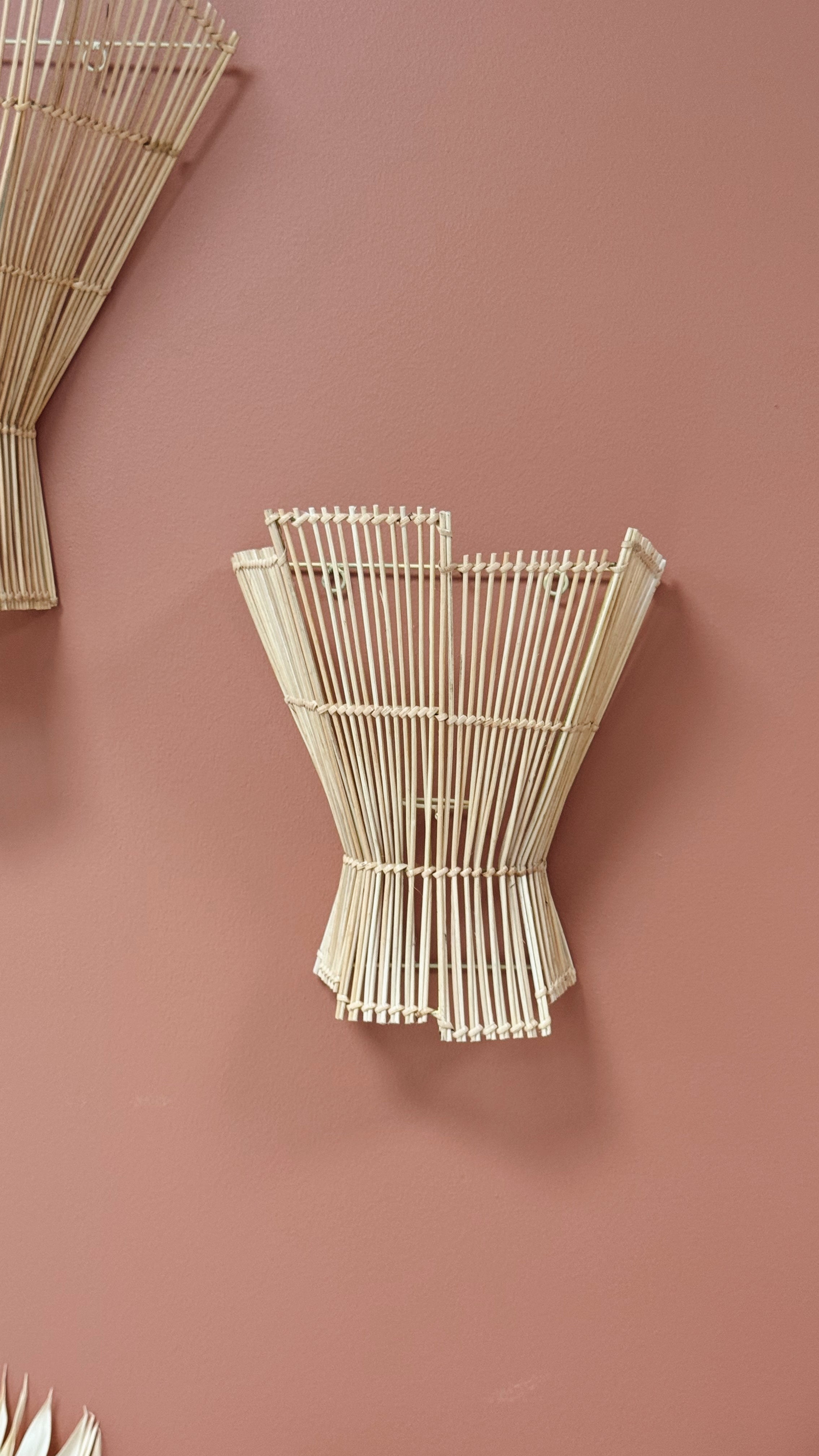 L’applique Kirana, entièrement tressée à la main en rotin naturel, diffuse une lumière douce et chaleureuse tout en habillant le mur d’un motif graphique inspiré des éventails ou des fleurs séchées. Parfaite pour créer une ambiance bohème, naturelle et apaisante dans une chambre, un salon ou une entrée.