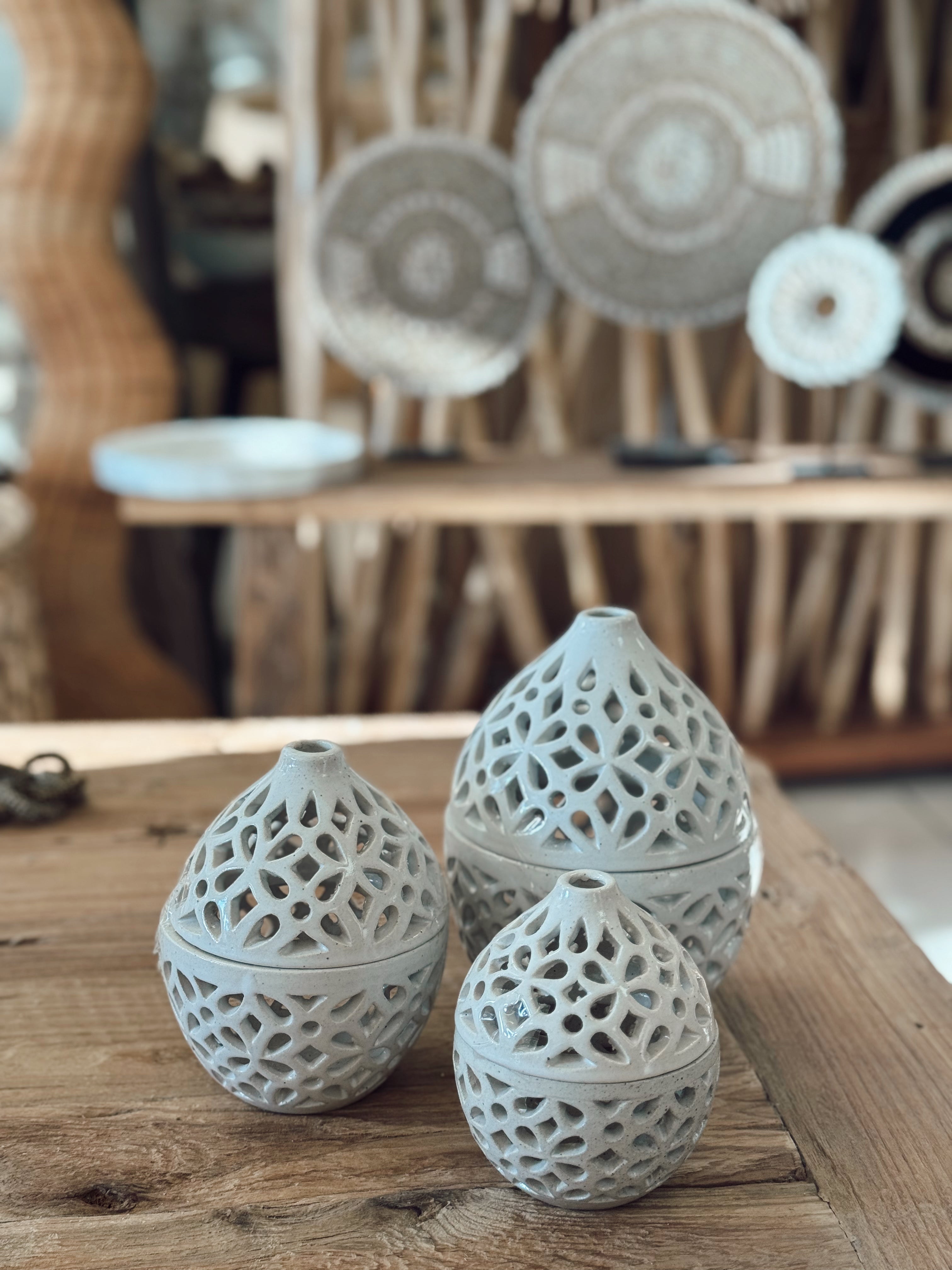 Un objet décoratif élégant qui allie beauté artisanale et ambiance apaisante. Ces diffuseurs en céramique ajourée accueillent vos cônes d’encens pour libérer une fumée douce et parfumée, tout en projetant de jolis motifs lumineux. Un incontournable pour créer une atmosphère zen et raffinée.