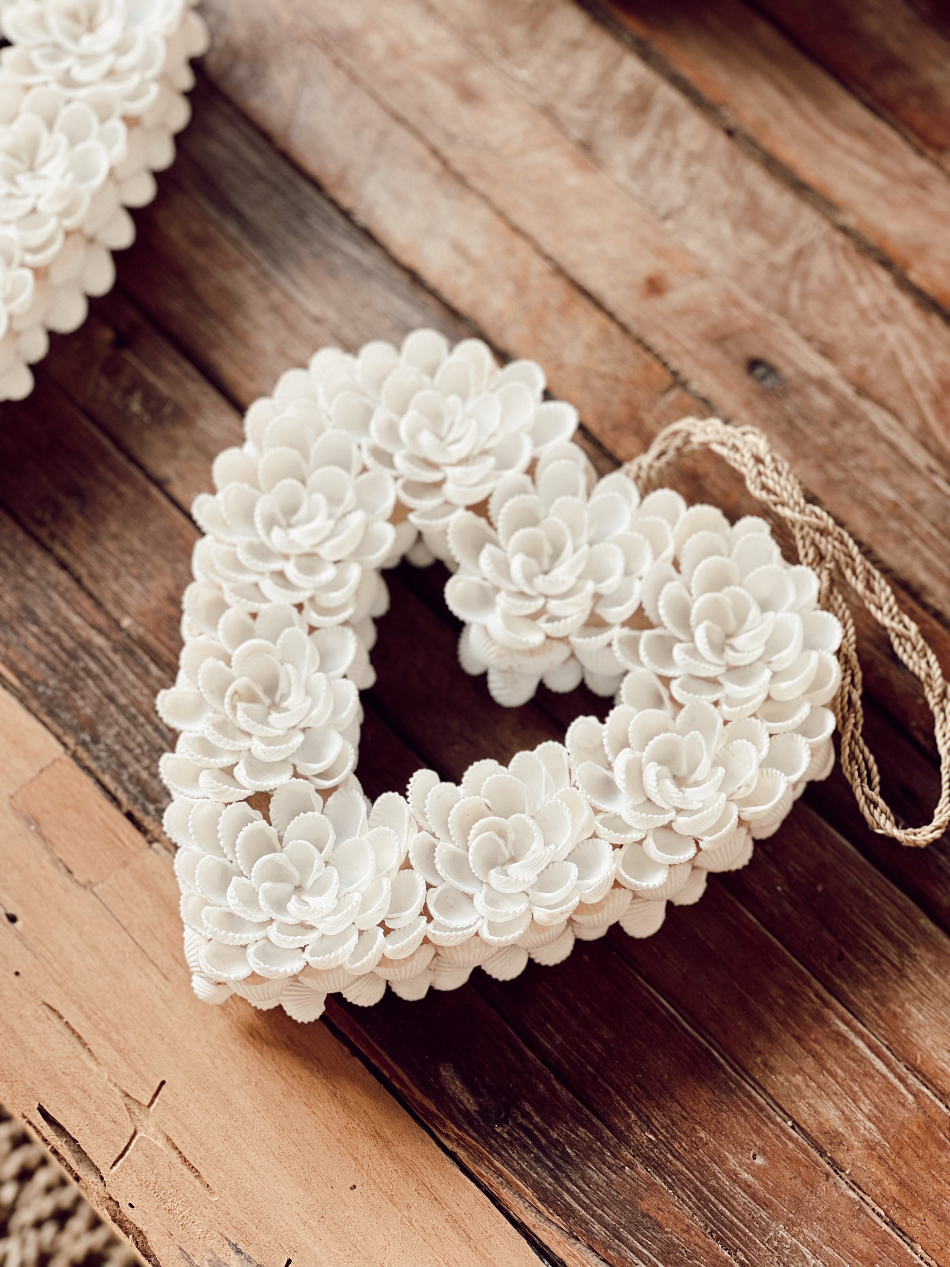 Chaque coquillage forme une rosace qui donne du relief et de l’élégance à l’ensemble. Accroché par un cordon tressé, ce cœur suspendu apporte une touche douce, marine et solaire à votre décoration.