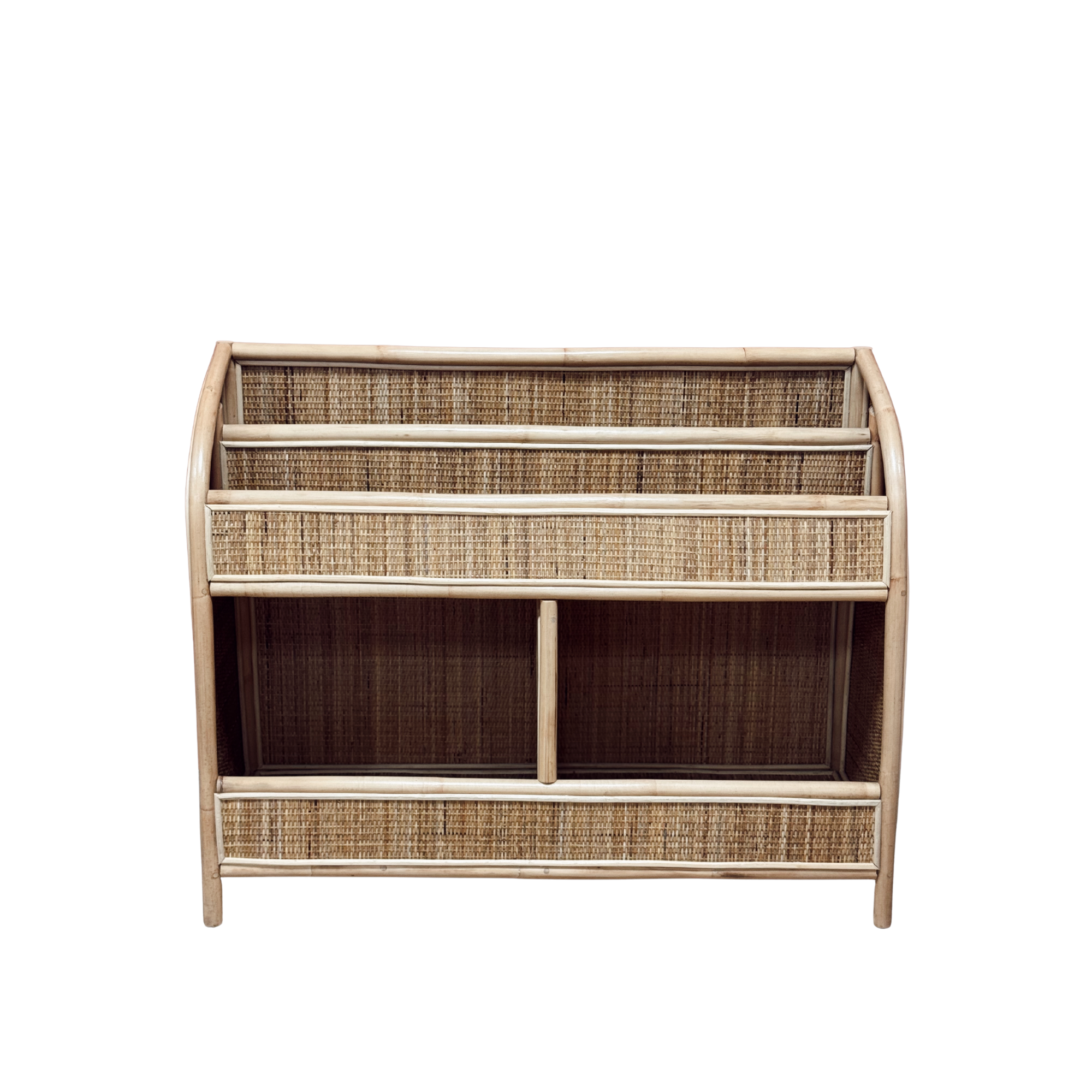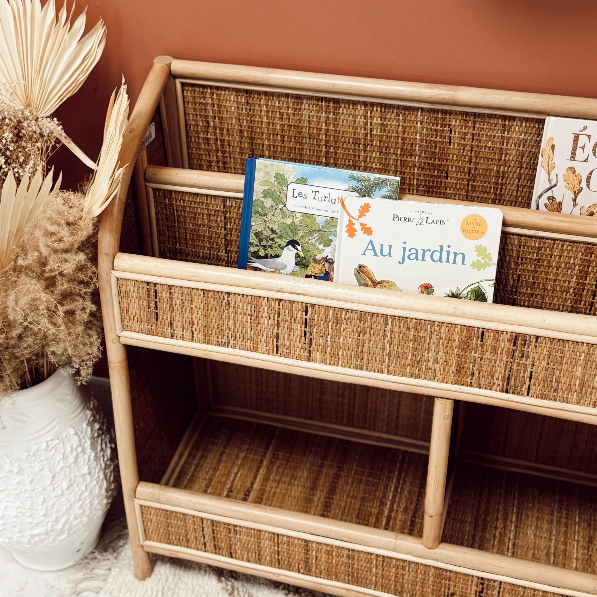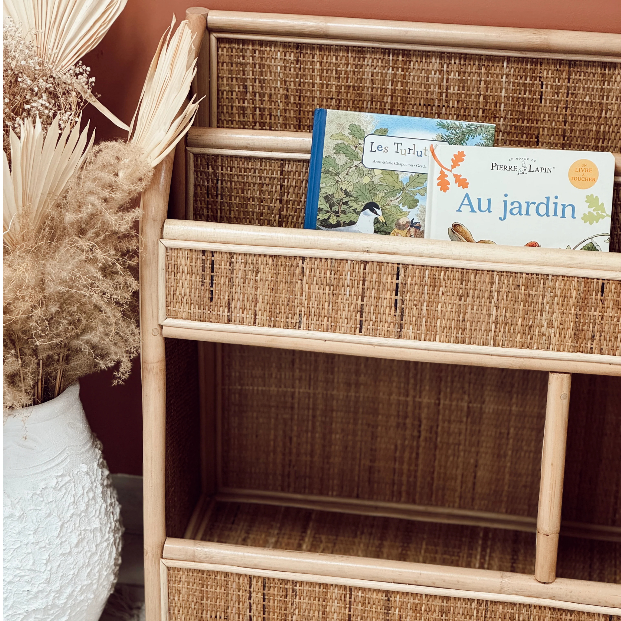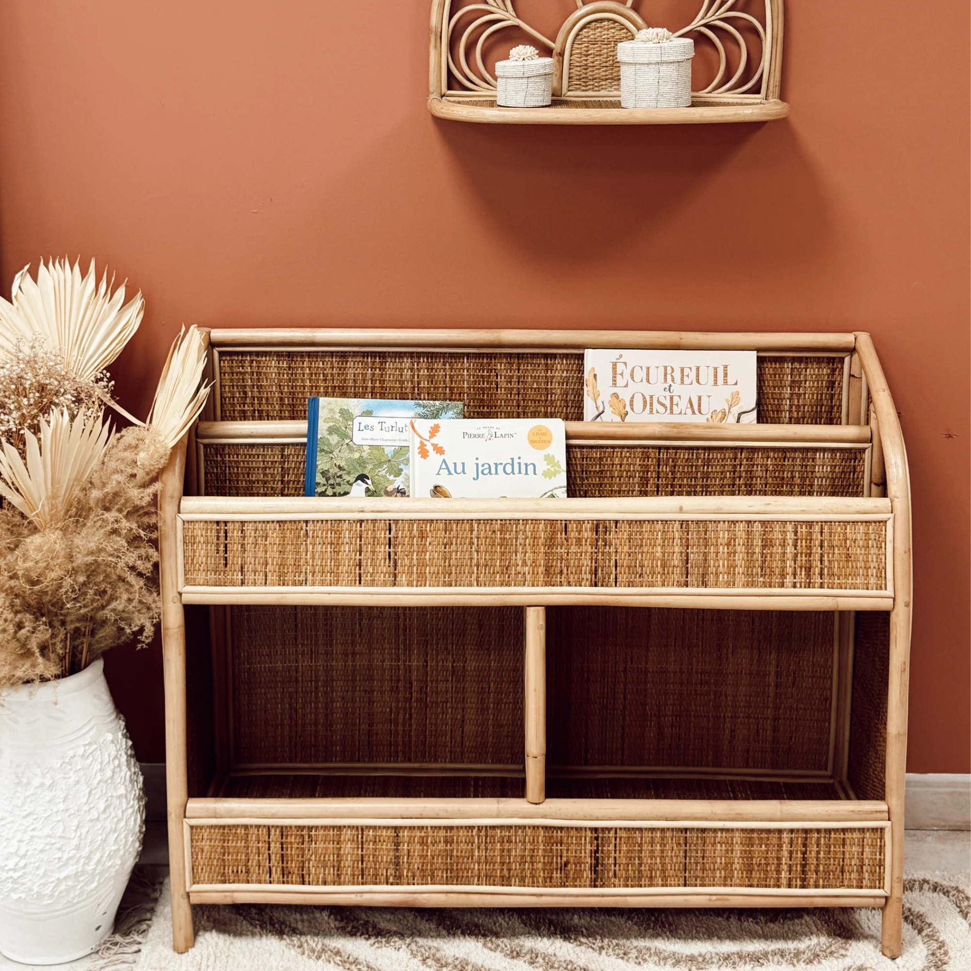 Inspirée du mobilier vintage des années 70, la bibliothèque Gili offre une solution de rangement esthétique et naturelle pour une chambre d’enfant ou un salon bohème. Sa structure courbée et ses niches ouvertes permettent d’organiser livres, jouets ou objets déco avec style.