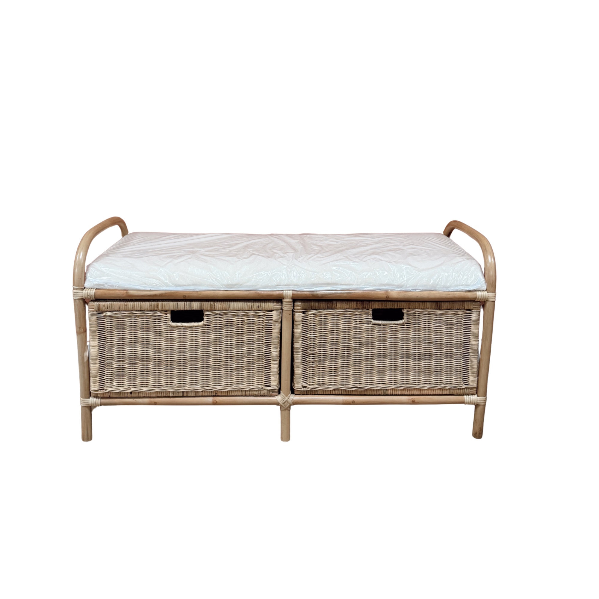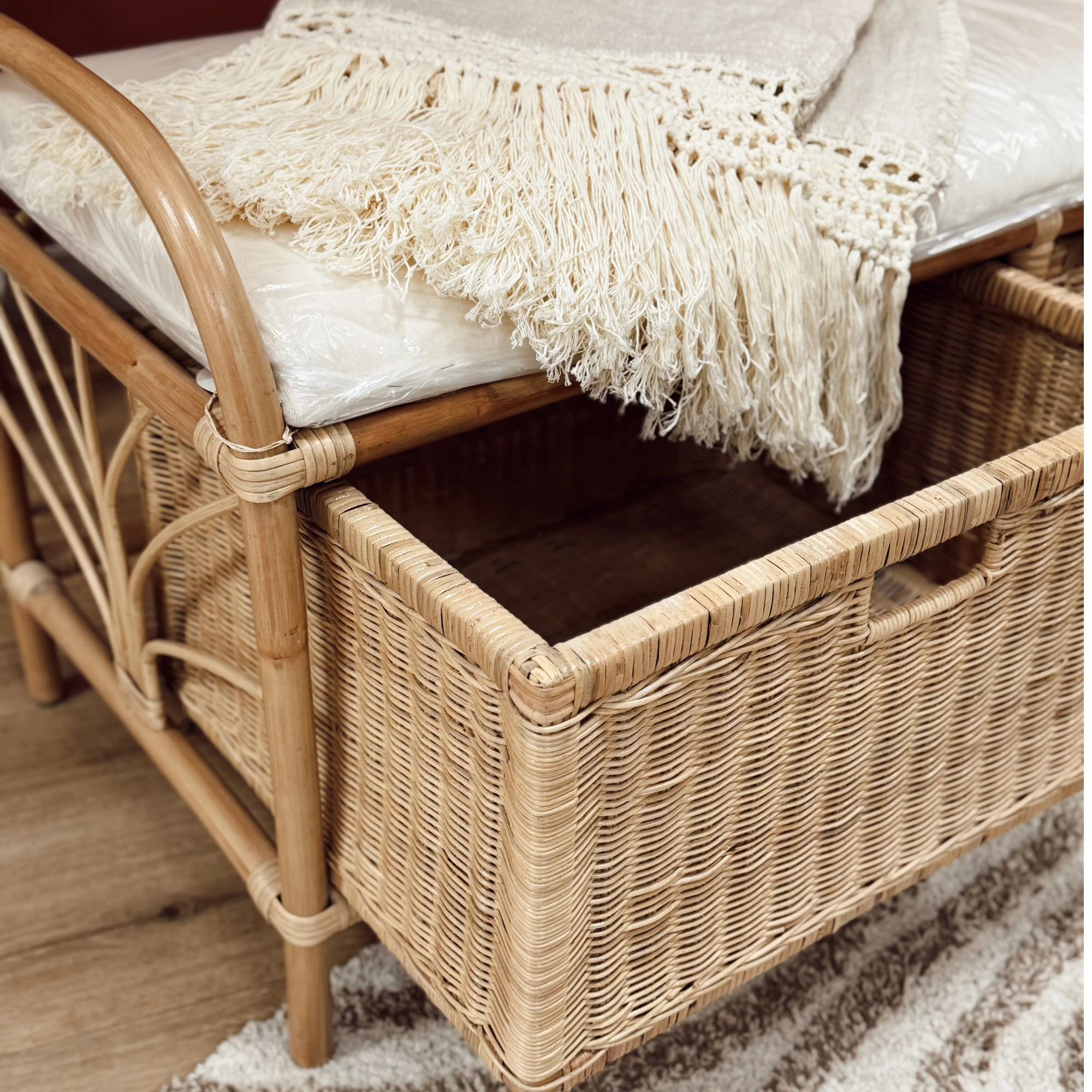 Banc en rotin avec tiroirs et coussin