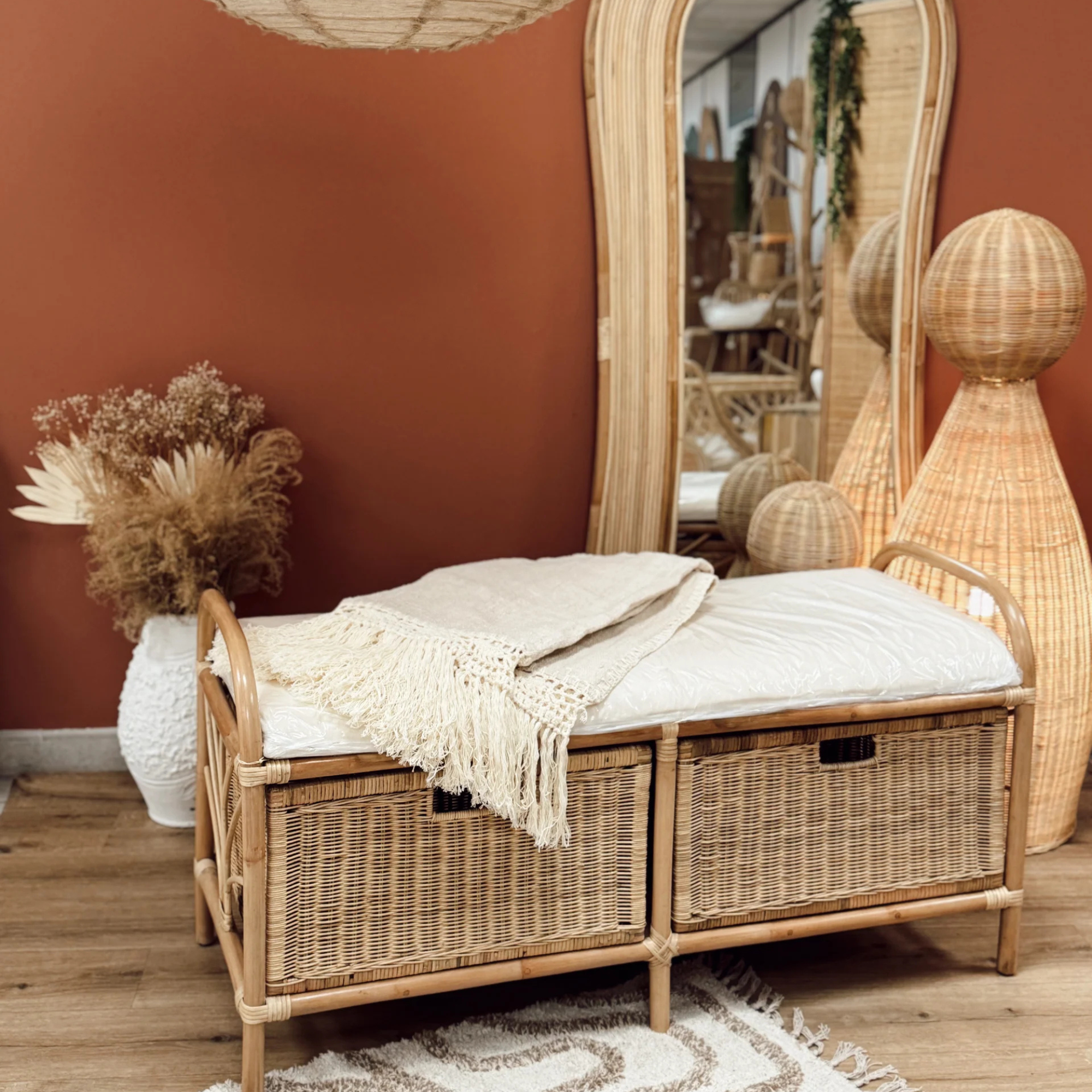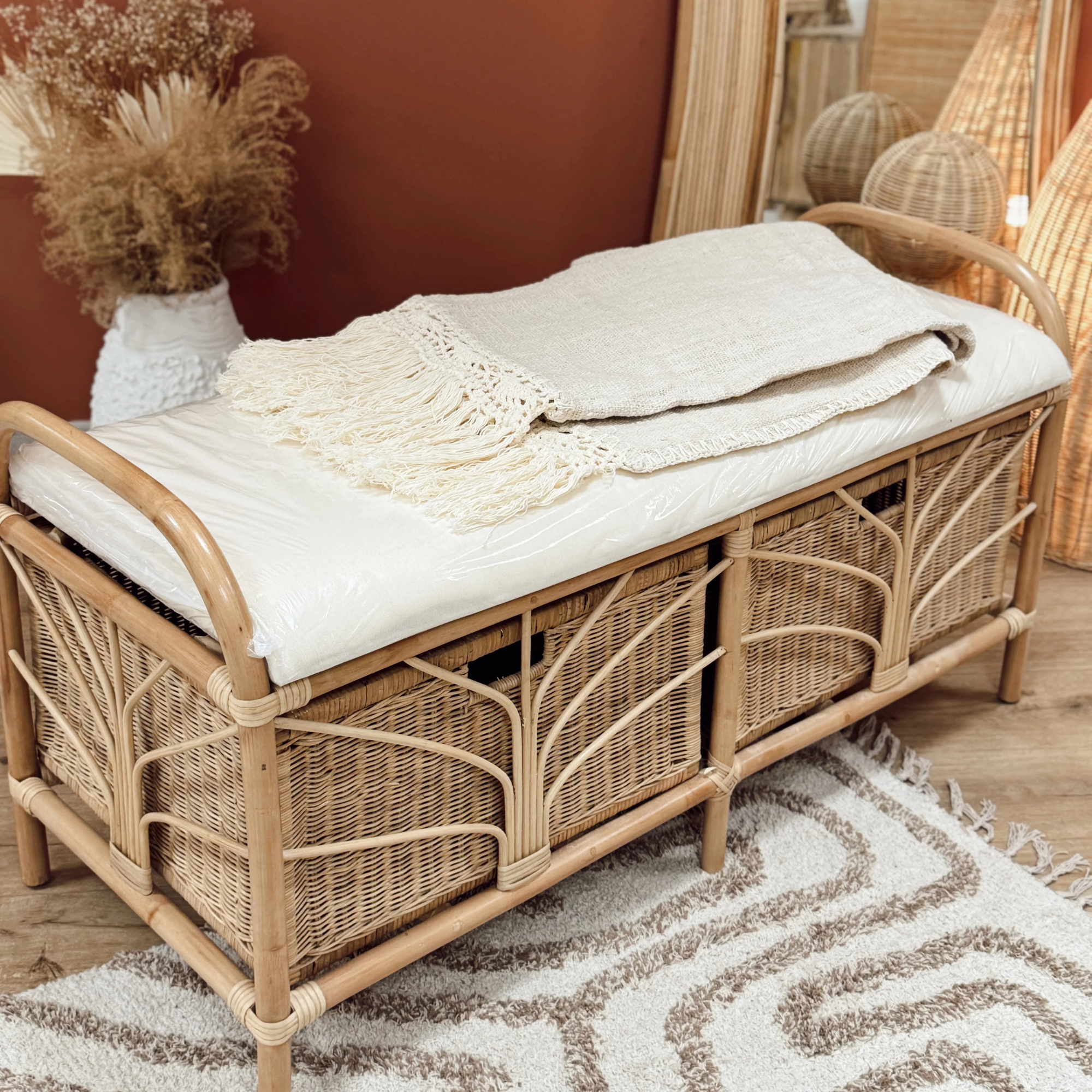 Un banc pratique et bohème en rotin, avec tiroirs de rangement intégrés et coussin pour plus de confort. Parfait pour l’entrée, la chambre ou le salon.