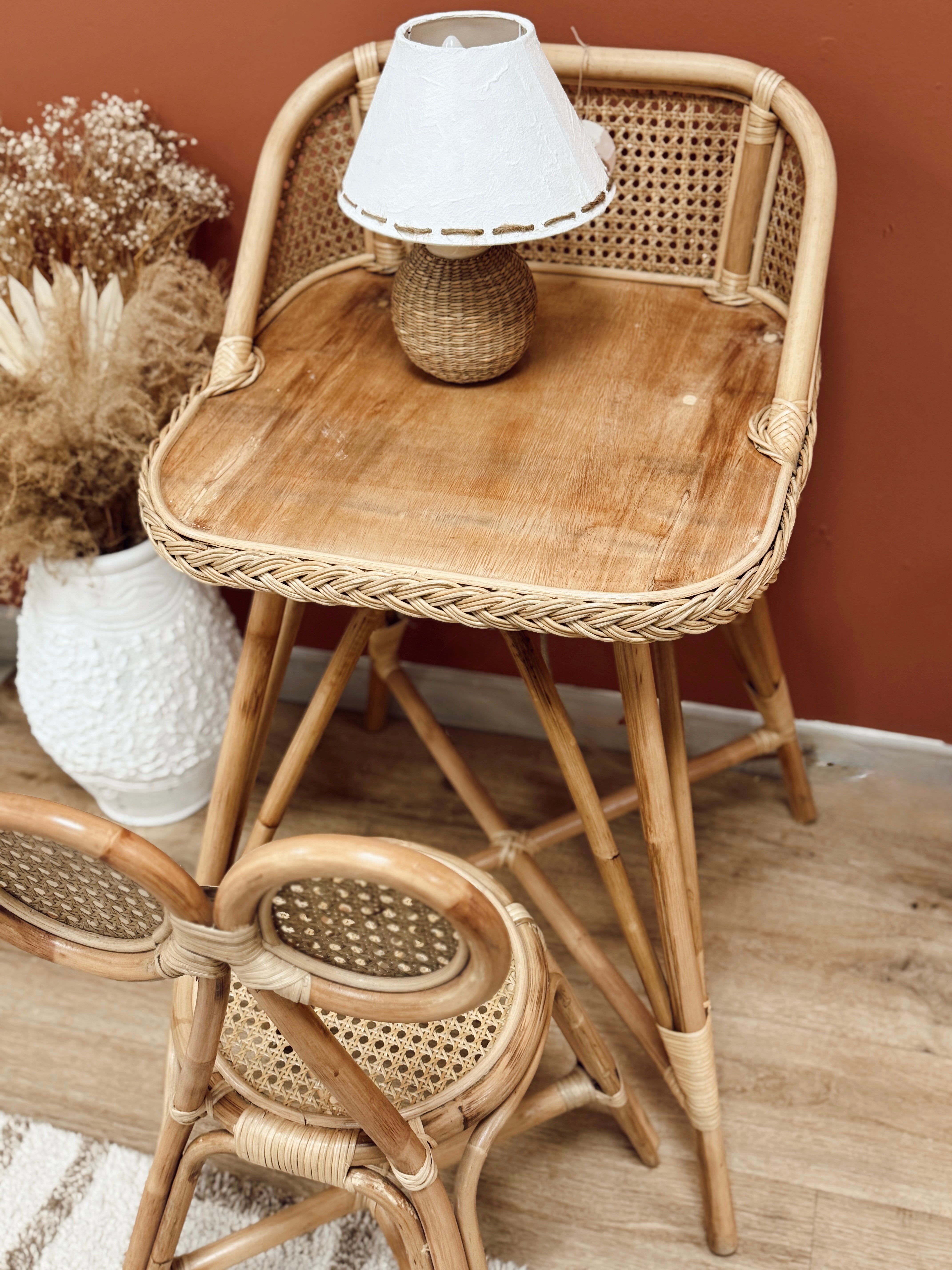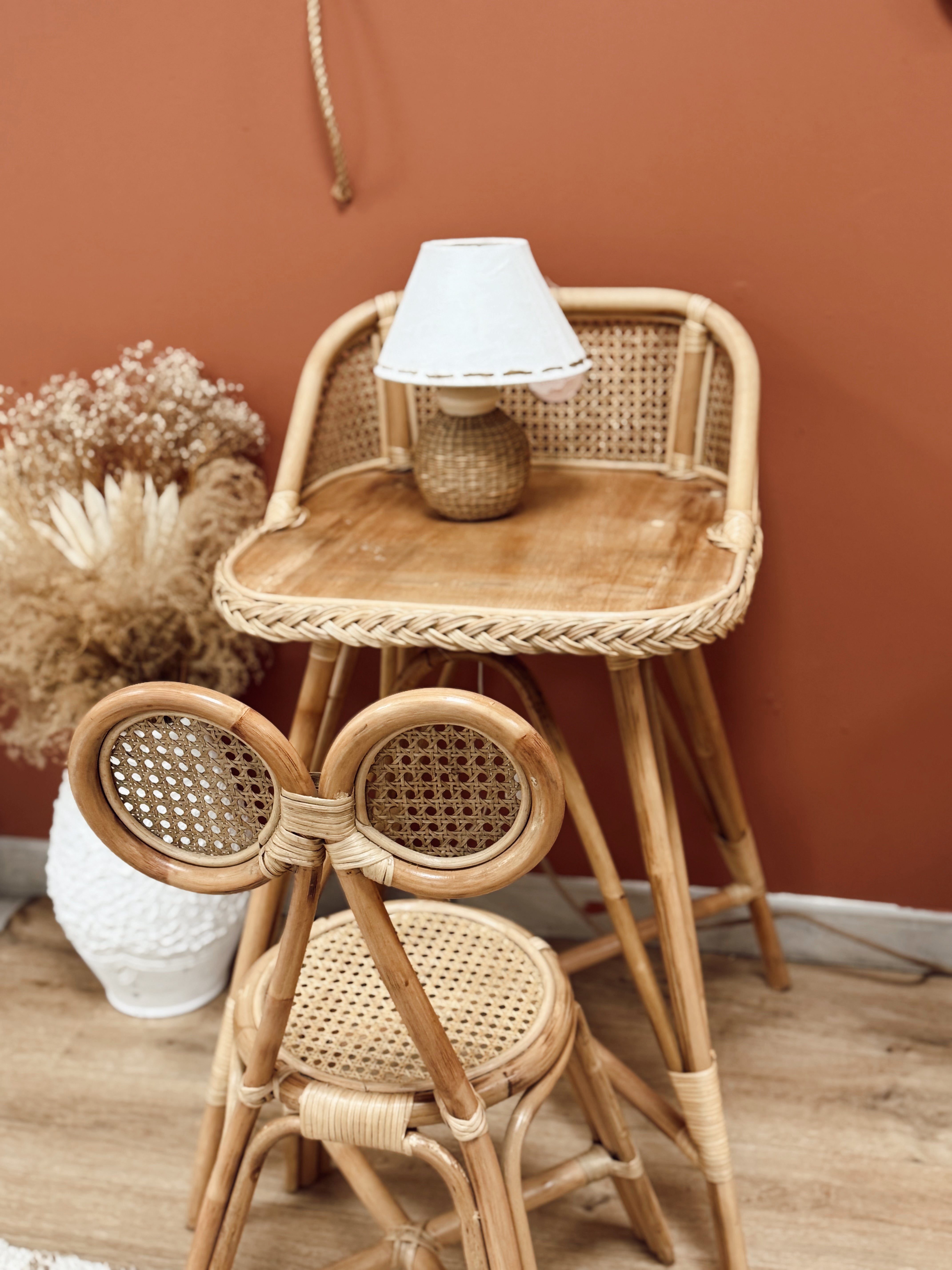 Fabriqué à la main à Bali, l’ensemble GILI se compose d’un bureau aux jolis rebords tressés et d’une chaise en rotin cannage, au design ludique en forme de lunettes rondes.